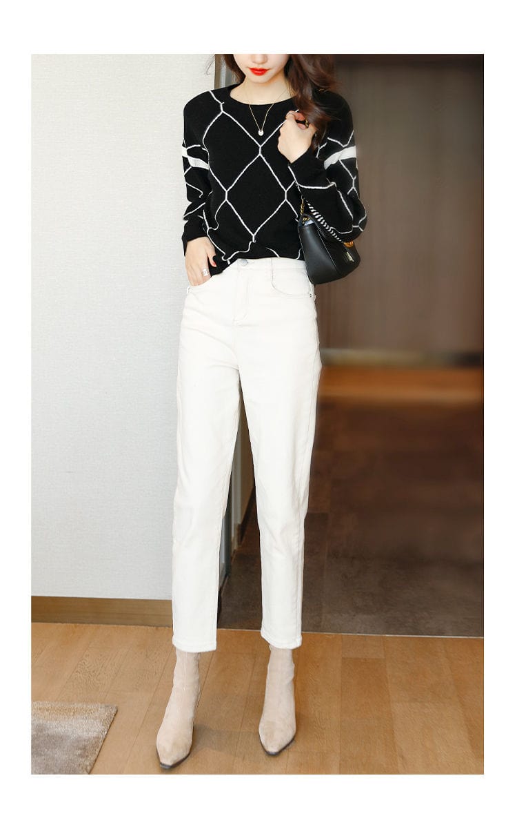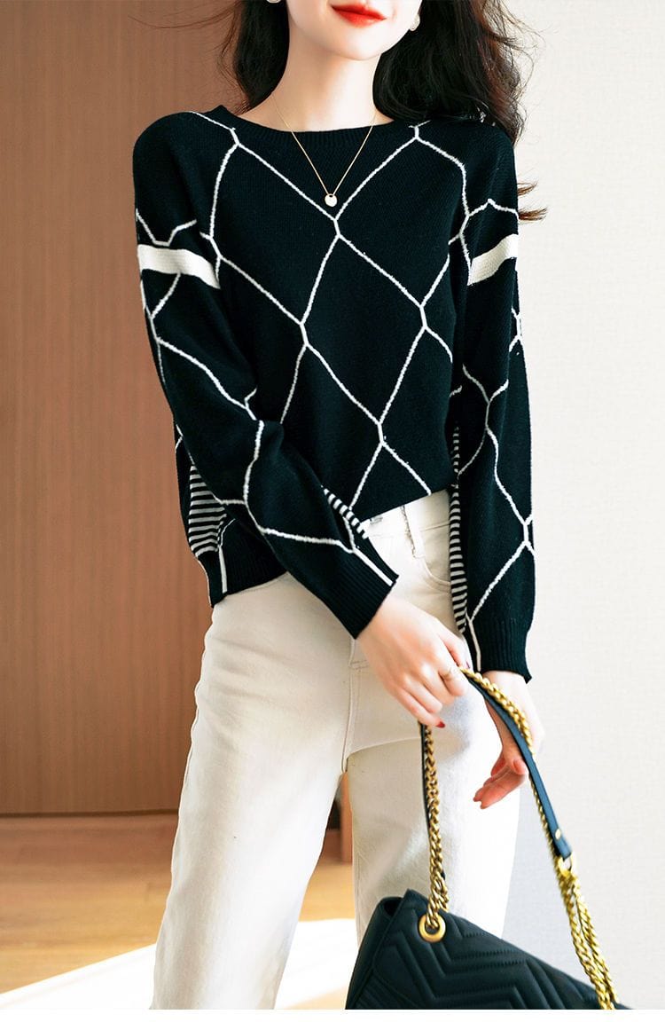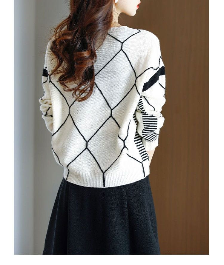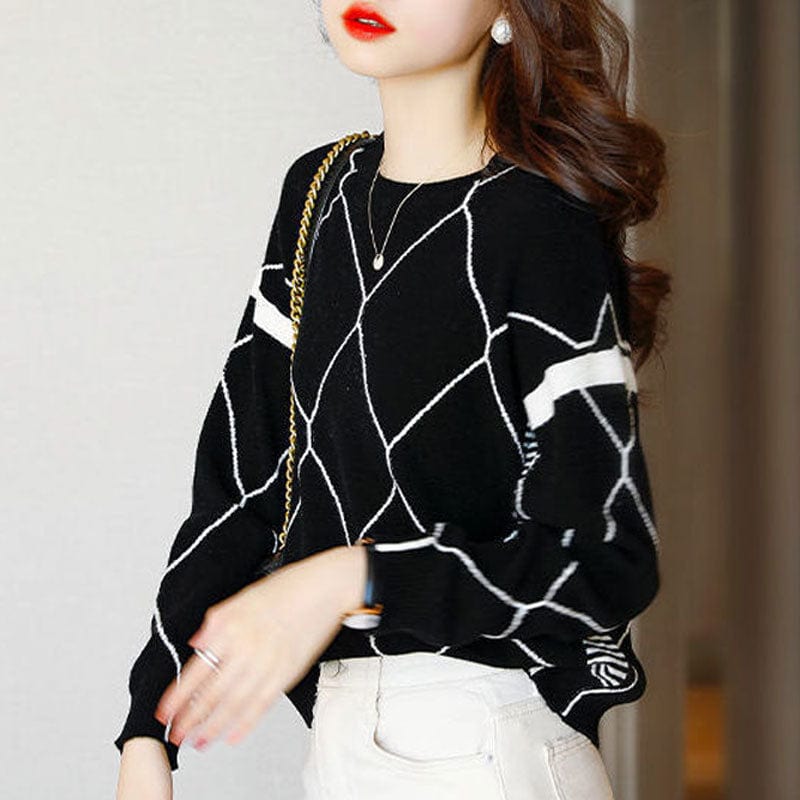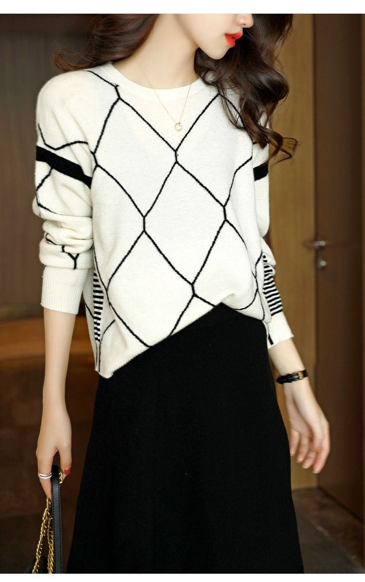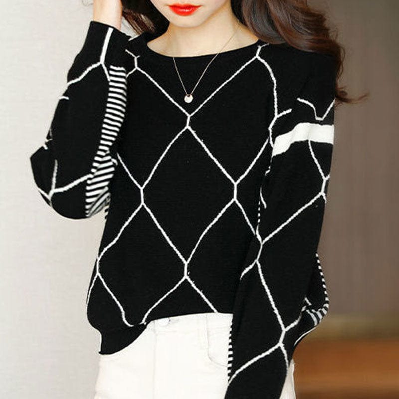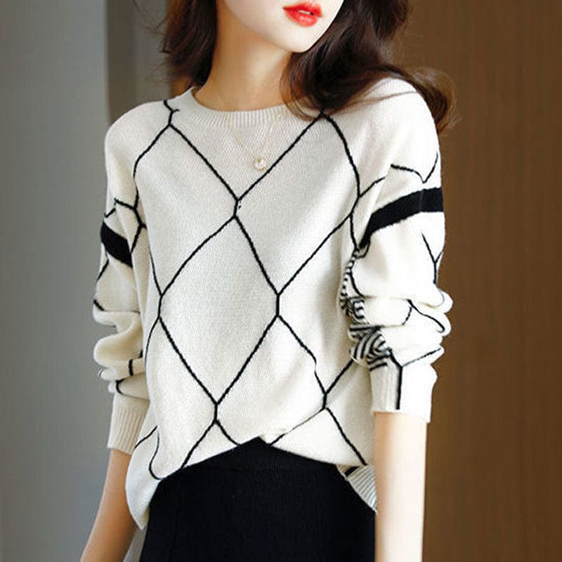 Entdecken Sie den CHANTAL - Pullover mit kontrastfarbenem Karomuster! Mit seinem eleganten geometrischen Design wertet dieser weiche, gestrickte Pullover jeden Look auf. Das moderne schwarze Diamantmuster macht ihn zum perfekten Begleiter für entspannte Tage oder gemütliche Abende. Vielseitig und stylisch, lässt sich dieser Pullover mühelos zu Jeans oder Hosen kombinieren und bringt sowohl Komfort als auch Stil in Ihre Garderobe. Genießen Sie den klassischen Rundhalsausschnitt und die modischen Streifen an den Ärmeln, die diesem zeitlosen Stück eine besondere Note verleihen.