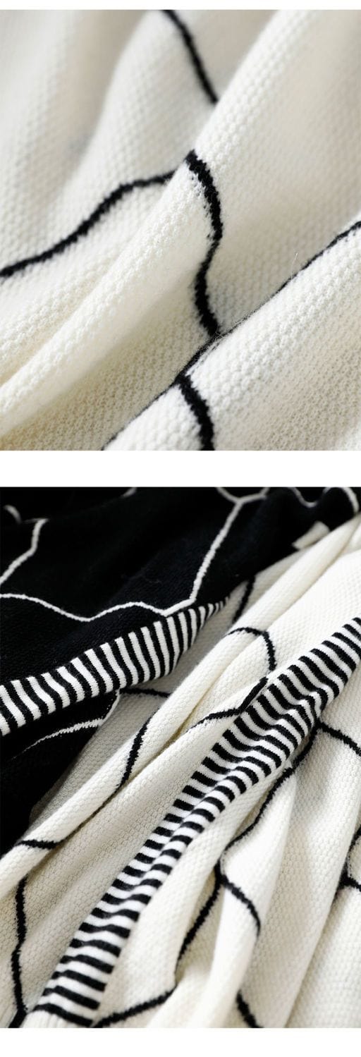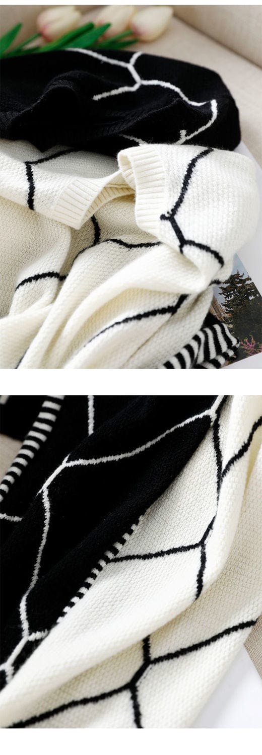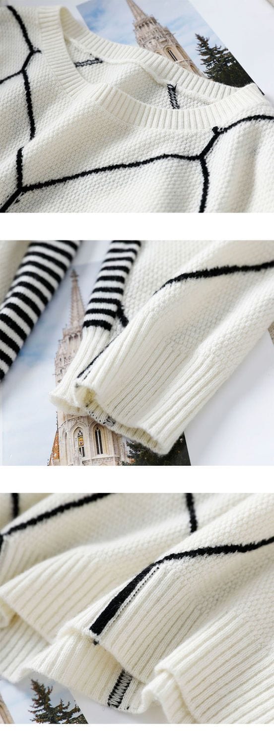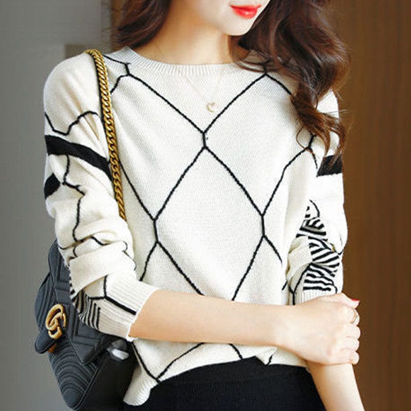 Der Pullover ist aus weichem, hochwertigem Strickmaterial gefertigt, das für überragenden Komfort sorgt. Das schwarze geometrische Muster aus kleinen, miteinander verbundenen Rauten verleiht dem Pullover eine moderne und trendige Ausstrahlung. Die langen Ärmel sind am oberen Saum mit schwarzen Streifen versehen, während der Kragen des Pullovers mit dünnen schwarzen Streifen betont wird. Dieser Pullover ist die ideale Wahl für einen casual Look oder für gemütliche Abende zu Hause.