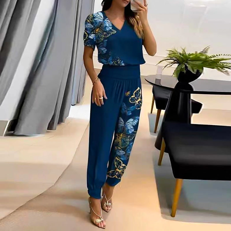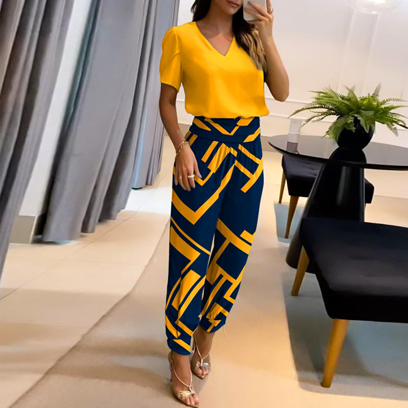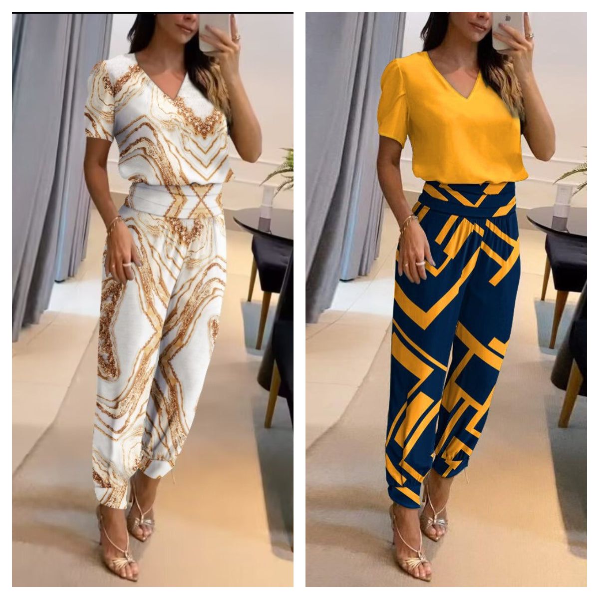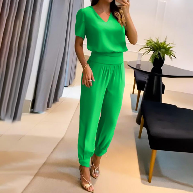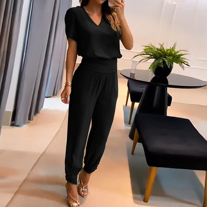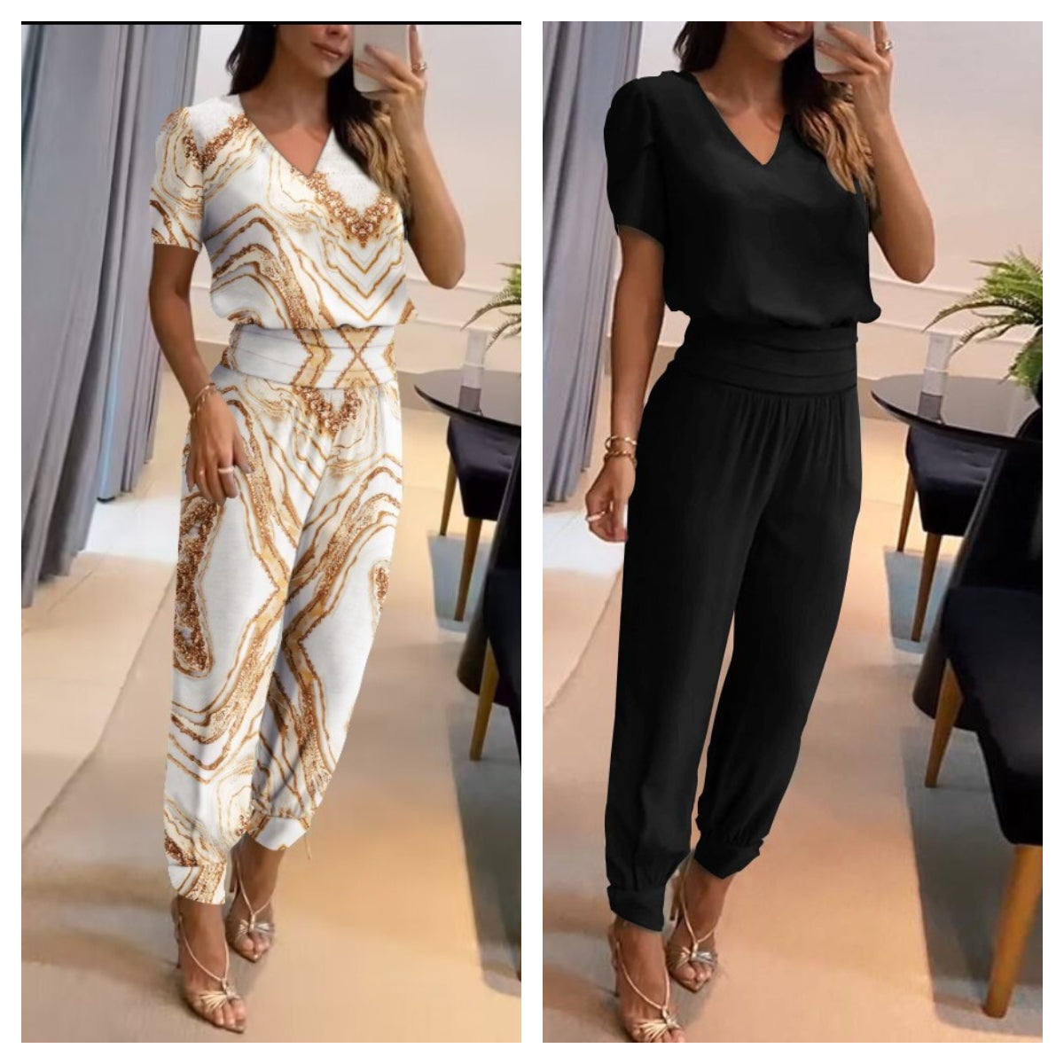 Entdecken Sie die perfekte Mischung aus Komfort und Stil mit unserem zweiteiligen Relaxed Set, bestehend aus einem kurzärmligen Oberteil mit V-Ausschnitt und einer langen Hose!