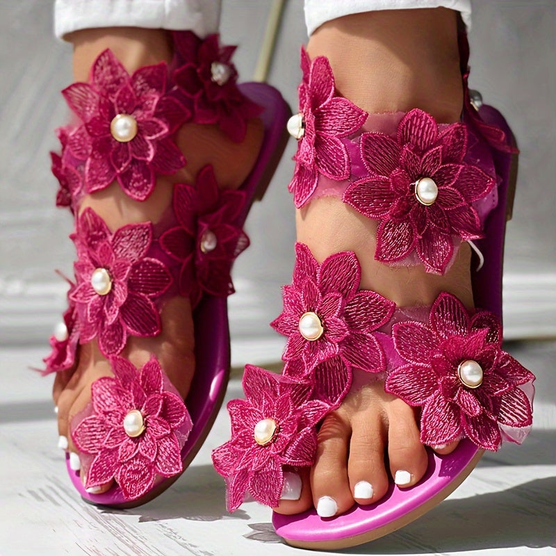 Verleihen Sie Ihrem Sommer-Look mit diesen eleganten Blumen Flatsandalen das gewisse Etwas. Erhältlich in mehreren Farben, bieten diese Slip-On Sandalen mit Perlen und Zehenriemen Komfort und Stil für jeden Anlass.