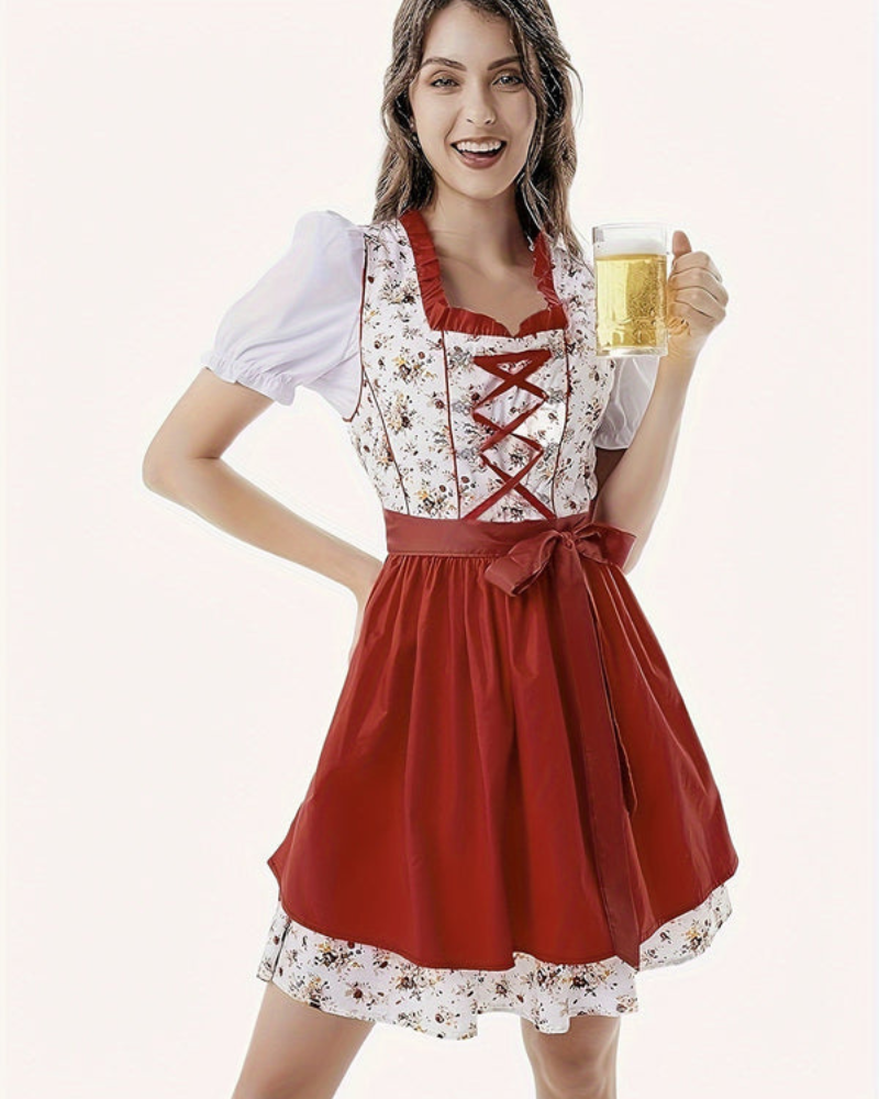 Dieses Dirndlkleid bringt klassische Linien mit einem floralen Muster in Einklang. Das Mieder mit Schnürung, die gebundene Schürze und die ausgestellte Silhouette sorgen für einen traditionellen Auftritt mit saisonalem Charakter – getragen bei Volksfesten, Familienanlässen oder Themenfeiern.