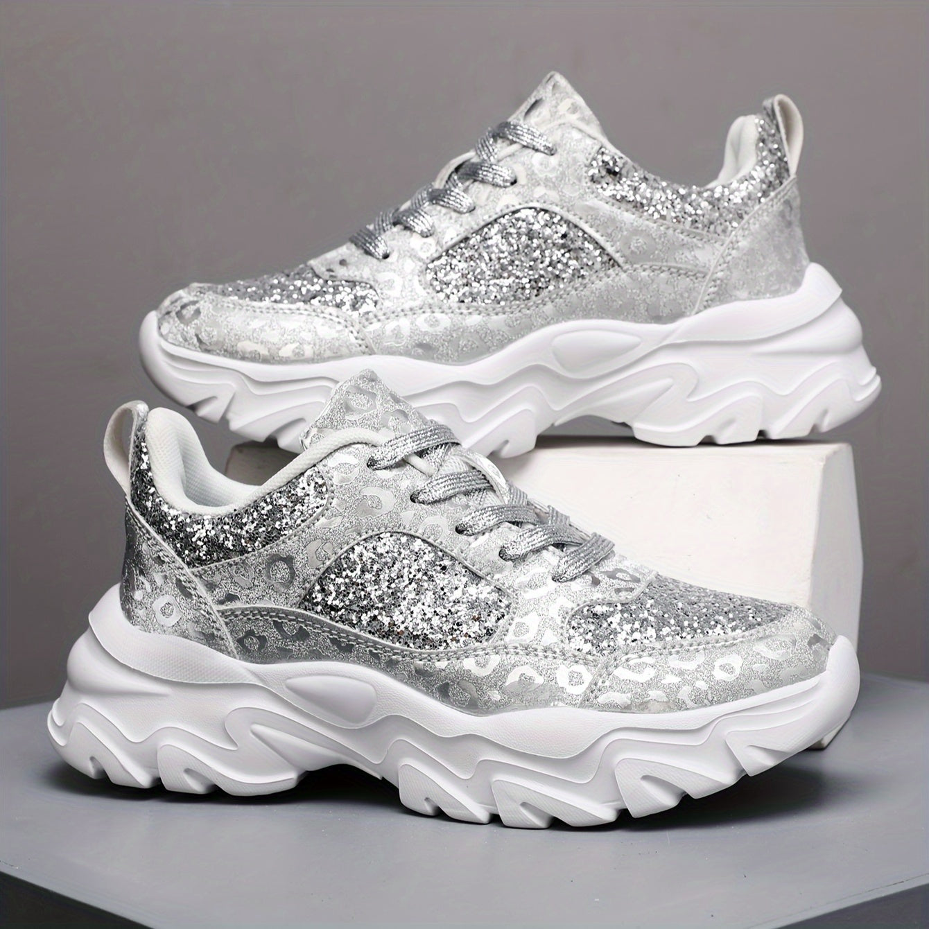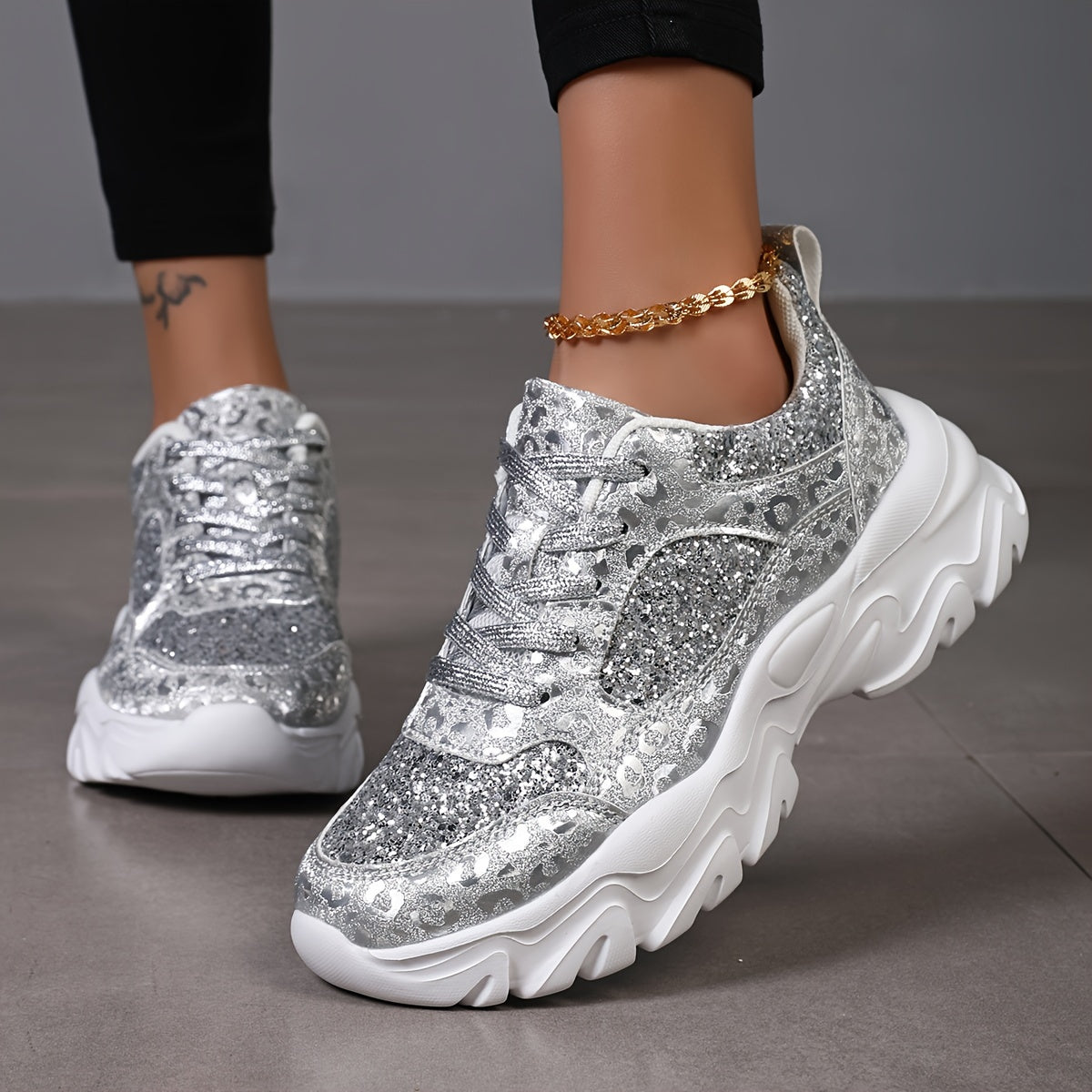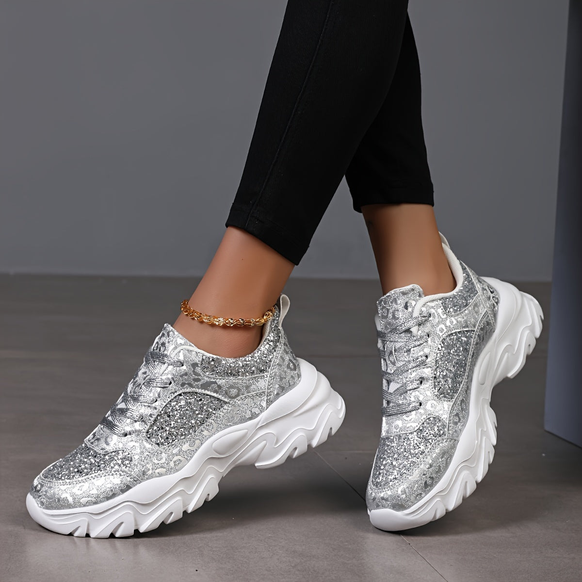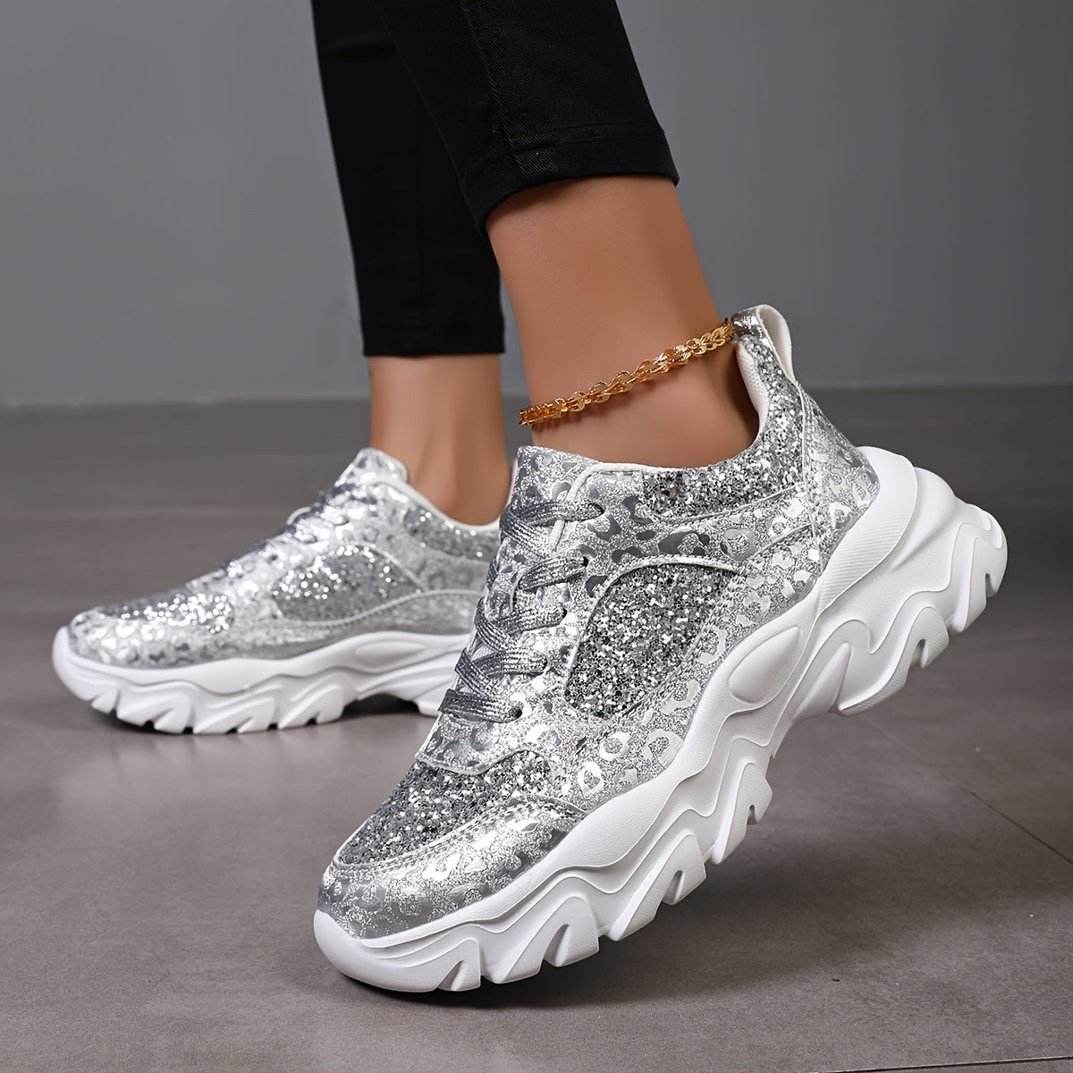 Damen Glitzer-Loafer – Silberne Slip-On Schuhe mit Plateau-Sohle