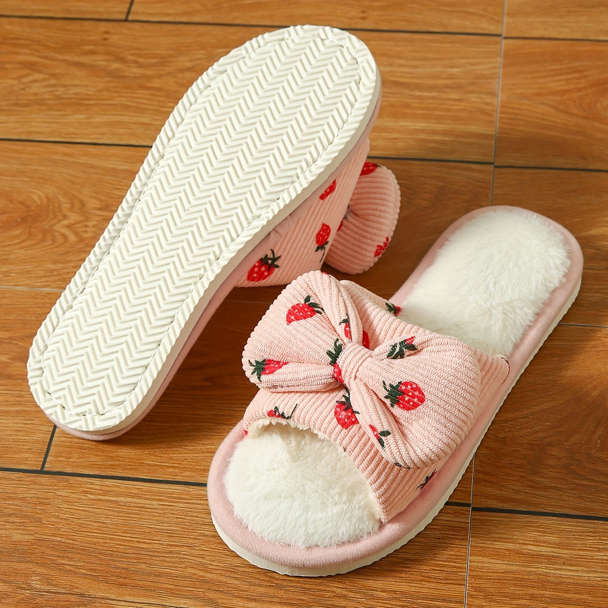 Damen Hausschuhe – Leichte, Weiche Slippers mit Erdbeer-Schleife & Plüschfutter