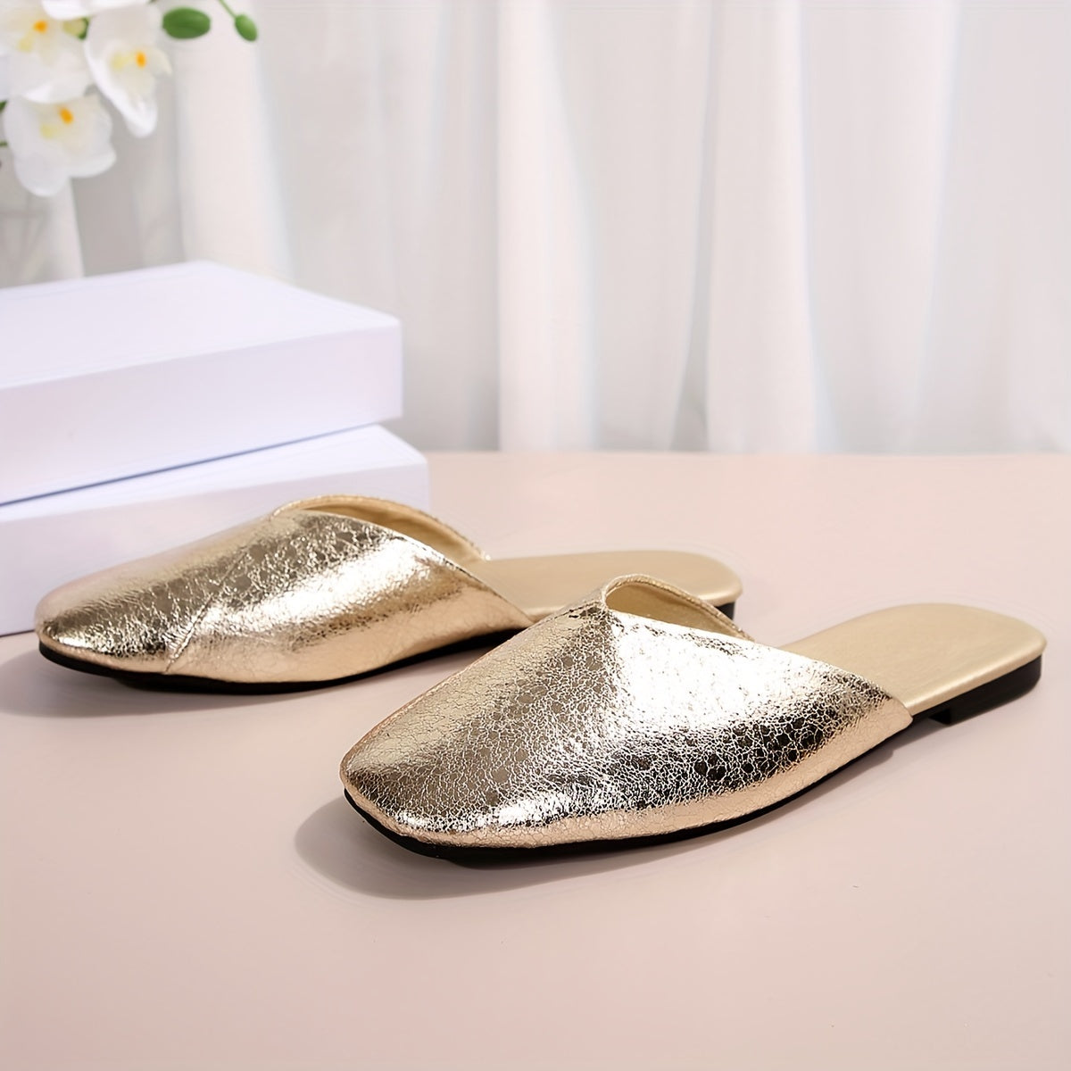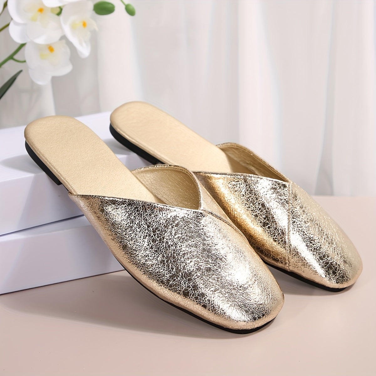 Damen Retro-Flache Mules, Goldene Slip-On Loafer mit Gummisohle