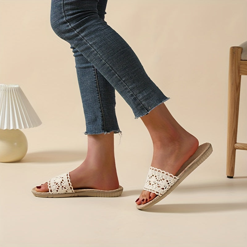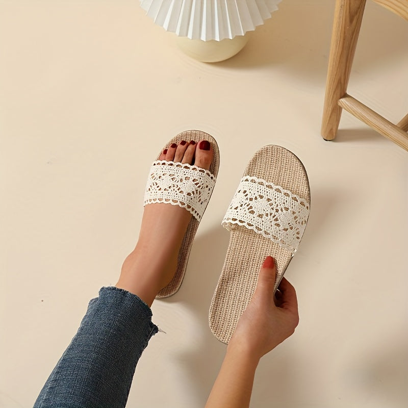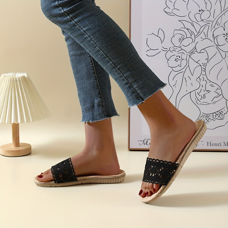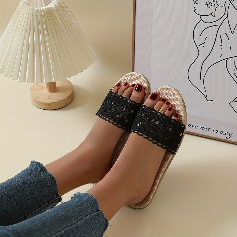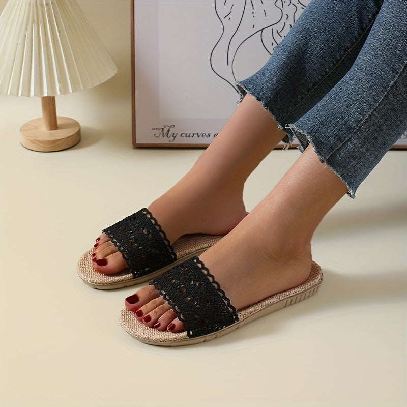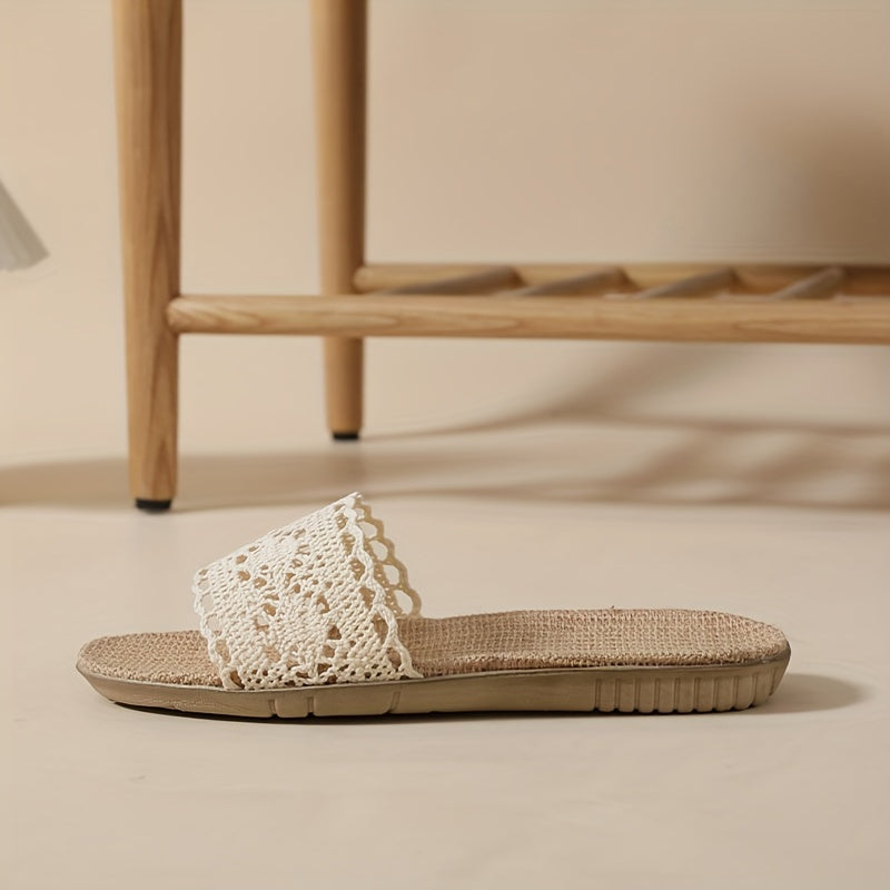 Damen Sommer Slipper – Atmungsaktive Leinen-Slides mit Spitze, Rutschfest & Bequem