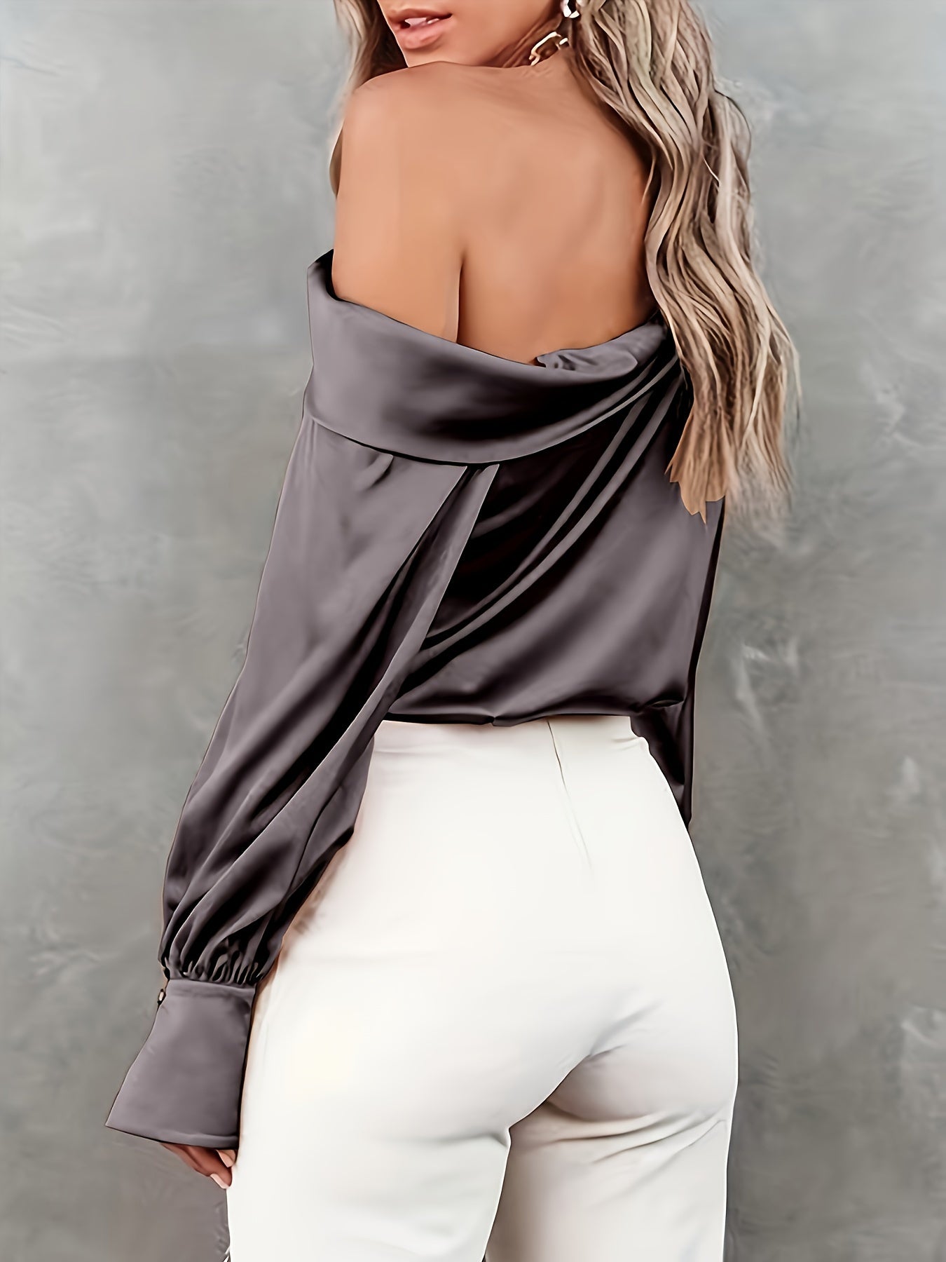 Elegantes Damenhemd mit Asymmetrischem Ausschnitt – Einfarbig, Langarm, Atemberaubend