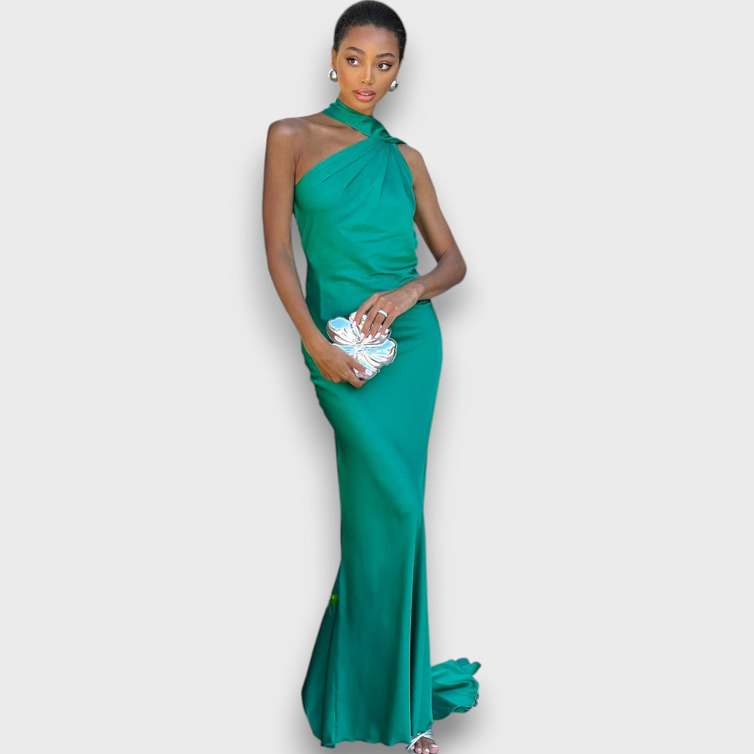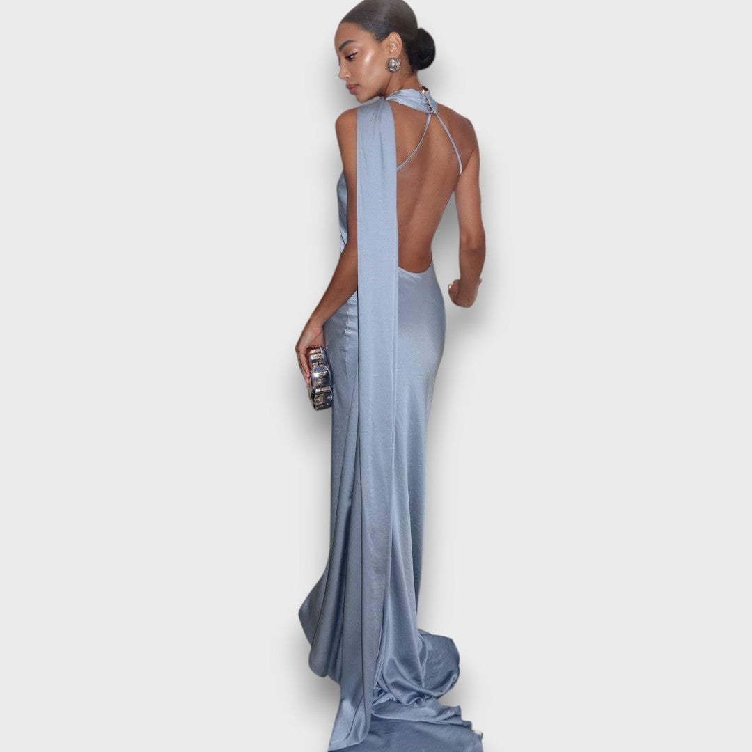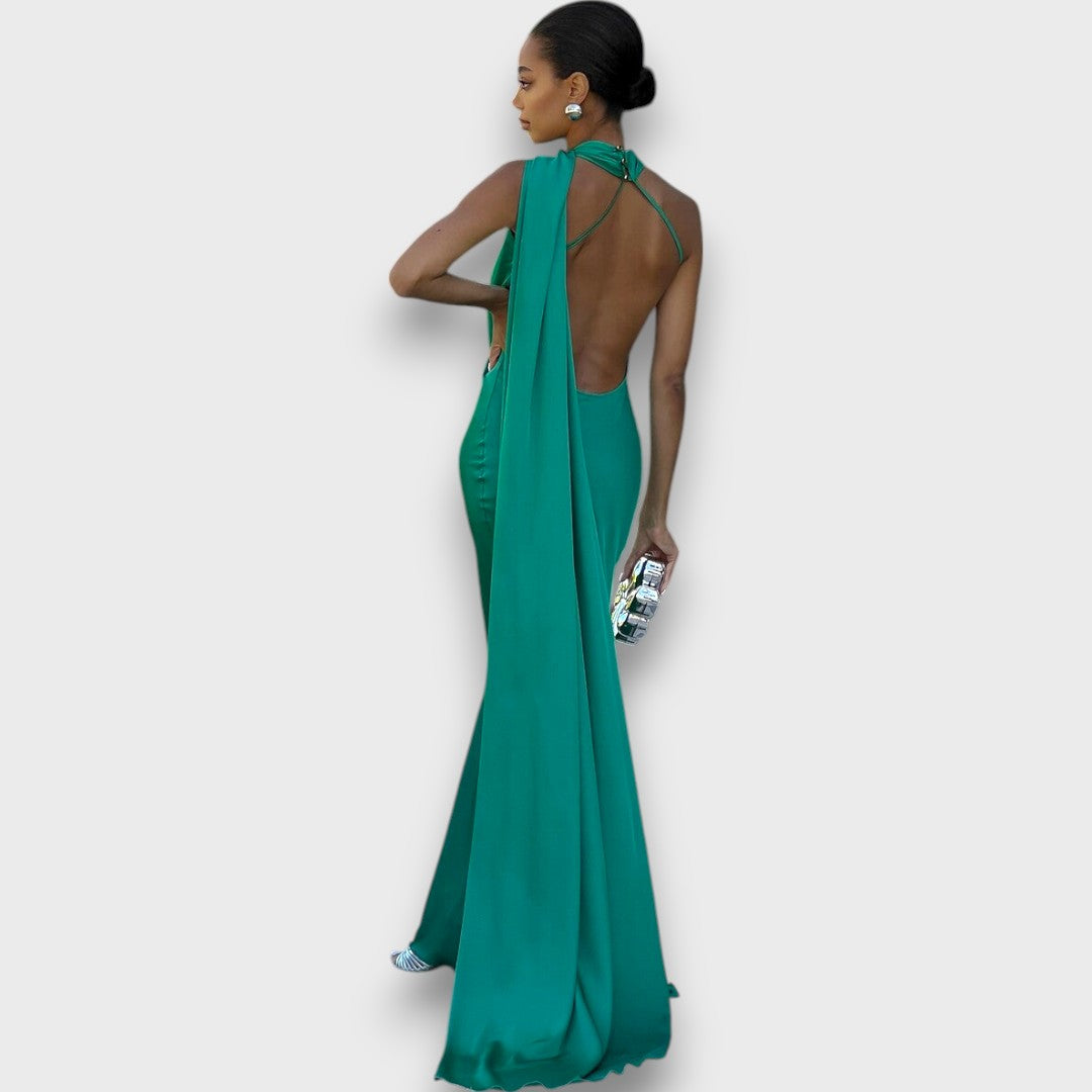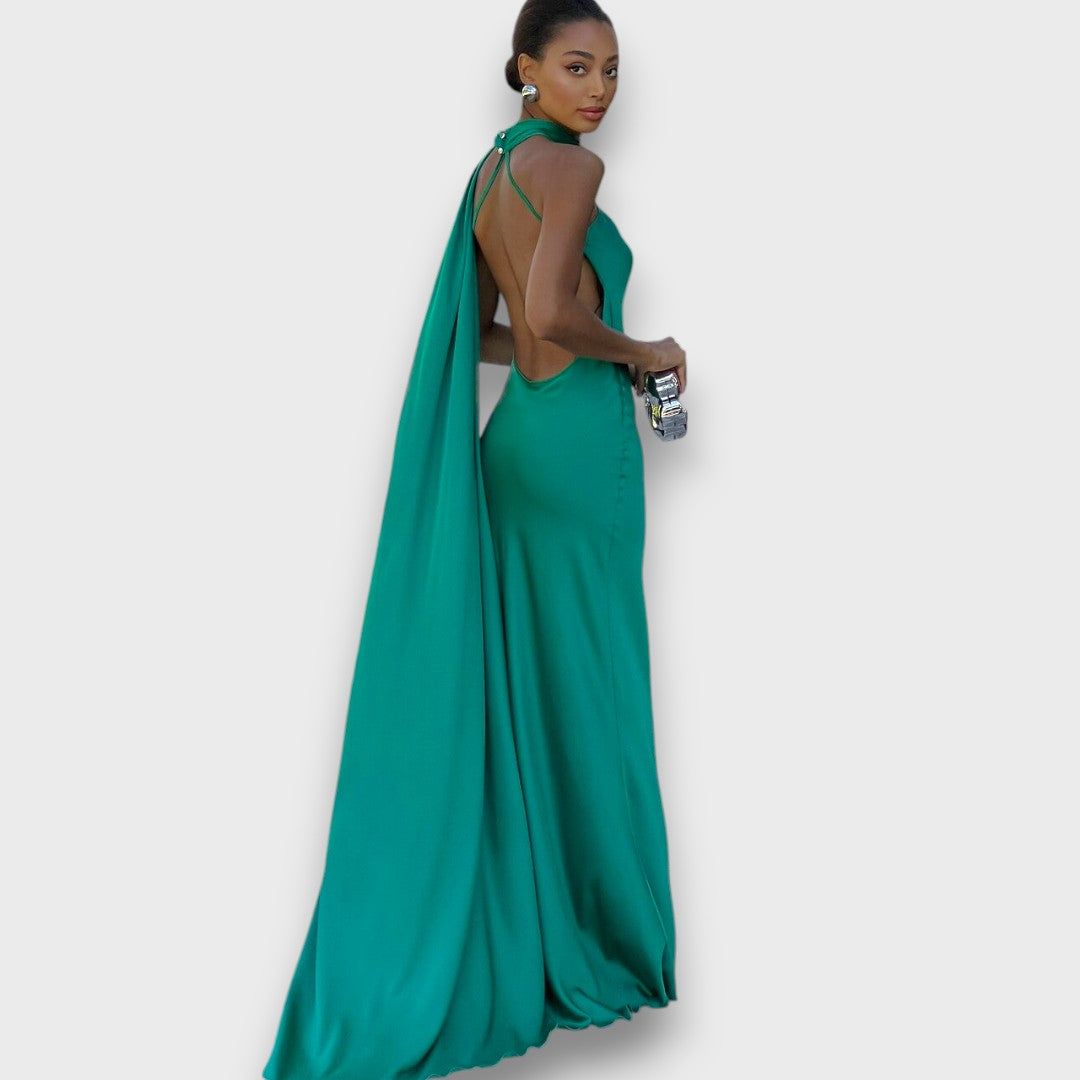 Cape-Effekt mit Eleganz – das fließende Rückendetail verleiht dem Kleid eine dramatisch-sanfte Bewegung