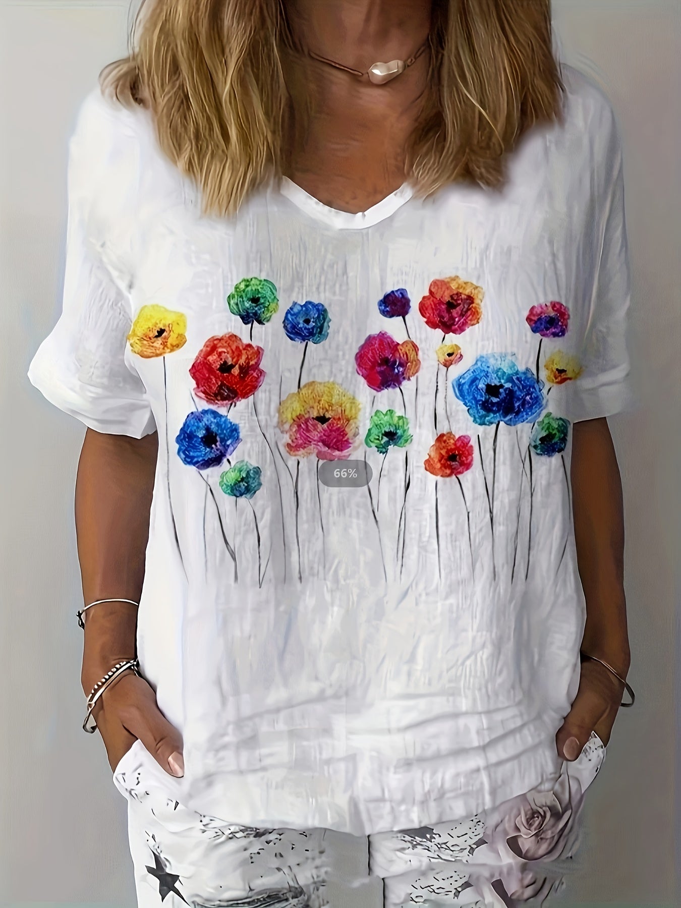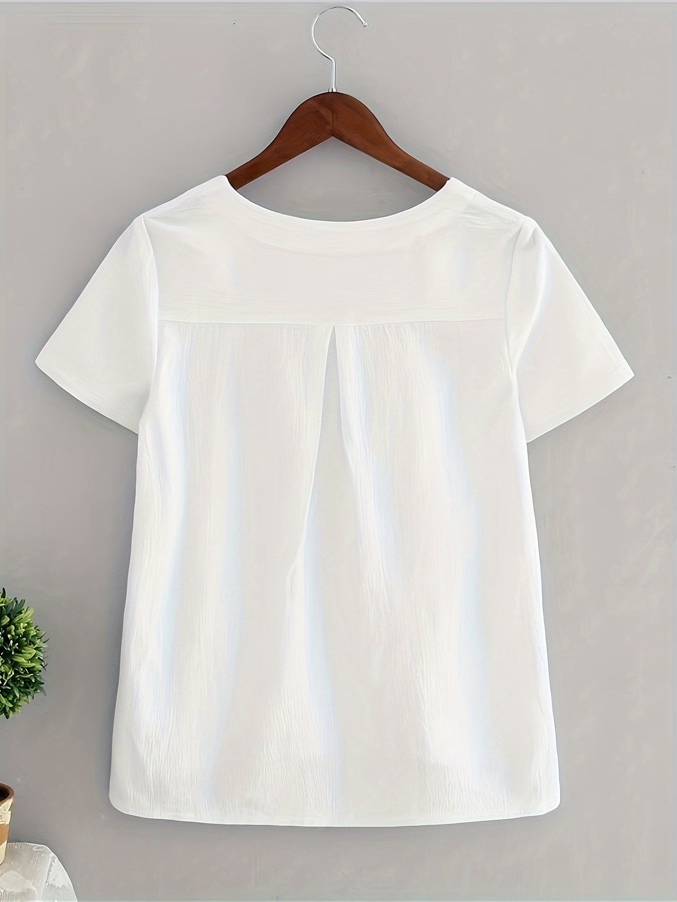 Floral Applique Linen T-Shirt für Damen, V-Ausschnitt, Weiß Ganzjährig
