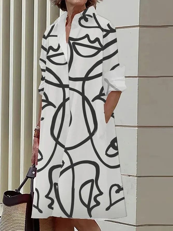 Dieses Kleid besteht aus den hochwertigsten Materialien. Eine stilvolle Midi-Kleiderlänge verleiht Ihrem Outfit einen trendigen Touch. Es ist mit einzigartigen Druckdesigns gestaltet, einem Kragen für einen anspruchsvollen Look, langen Ärmeln, die zusätzliche Abdeckung und Wärme bieten, und Seitentaschen, die es modisch und praktisch machen.