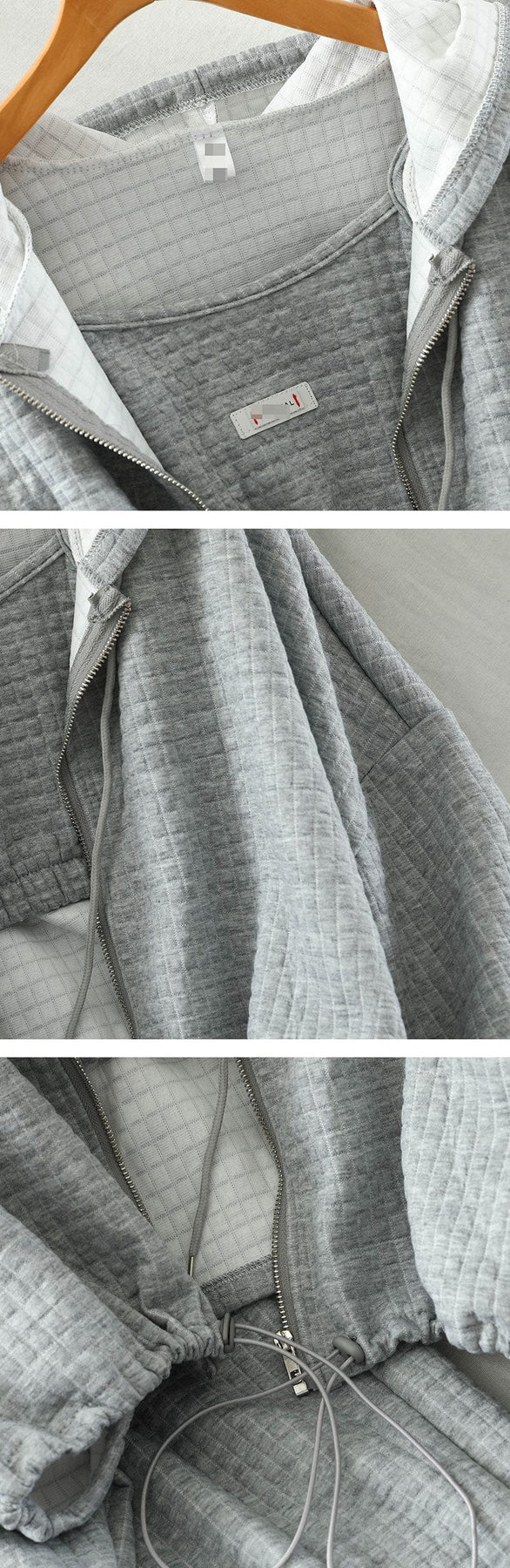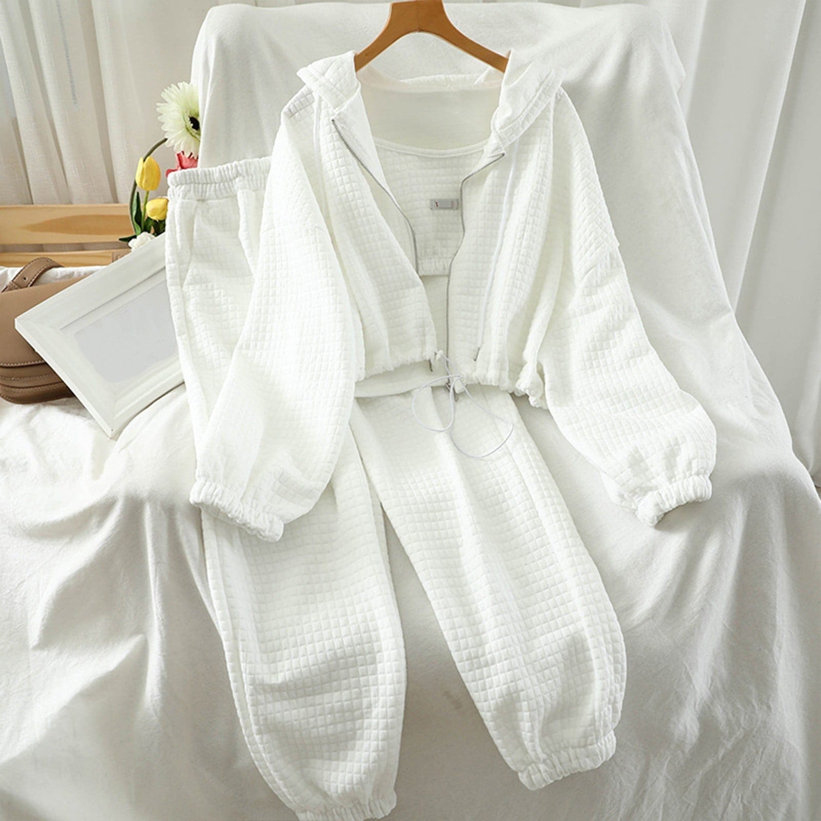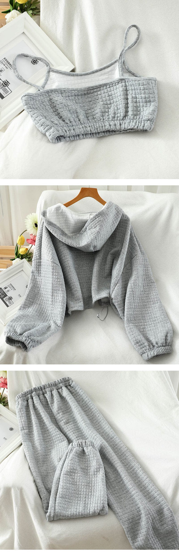 Dieses drei-teilige Set bietet die perfekte Kombination aus Komfort und Stil. Der Sweatshirt verfügt über einen verstellbaren Bund, Reißverschlussdetails und ein Kapuzen-Design, das ärmellose Top passt bequem, und die Hosen haben eine hohe Taille, einen lockeren Schnitt und zwei Seitentaschen. Dieses Set vereint Funktionalität mit modernem Flair und ist ideal für Workouts und Outdoor-Aktivitäten.