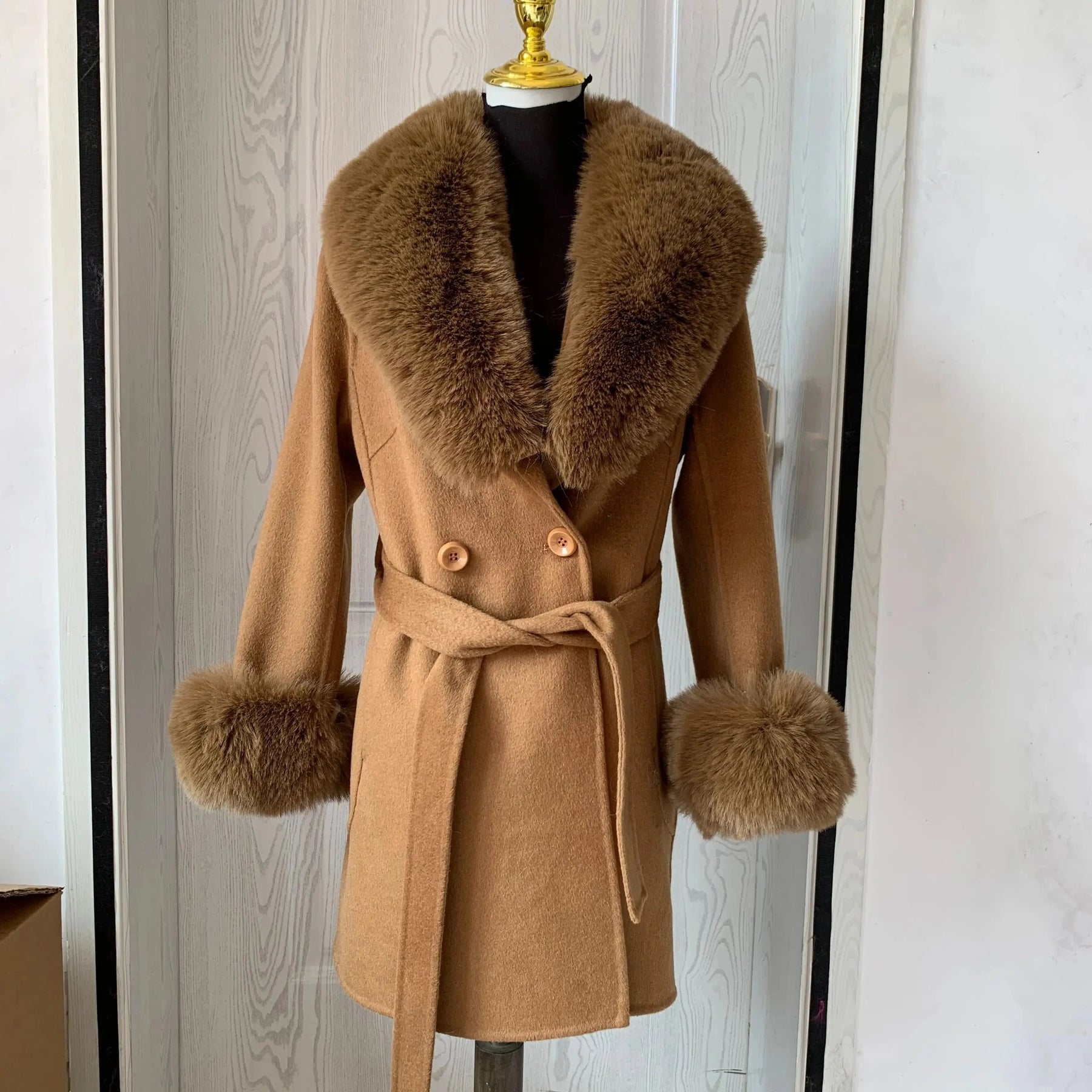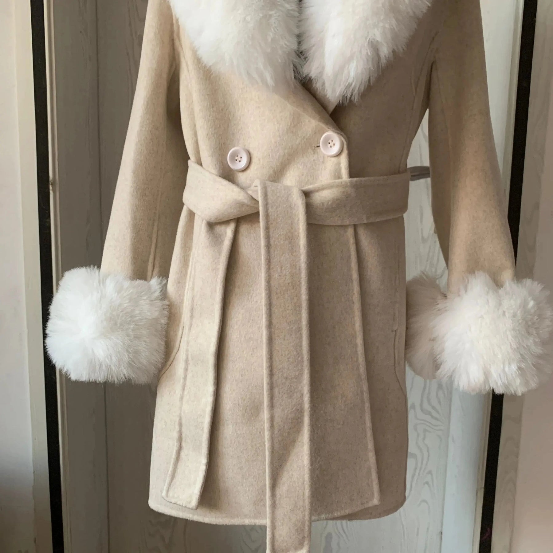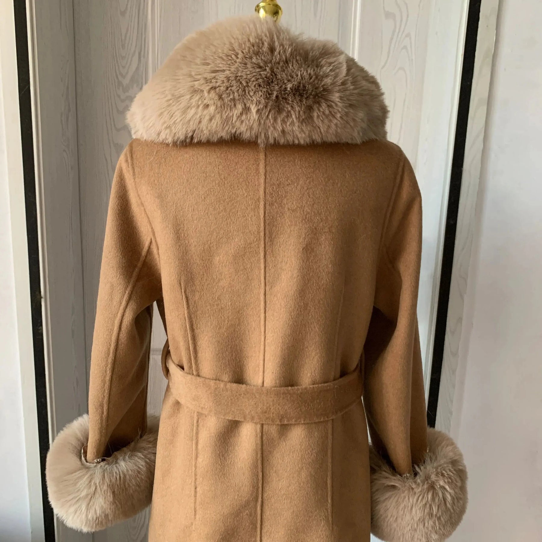 Ein exquisites Gemisch aus 100% Kaschmir und Schurwolle, abnehmbarer, luxuriöser Kunstpelzkragen und -manschetten sowie prächtige Blumenmuster-Goldknöpfe machen dieses Stück einzigartig. Der Gürtel wird Ihre Taille auf elegante Weise betonen und ihr Form und Definition verleihen.