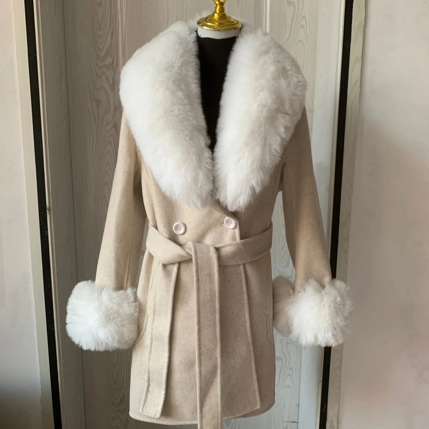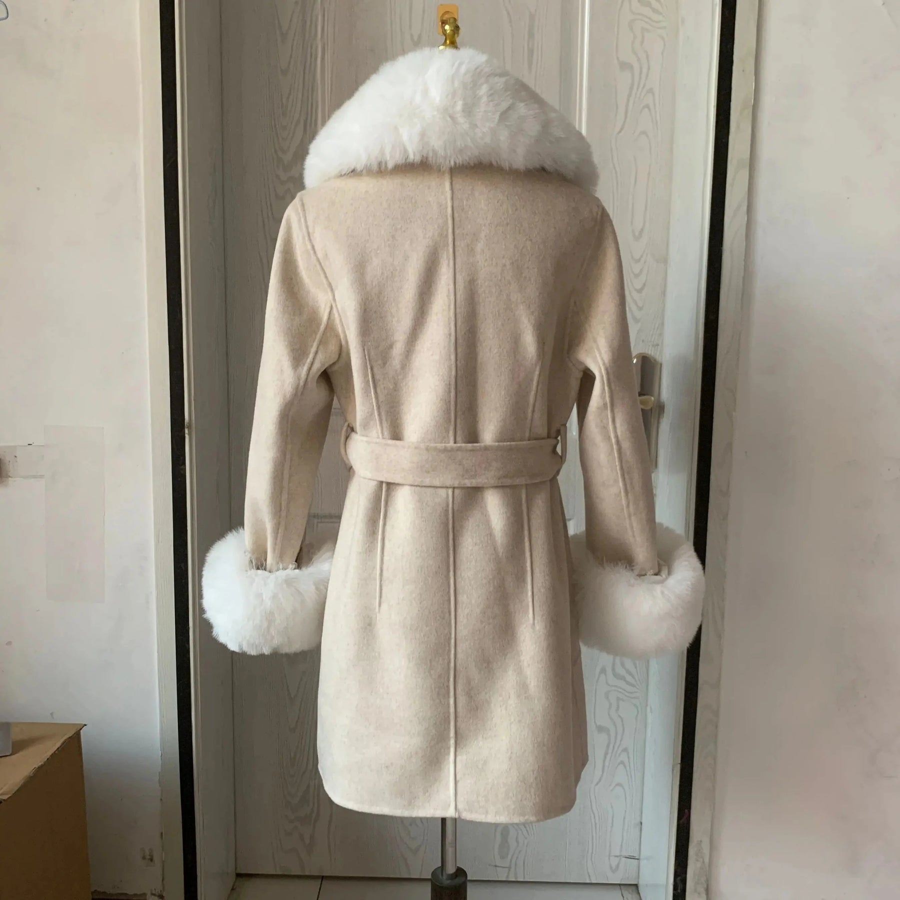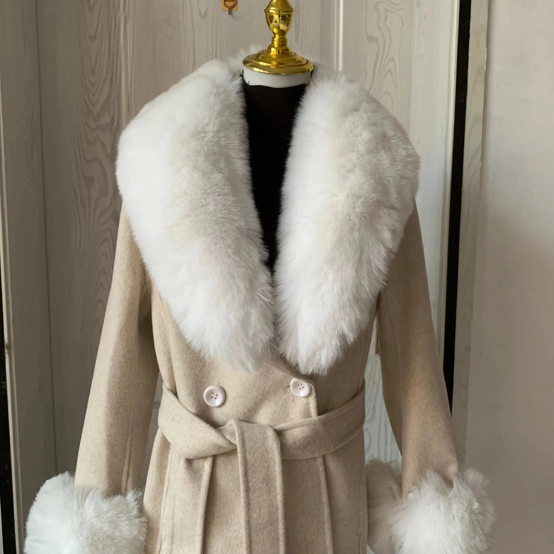 Ein exquisites Gemisch aus 100% Kaschmir und Schurwolle, abnehmbarer, luxuriöser Kunstpelzkragen und -manschetten sowie prächtige Blumenmuster-Goldknöpfe machen dieses Stück einzigartig. Der Gürtel wird Ihre Taille auf elegante Weise betonen und ihr Form und Definition verleihen.