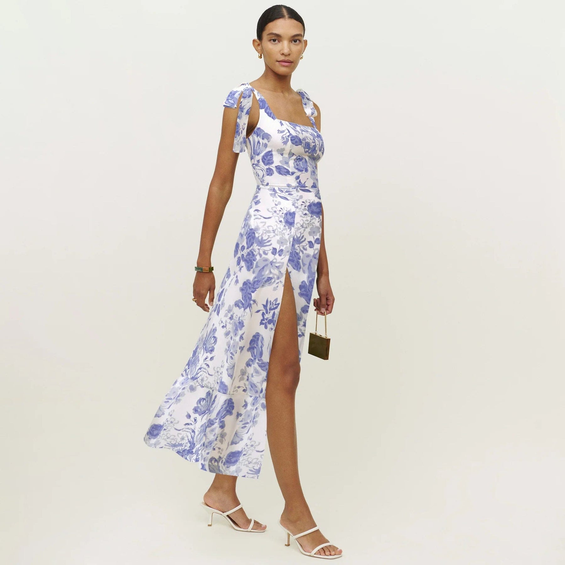 Dieses leuchtende Blumen-Quadrat-Ausschnitt-Midi-Kleid ist voller Charme! Das figurbetonte Oberteil hat einen gerafften Rücken, um die perfekte Passform für verschiedene Büstengrößen zu erreichen, kombiniert mit einem fließenden Midi-Rock und einem seitlichen Schlitz. Kommt mit einem abnehmbaren Taillengürtel sowie abnehmbaren Schleifen für die Träger! Es ist weich, zart, stilvoll, modisch und angenehm zu tragen.