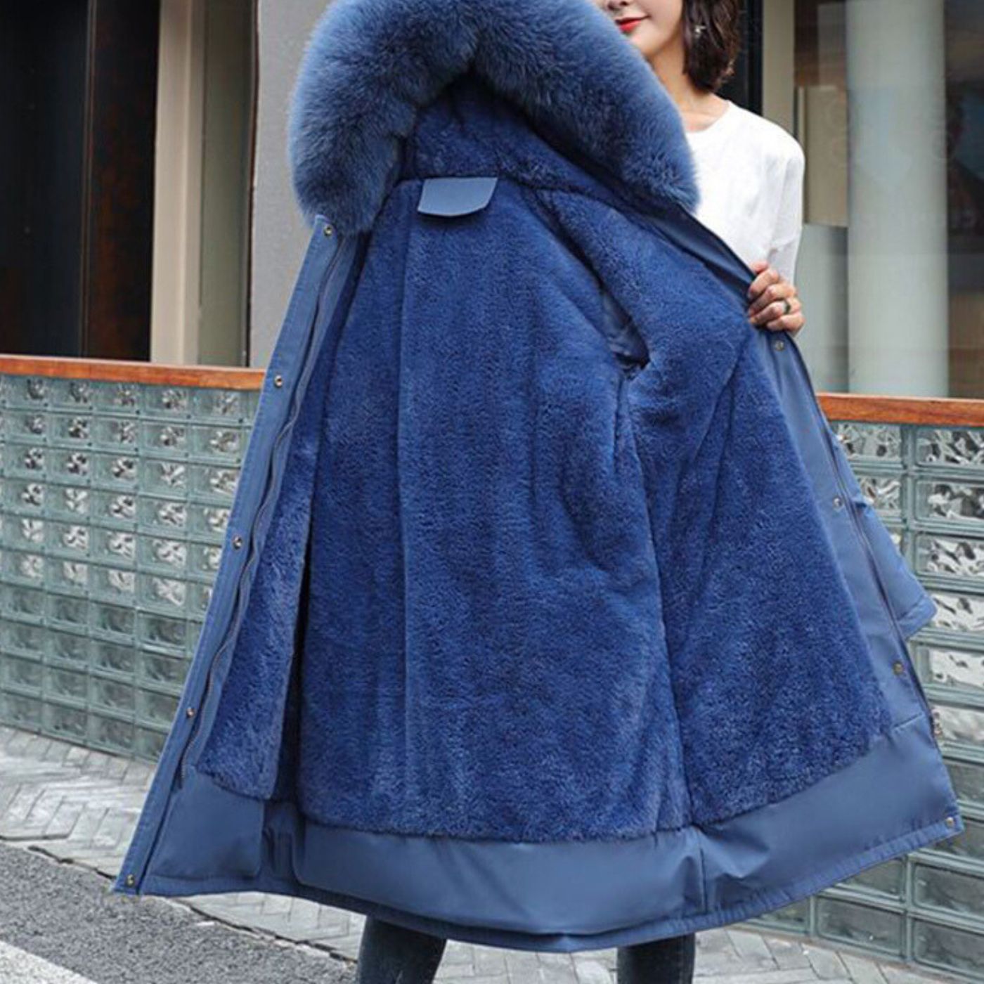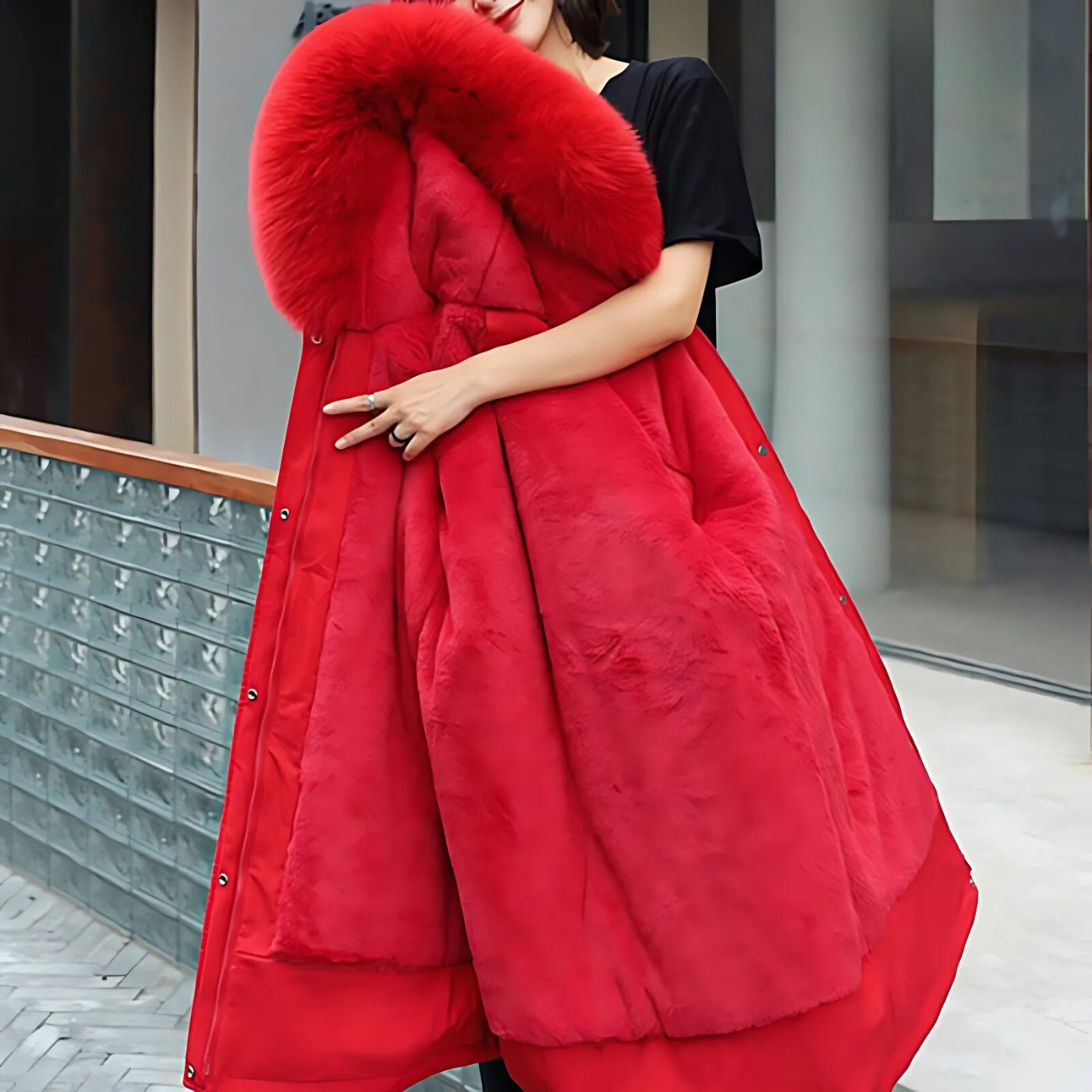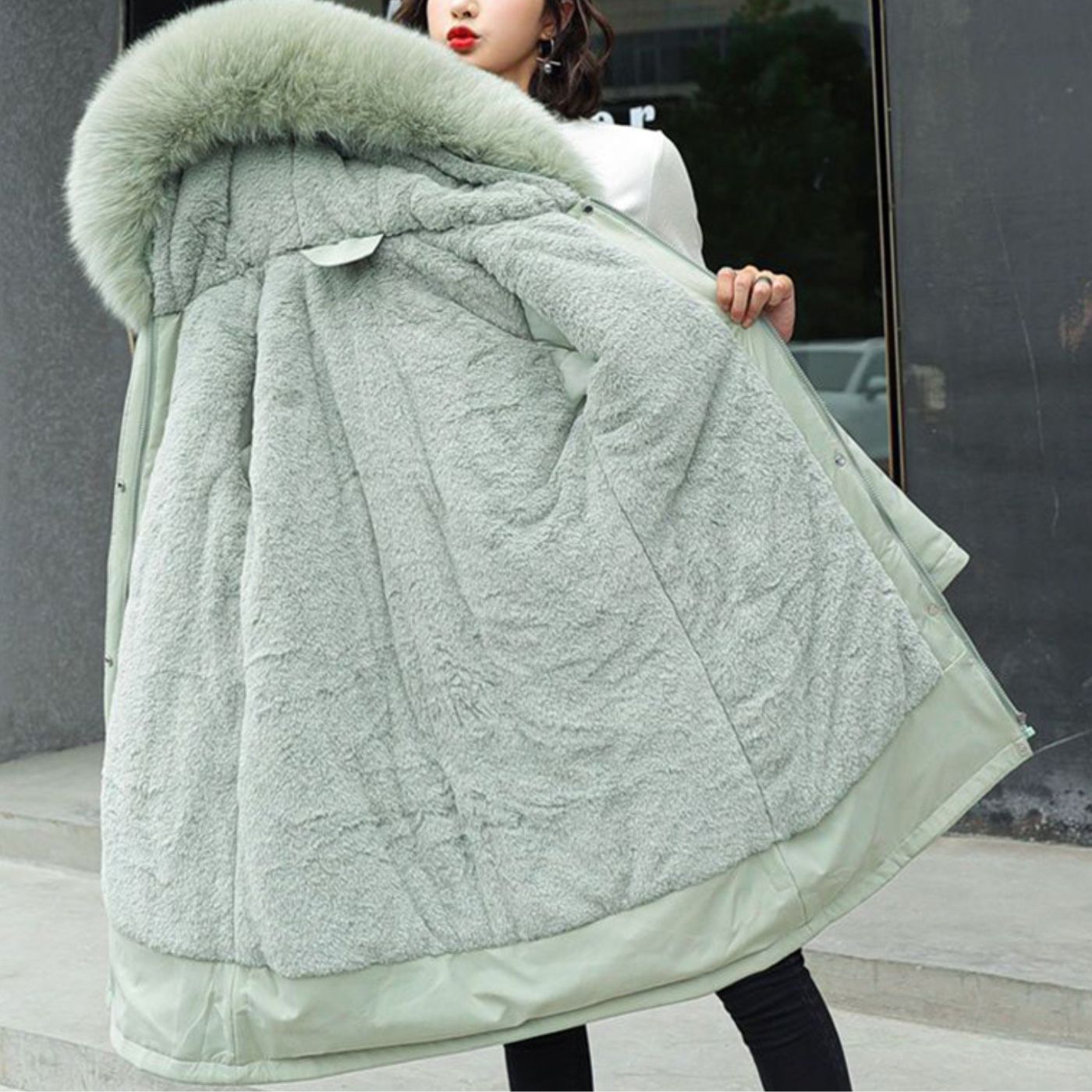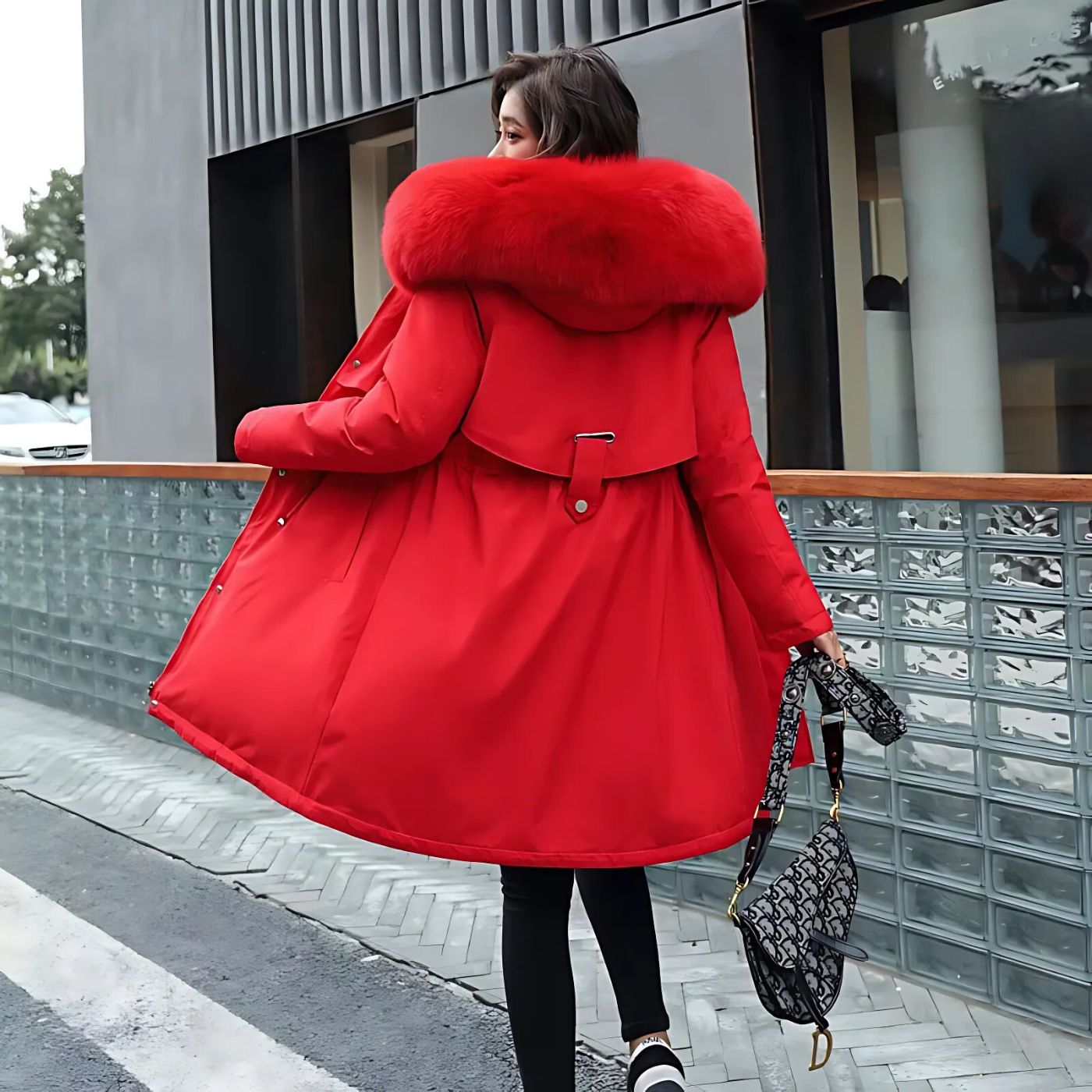 Mit einer weichen Fellfütterung und einer schützenden Kapuze vereint er stilvolles Design mit außergewöhnlicher Funktionalität. Ob bei einem Spaziergang im Schnee oder bei einem besonderen Anlass – dieser Mantel sorgt dafür, dass Sie warm bleiben und gleichzeitig eine elegante Figur machen.