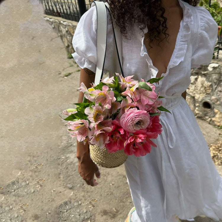 Dieses weiße Maxikleid verkörpert Frische und Weiblichkeit mit lässiger Eleganz. Der fließende Stoff, der zarte V-Ausschnitt und die Puffärmel schaffen eine leichte Silhouette, die perfekt für sonnige Tage oder einen Ausflug mit Freundinnen ist. Der in der Taille geknotete Schnitt betont die Kurven und bietet gleichzeitig absoluten Komfort. ein schickes und zeitloses Essential für einen mühelos gepflegten Look.