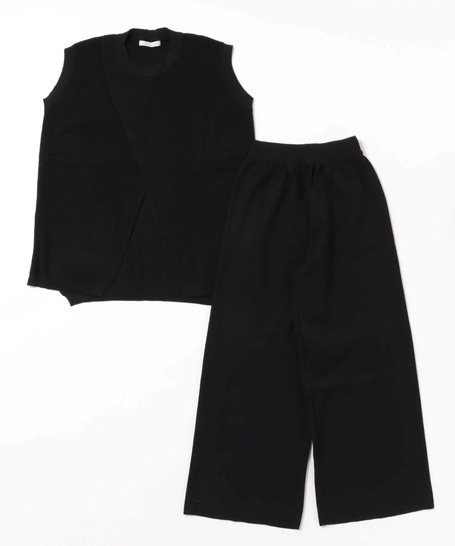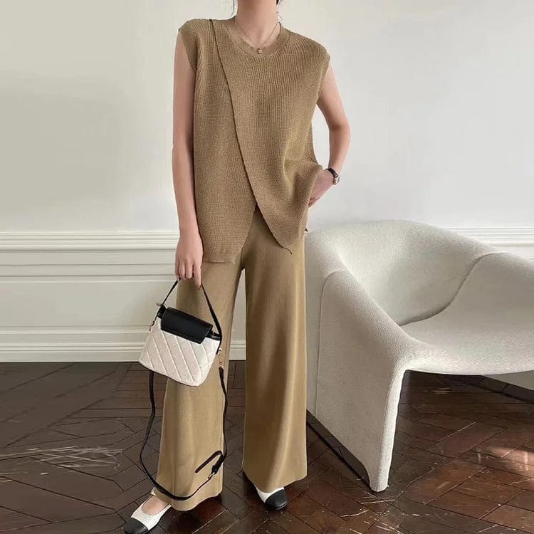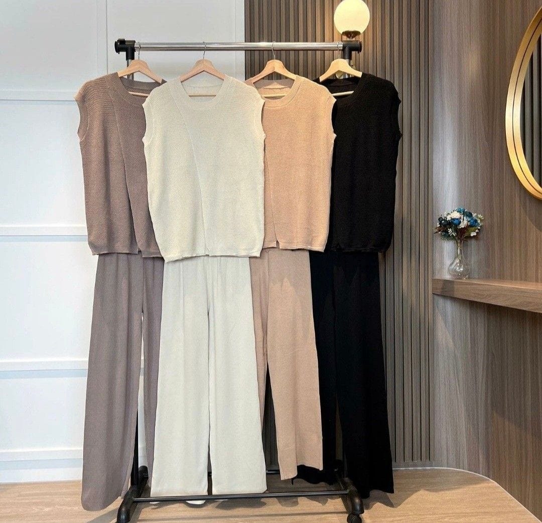Gefertigt aus einem gestrickten Stoff mit großer Dehnbarkeit, ist das Set sowohl angenehm als auch langlebig. Es verfügt über ein ärmelloses Top mit Rundhalsausschnitt und geteiltem Design, das einen schicken Look verleiht. Die Hose mit elastischem Bund sorgt für eine schmeichelhafte und sichere Passform und ermöglicht Bewegungsfreiheit, sodass Sie sich den ganzen Tag lang wohl fühlen. Ein Set, das Ihre Figur mit einem eleganten und modernen Schnitt betont und Ihnen Selbstbewusstsein verleiht.