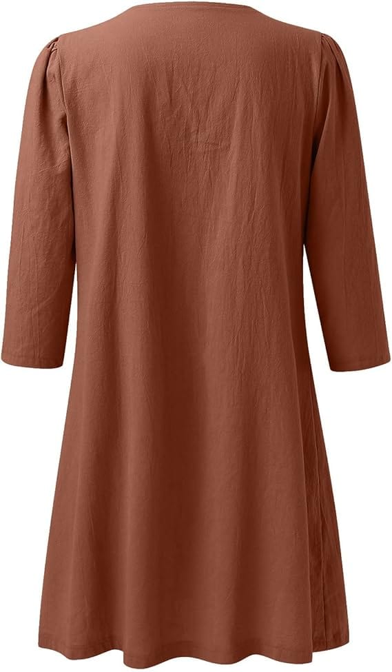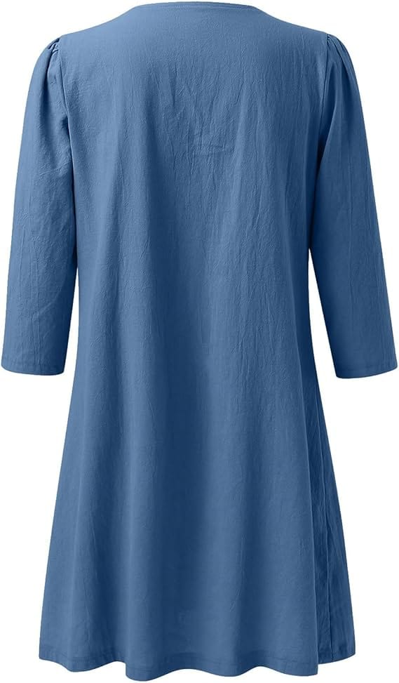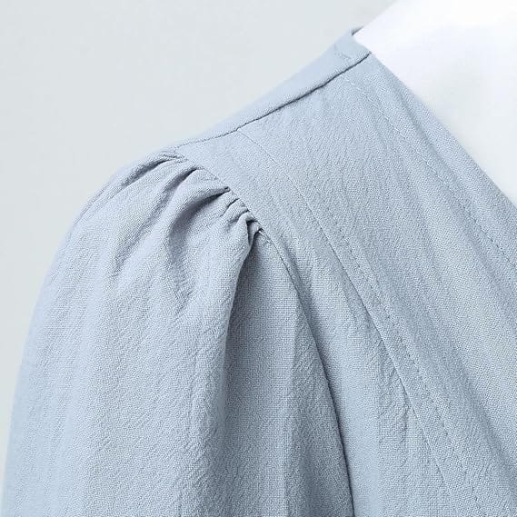 Es ist aus weichem, dehnbarem und leichtem Material gefertigt, das angenehm zu tragen ist. Es ist mit einem lockeren Pullover-Stil und einer A-Linien-Silhouette entworfen. Es verfügt über 3/4-Ärmel für perfekte Abdeckung und einen Hauch von Eleganz, einen V-Ausschnitt, der Weiblichkeit hinzufügt, und ein gesmoktes Design, das für eine schmeichelhafte Passform sorgt und Ihre Kurven betont.