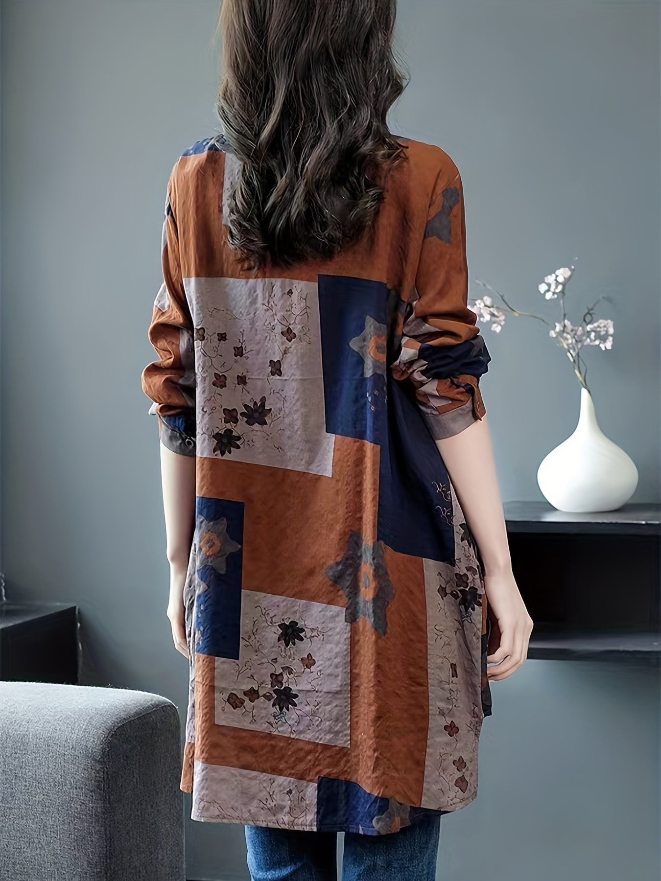 Lässige Leinenbluse in Übergröße, geometrischer Druck, lange Ärmel, Rayon-Mischung