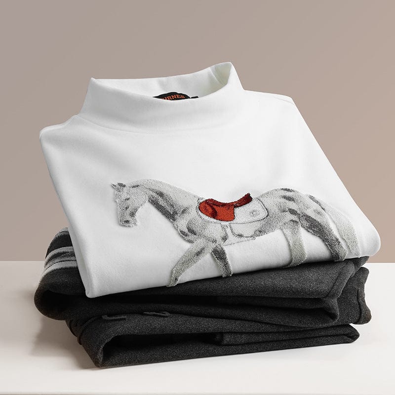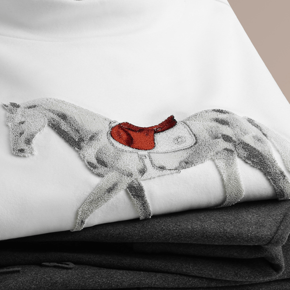 - 3D-Stickerei: Die detailgetreue Pferdestickerei bringt Textur und Tiefe, was dem Pullover eine einzigartige, kunstvolle Note verleiht.
