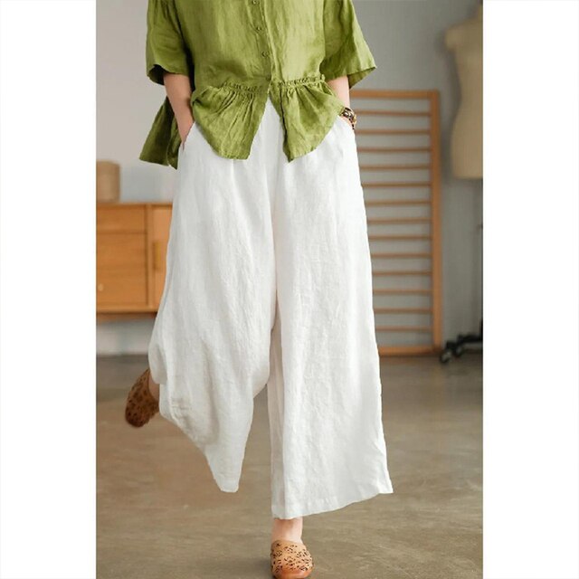 LAUREN Hosen im Vintage-Stil haben eine gesmokte hohe Taille, gerade weite Beine, locker sitzende Lounge-Hosen mit Taschen, Strandhosen aus Leinen für Damen und fließende, bequeme und elegante Hosen.