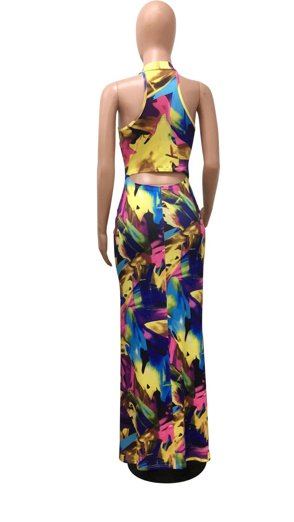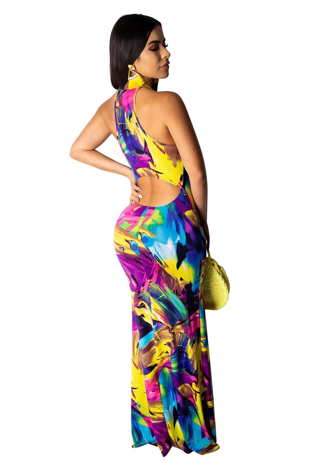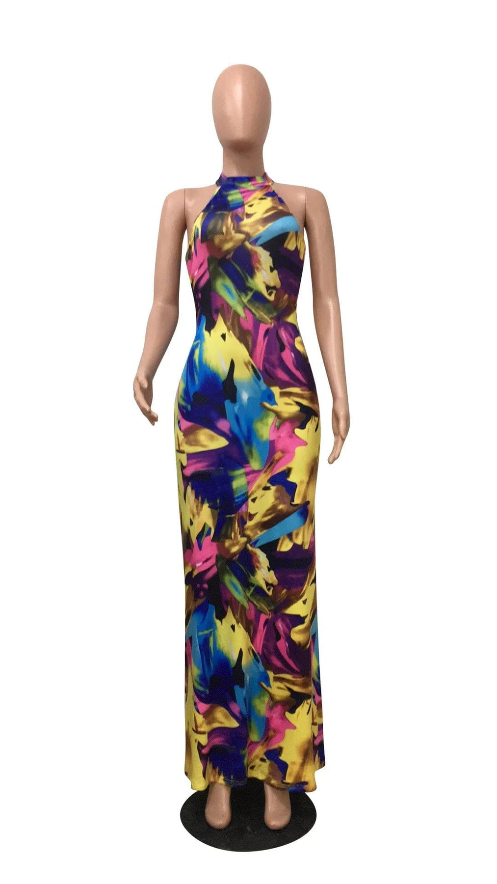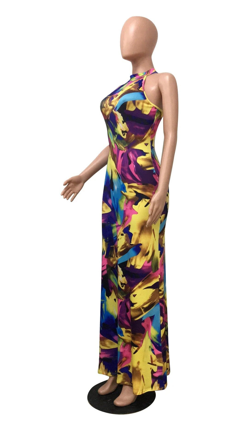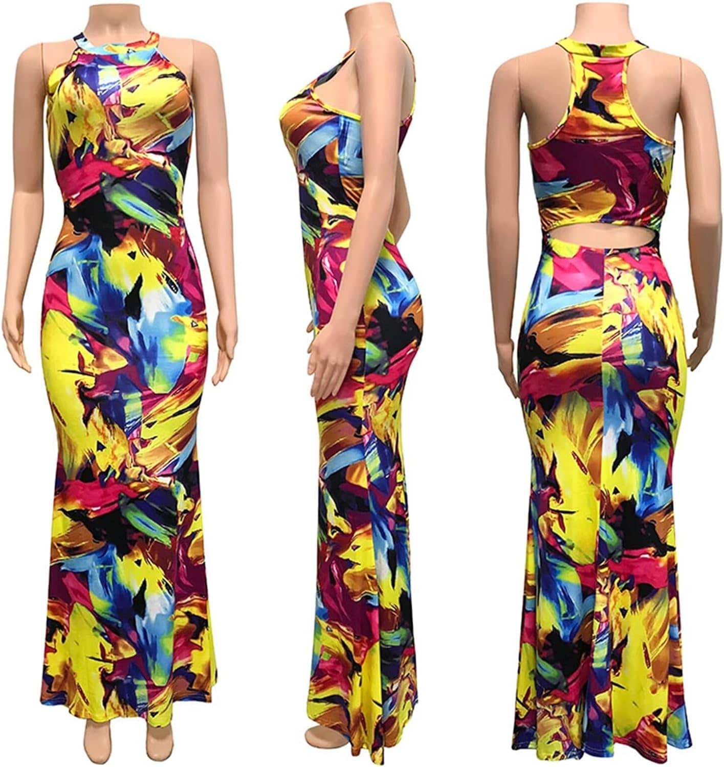 Das verwendete Material besteht aus Polyester und Elastan, das dehnbar, atmungsaktiv, weich und bequem zu tragen ist. Es verfügt über einen Neckholder, eine hohe Taille, ein lebhaftes Malerei-Druckmuster, ein weiches Tragegefühl, eine lockere Passform, ein tailliertes Design und ein ärmelloses Maxikleid-Design, das die feminine Silhouette zeigt. Das Kleid ist knapp unterhalb der Knie, wo es für eine bequeme Bewegung ausläuft, während der Saum am Boden endet.
