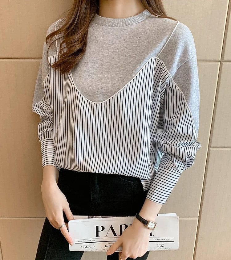 Dieses MYRNA-Sweatshirt mit modischem gestreiftem Druck ist ein Top, das selbst einem simplen Stil einen stilvollen Look verleiht. Es handelt sich um ein Docking-Top mit einer gestreiften Bluse in Lagenoptik. Das Sweatshirt hat ein Fake-Design, das aussieht wie ein Bustier, das über einem schlichten Sweatshirt getragen wird. Es ist sehr einfach und praktisch, es alleine zu tragen, und sieht niedlich aus, egal ob drinnen oder draußen getragen.