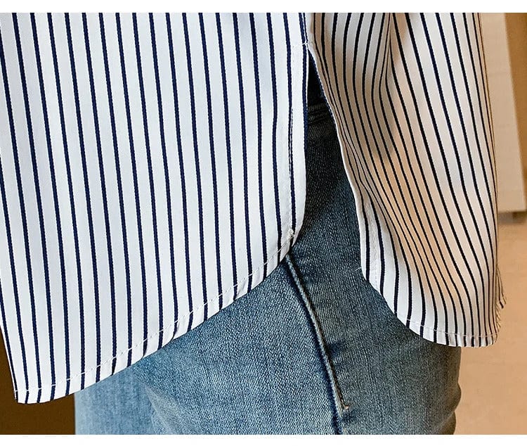 Es handelt sich um ein gestreiftes, erfrischendes Shirt in Kombination mit einem Cut-and-Sew-Oberteil. Du kannst mit nur einem Teil einen stilvollen Lagen-Look kreieren. Das Design hat einen längeren Rücken und seitliche Schlitze, was es einfach macht, nur vorne einzustecken. Das Material besteht aus 65% Baumwolle und 35% Polyester, ist ungefüttert und nicht dehnbar. Das Streifenmuster verleiht einen eleganten Eindruck.