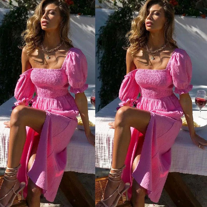 Der weiche und atmungsaktive Stoff sorgt dafür, dass Sie auch unter der heißen Sonne kühl bleiben, während die lebendige Farbe Ihrem Ensemble eine spielerische Note verleiht. Es hat eine mittlere Länge, ein quadratisches Dekolleté, kurze Puffärmel, die sowohl auf als auch neben der Schulter getragen werden können, einen Schlitz an einer Seite, ein gerafftes Oberteil und ein Futter, das Ihre natürlichen Kurven betont.