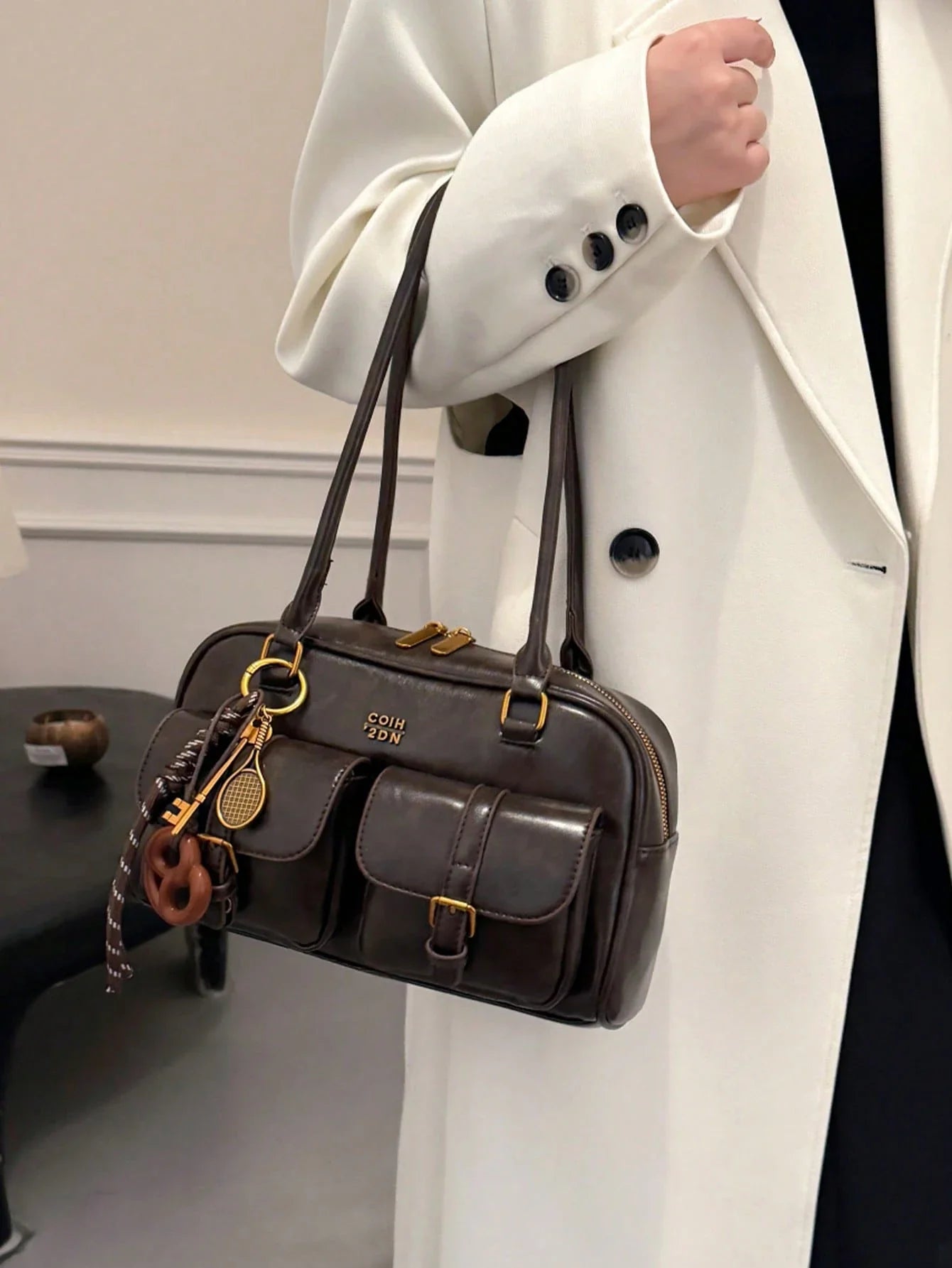 Gefertigt aus hochwertigem veganem Leder und veredelt mit einem dekorativen Anhänger, ist sie der perfekte Begleiter für unterwegs – ob im Alltag oder zum Ausgehen.