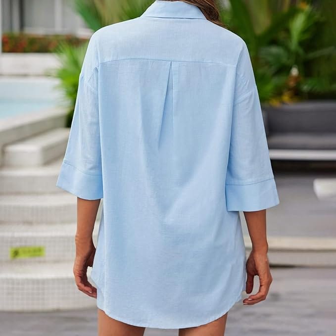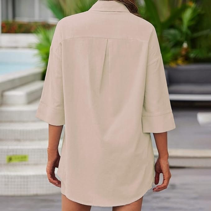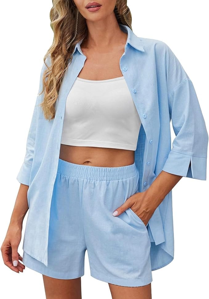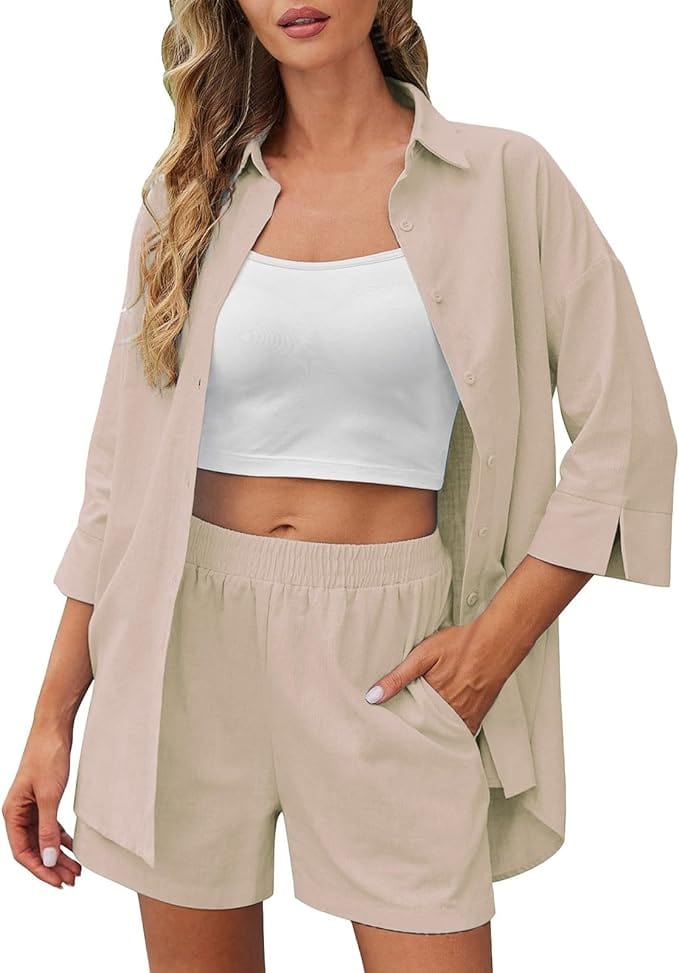 Unser zweiteiliges Leinen-Set ist eine perfekte Kombination aus Stil und Komfort. Das Hemd-Top und die Shorts bestehen aus einem lockeren Hemd mit Knopfverschluss, V-Ausschnitt und 3/4-Ärmeln sowie Shorts mit elastischem Bund und Seitentaschen, ideal für eine entspannte Strandatmosphäre. Sie können es als Set tragen oder separat mit einem Top oder einer Hose kombinieren.