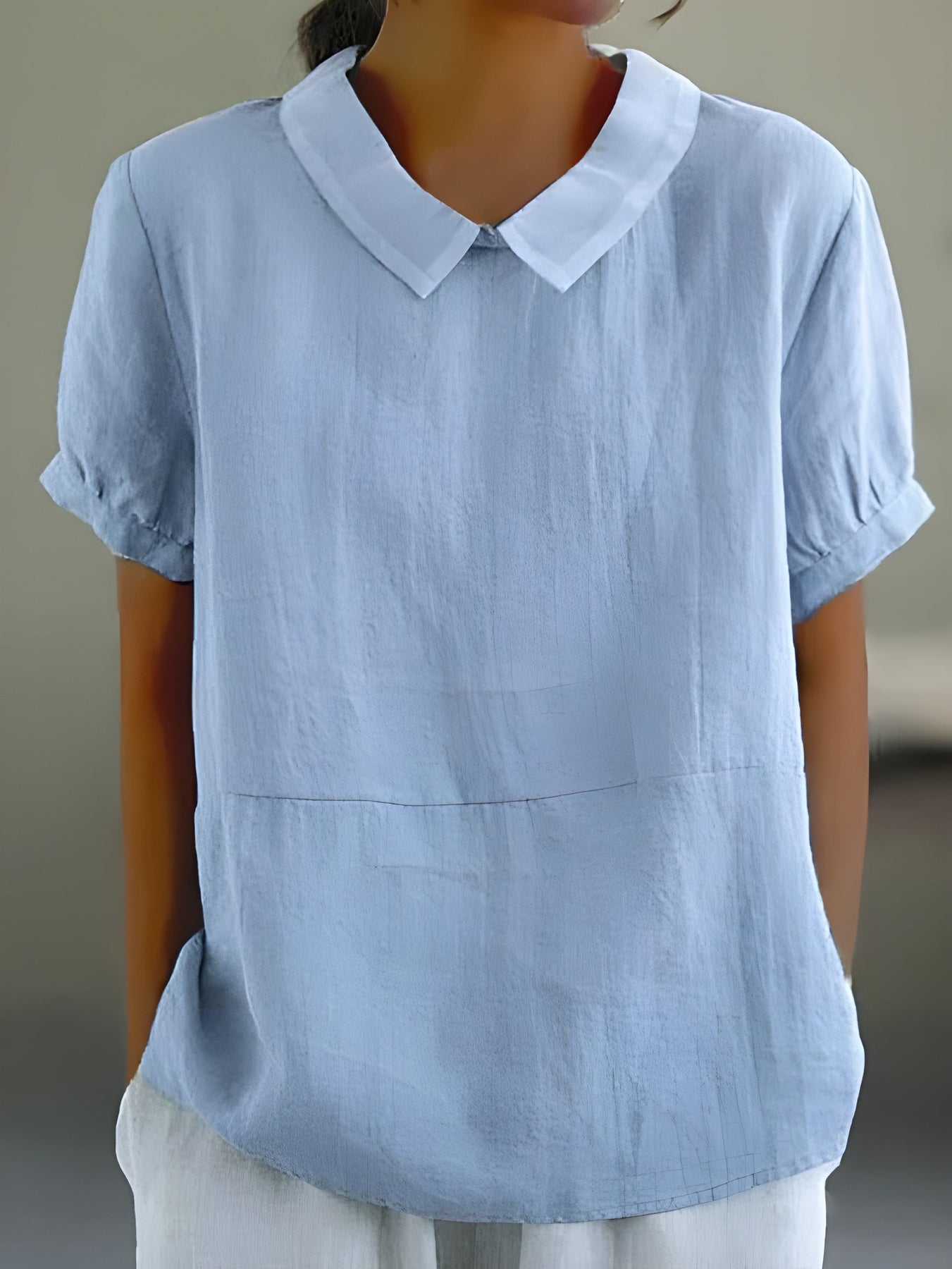 Die Priya Bluse mit kurzen Ärmeln vereint zeitlose Raffinesse mit legerem Komfort. Mit ihrem lockeren Schnitt, dem klassischen Peter-Pan-Kragen und dem angenehm leichten Material eignet sich dieses Oberteil ideal für Büro, Freizeit oder entspannte Tage zuhause. Der feminine Stil wird durch dezente Details ergänzt und macht die Bluse zu einem vielseitigen Begleiter für jeden Tag.