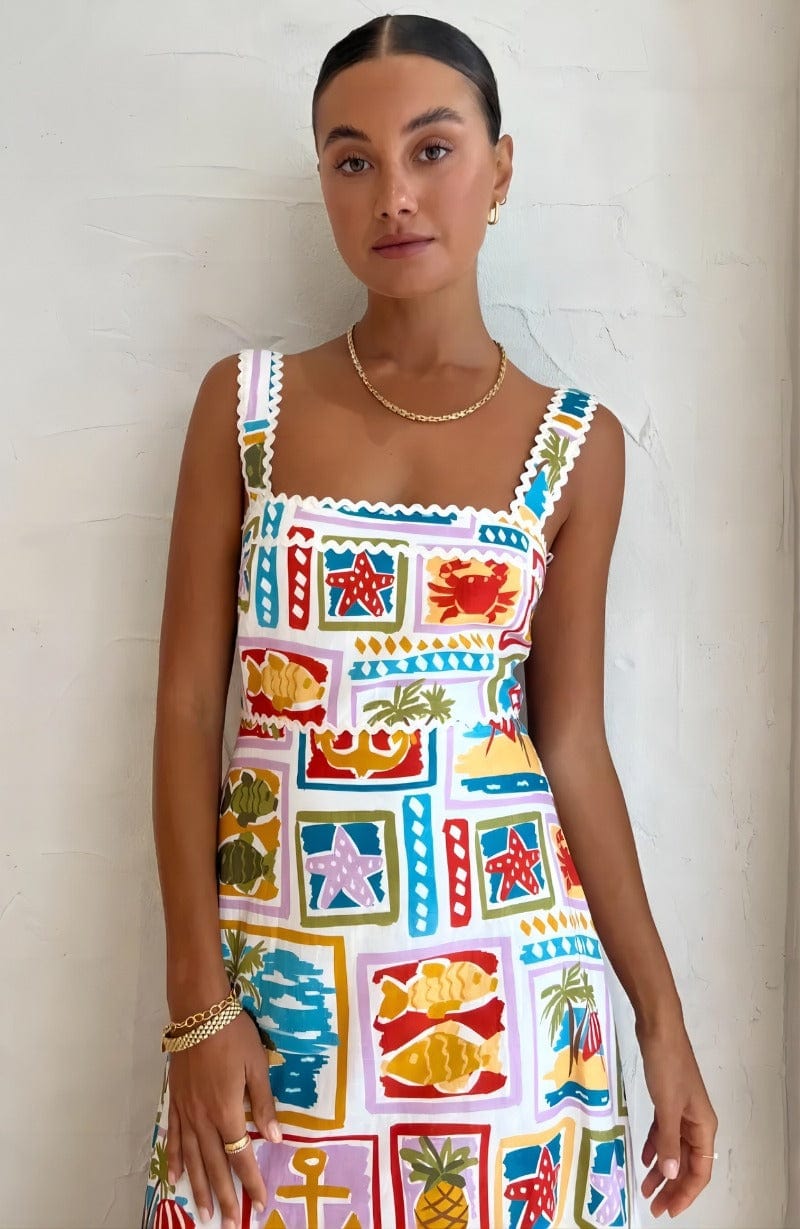 Dieses mittellange Strandkleid hat leuchtende Farben und einzigartige, strandige Malereien, die Sie zu jeder Zeit rein und süß erscheinen lassen. Es hat einen geraden Ausschnitt und ein eng anliegendes Oberteil, das in einen ausgestellten Rock übergeht und mit einer auffälligen, wellenförmigen Zierleiste an den Trägern, dem Ausschnitt und der Taille abgeschlossen ist. Es kann perfekt Ihre Halslinien zur Geltung bringen und macht Sie noch charmanter und selbstbewusster.
