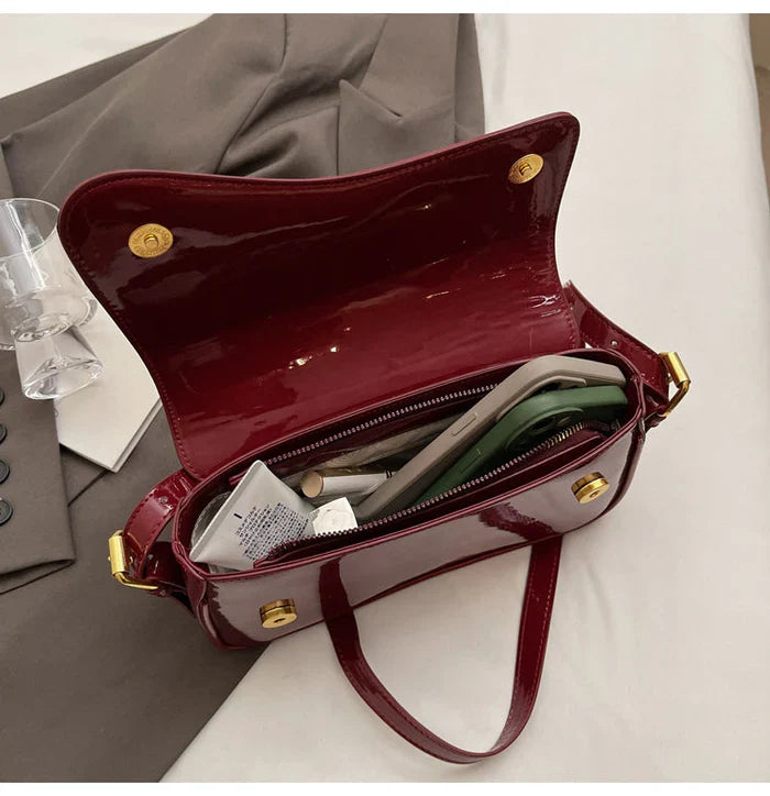 Verleihen Sie Ihrem Outfit mit der Saddie Bag einen Hauch von Eleganz. Hergestellt aus strapazierfähigem, glänzendem PU-Leder, vereint diese Tasche Stil und Funktionalität. Kompakt und dennoch geräumig genug für Ihre wichtigsten Utensilien – perfekt für jede Gelegenheit. Erhältlich in Bordeauxrot, Espressobraun und Schwarz.