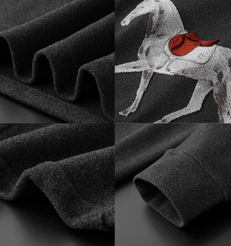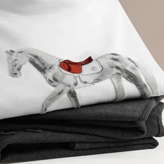 - 3D-gesticktes Design: Das kunstvoll gestickte Pferd mit dem markanten Sattel verleiht dem Pullover eine einzigartige Textur und hebt das Design auf eine neue Ebene.