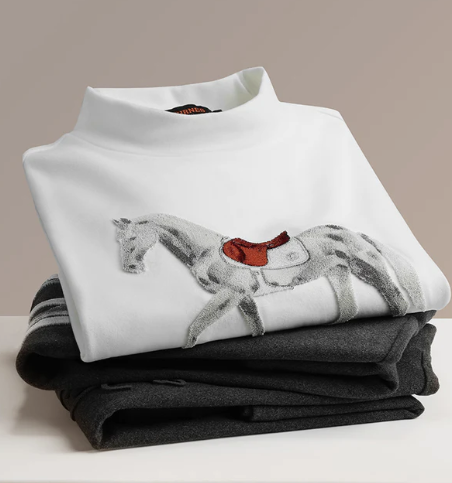 Der Saddle Knit Sweater verbindet stilvolle Wärme mit exquisitem Design. Mit seinem modernen, hochgeschlossenen Kragen sorgt dieser Pullover für Wohlbefinden und eine elegante Silhouette. Hergestellt aus weichem, kuscheligem Samtmaterial, hebt sich das detaillierte, in 3D gestickte Pferd, das von einem kunstvollen Sattel begleitet wird, als beeindruckendes Designmerkmal ab und verleiht dem Pullover einzigartige Textur und Dimension.