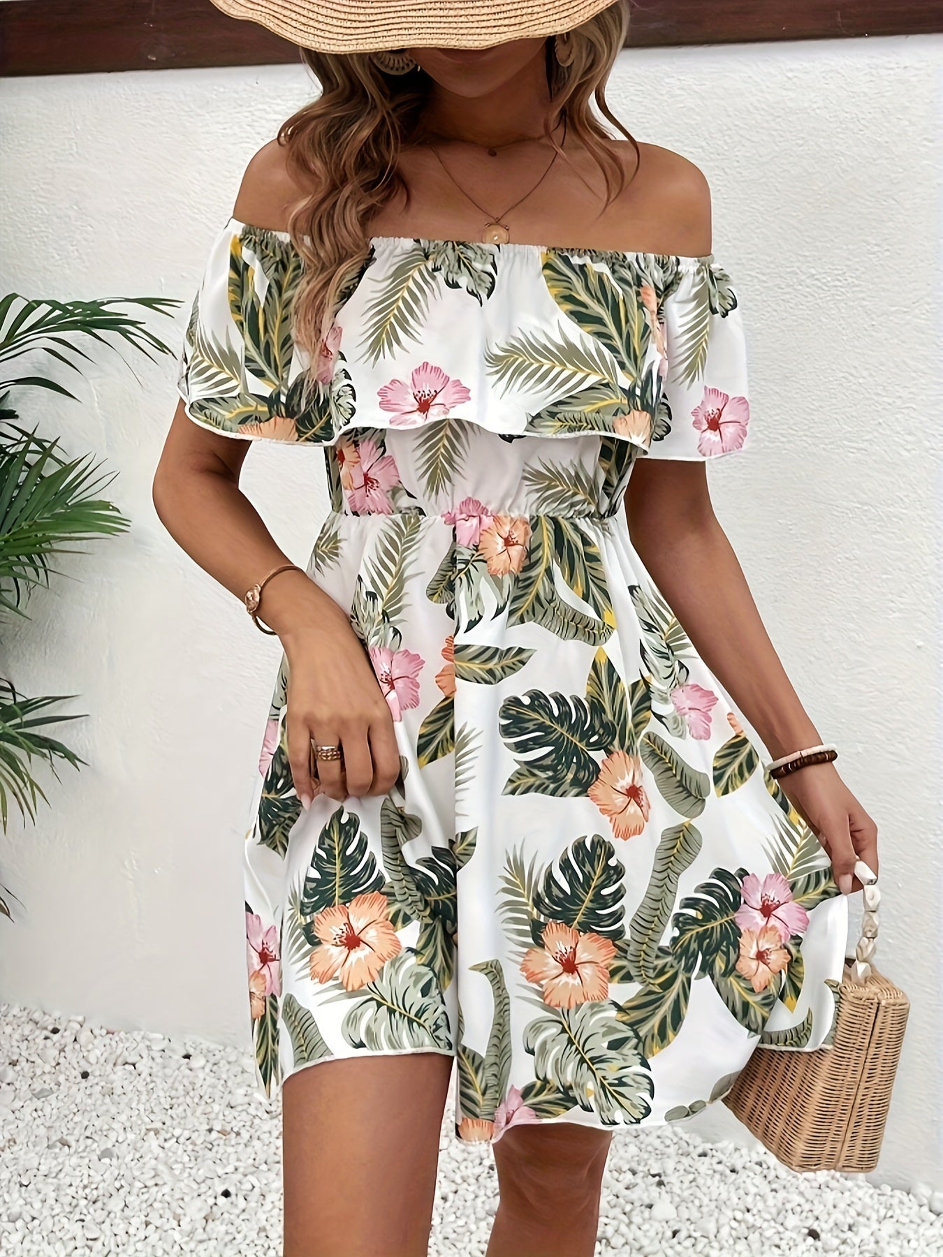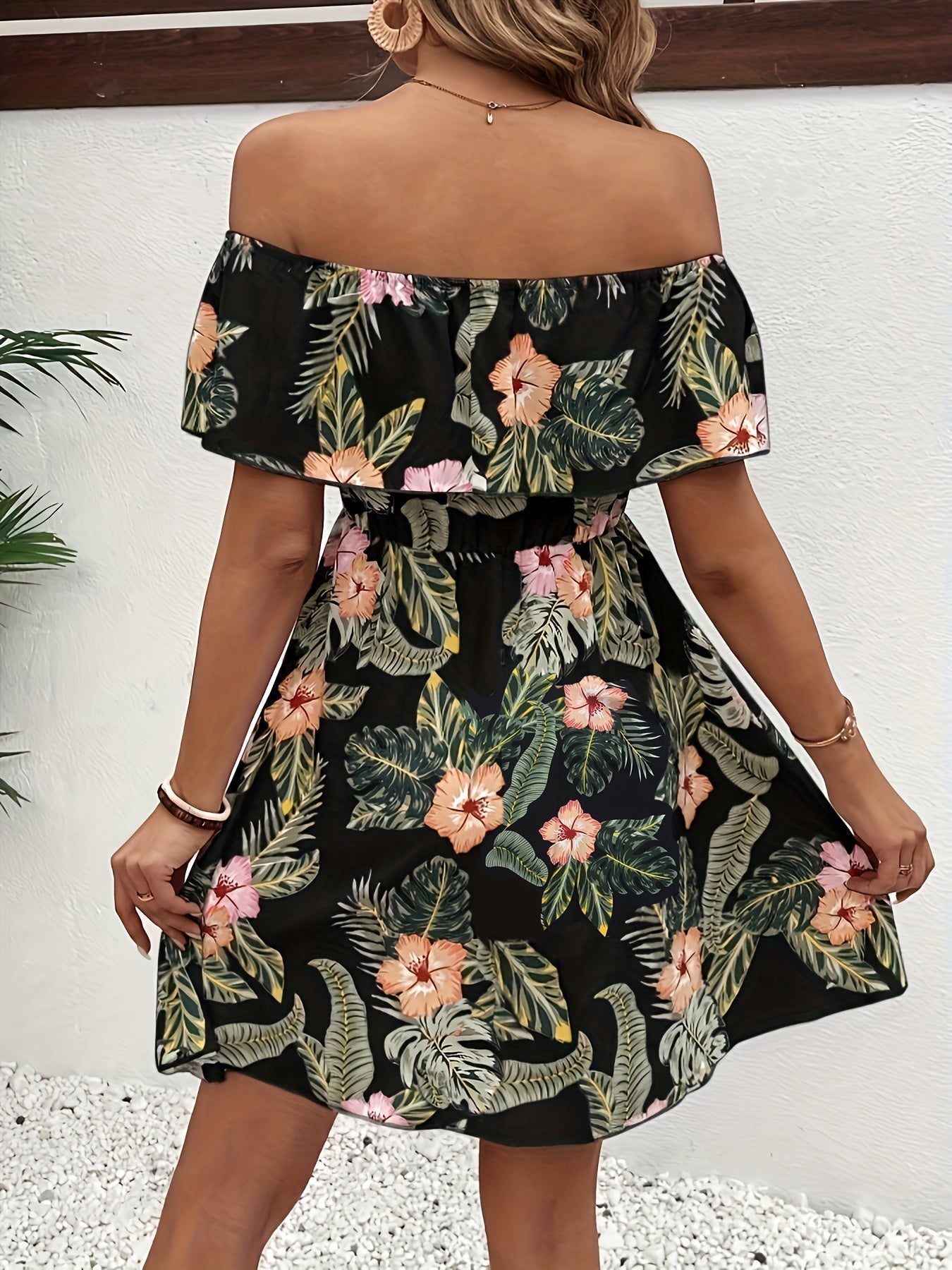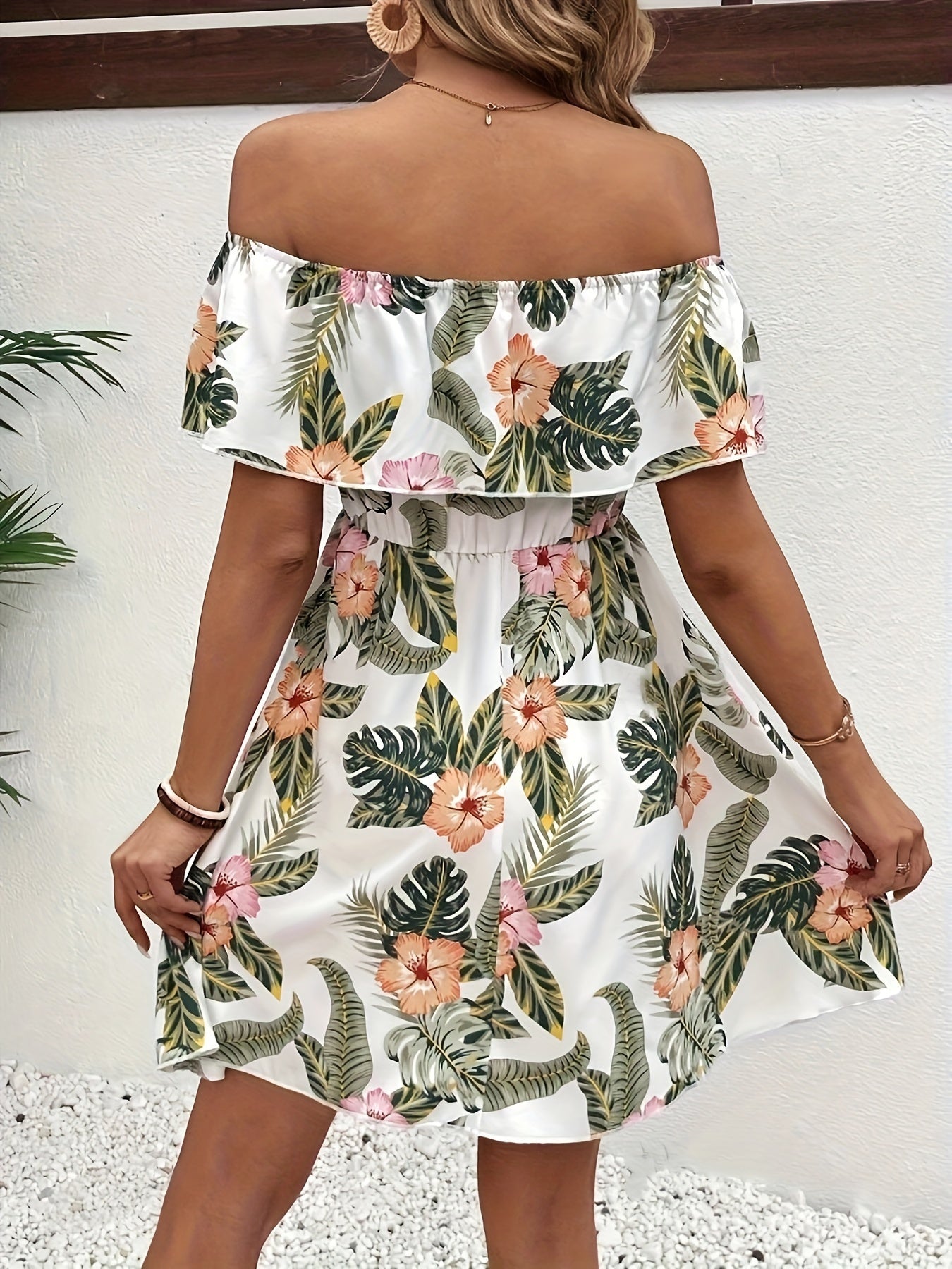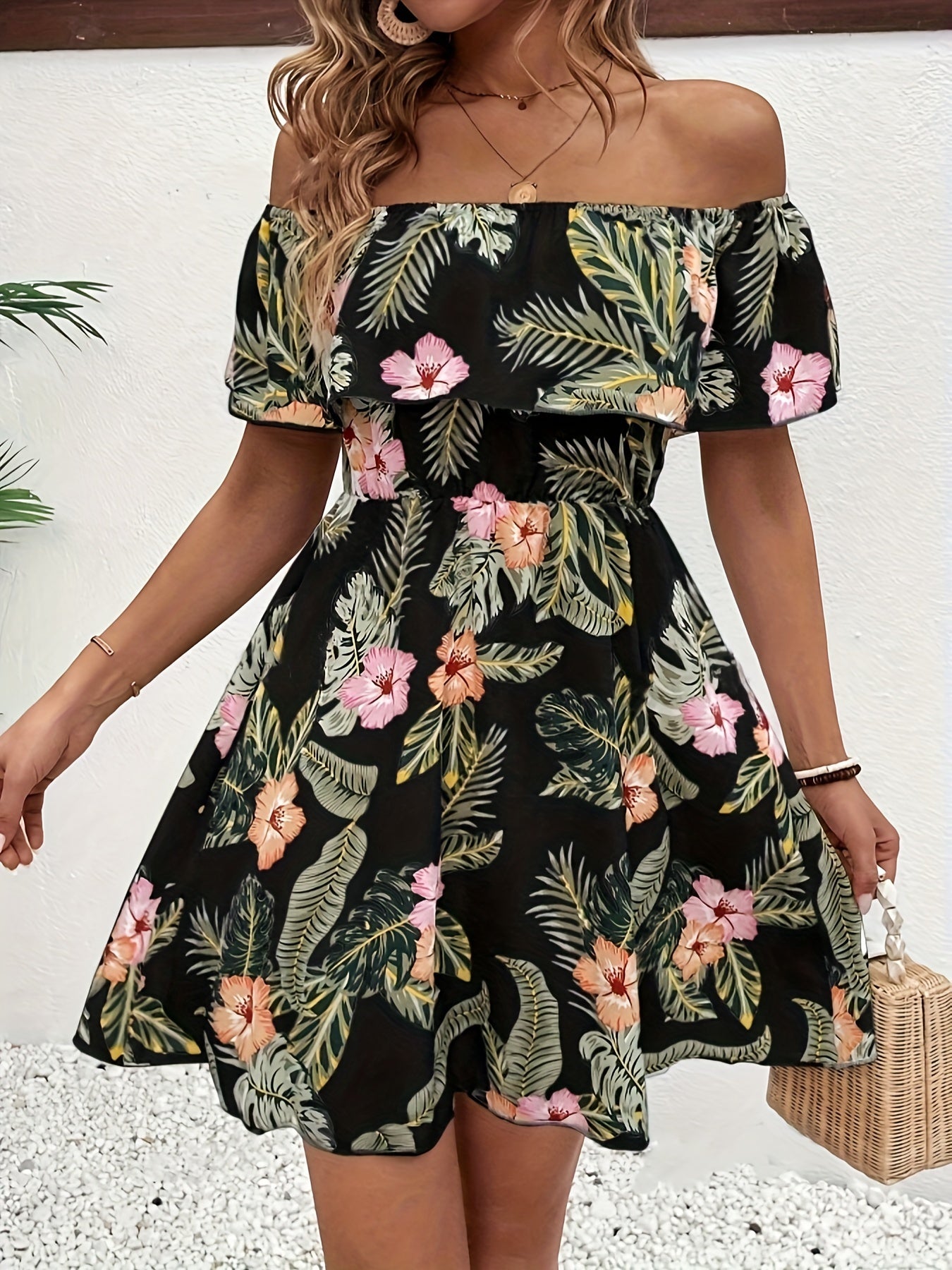 Schulterfreies Blumenmuster-Kleid – Elegantes Minikleid mit Rüschen