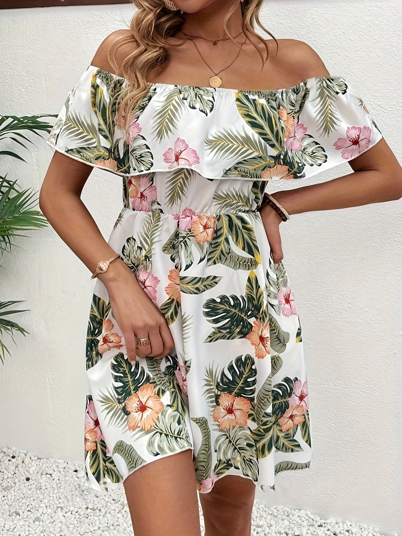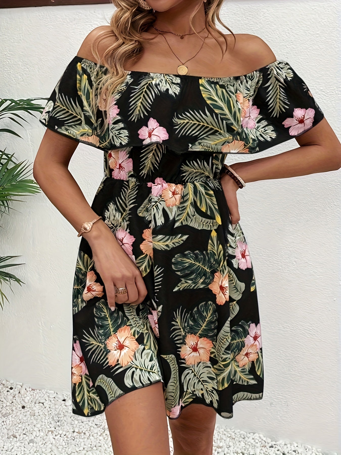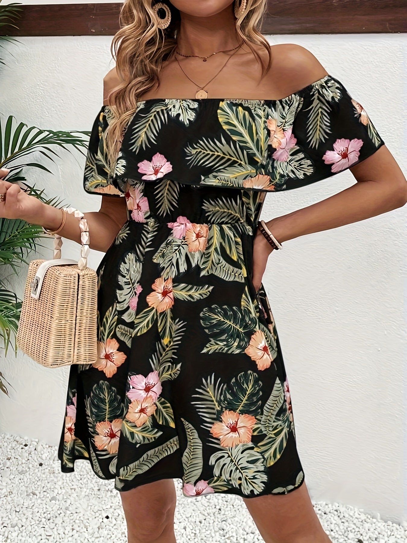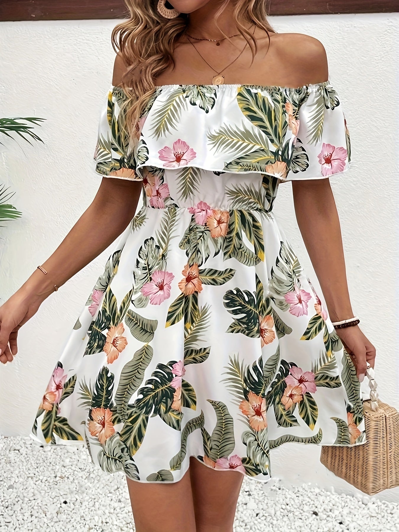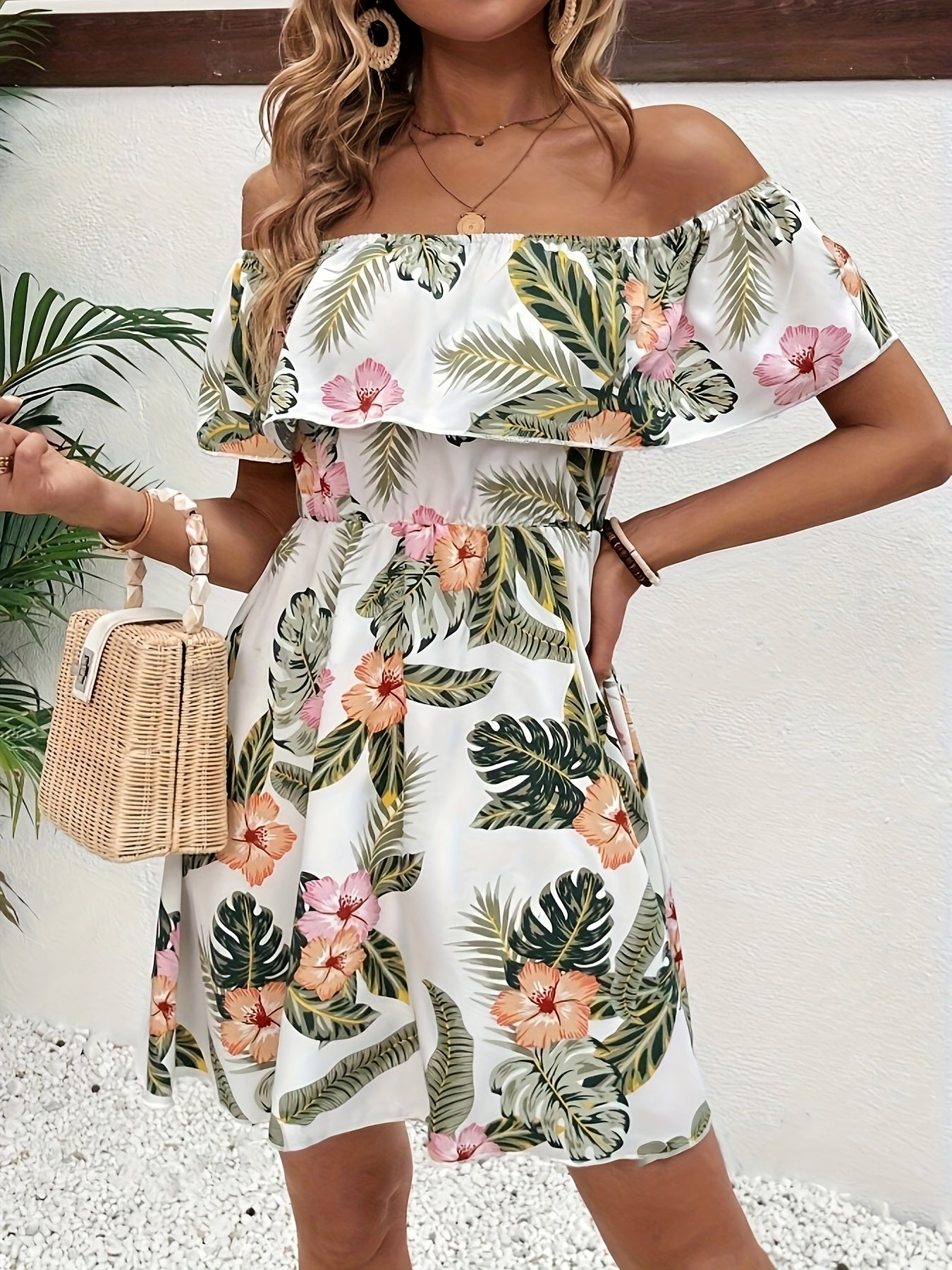 Schulterfreies Blumenmuster-Kleid – Elegantes Minikleid mit Rüschen