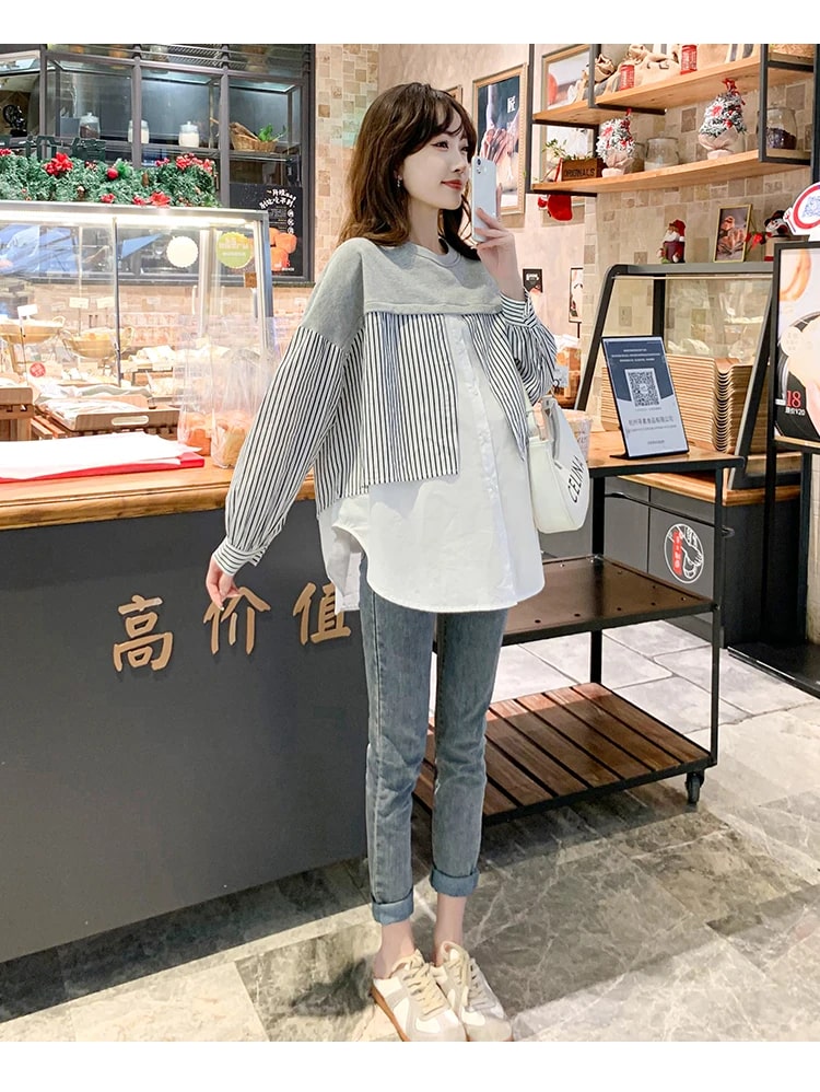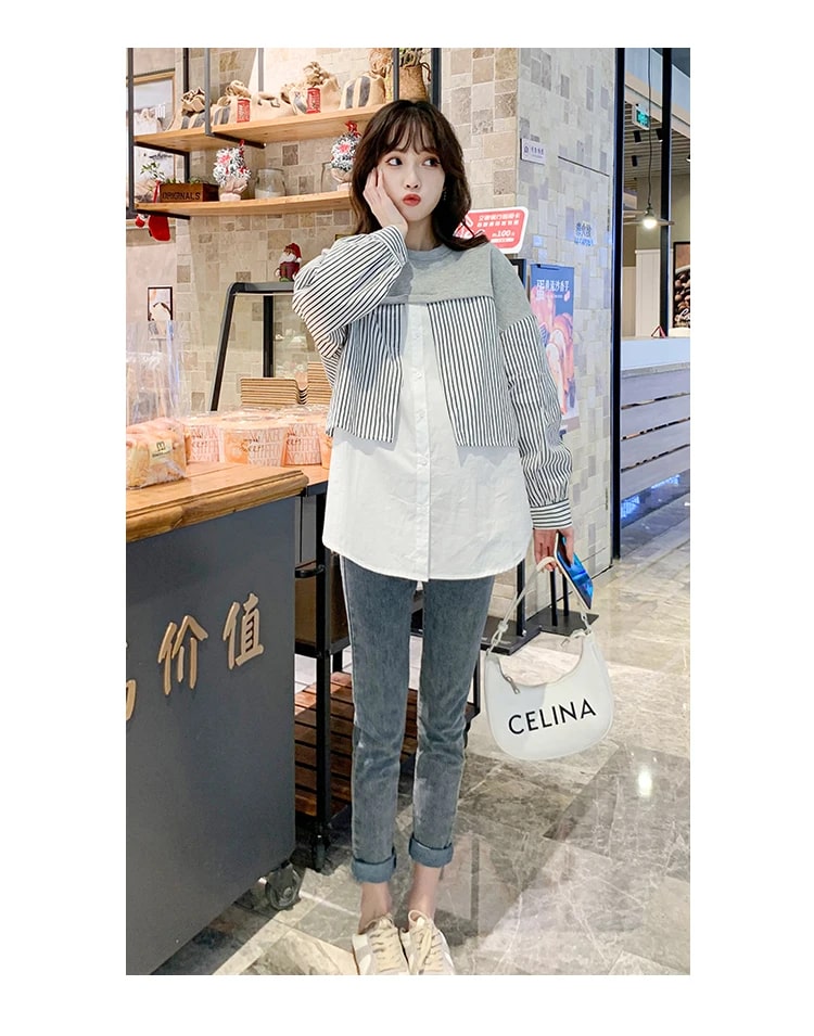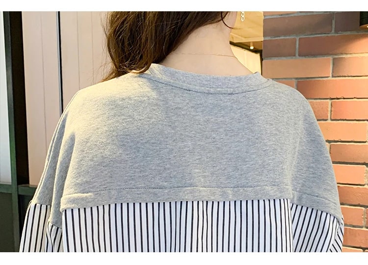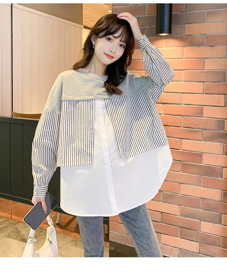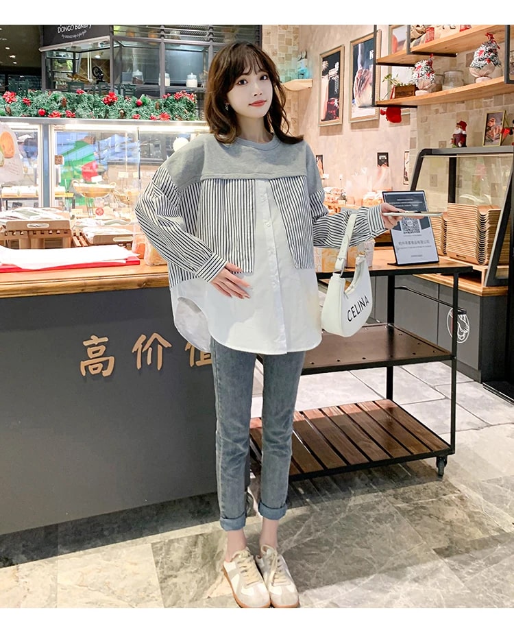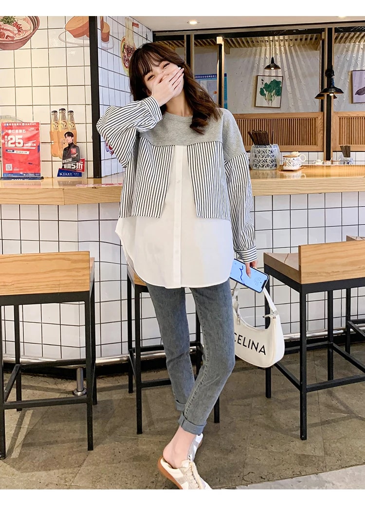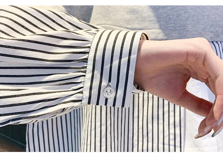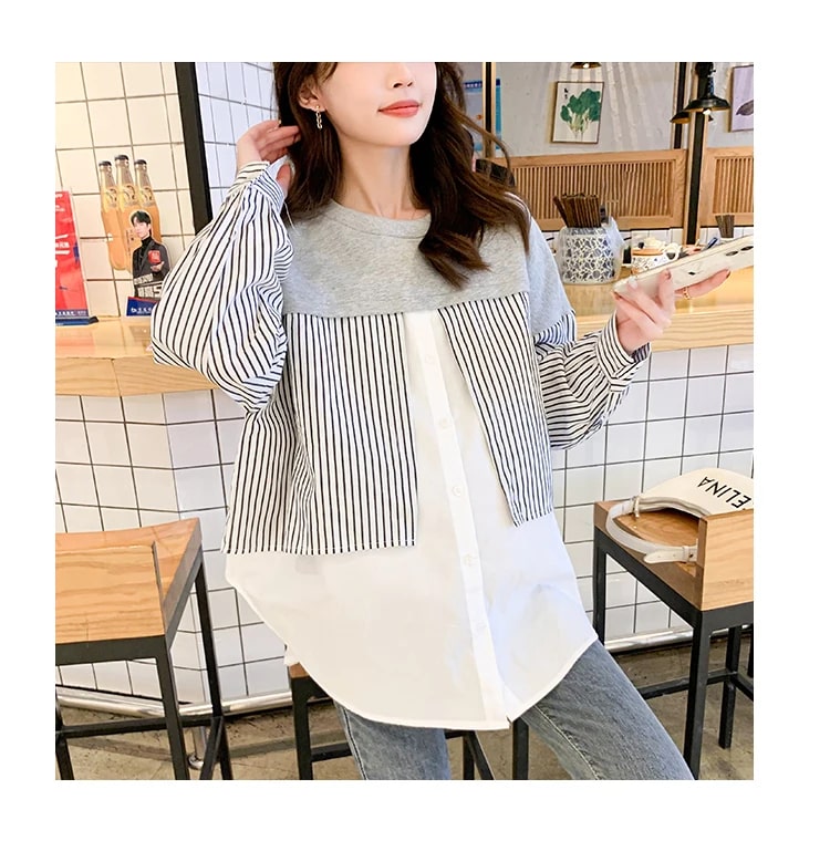 Es ist aus angenehmem Material gefertigt mit einem V-Ausschnitt, langen Ärmeln, einem vorderen Knopf, einer lockeren Passform und einem Linienmotiv. Es kombiniert geschickt weichen Strick, ein gesundes Streifenmuster und eine einfache Vollfarbe. Es ist ein Baumwollmischgewebe. Ein Stoff, der sehr gut, weich, angenehm zu tragen, nicht heiß und nicht dünn ist.