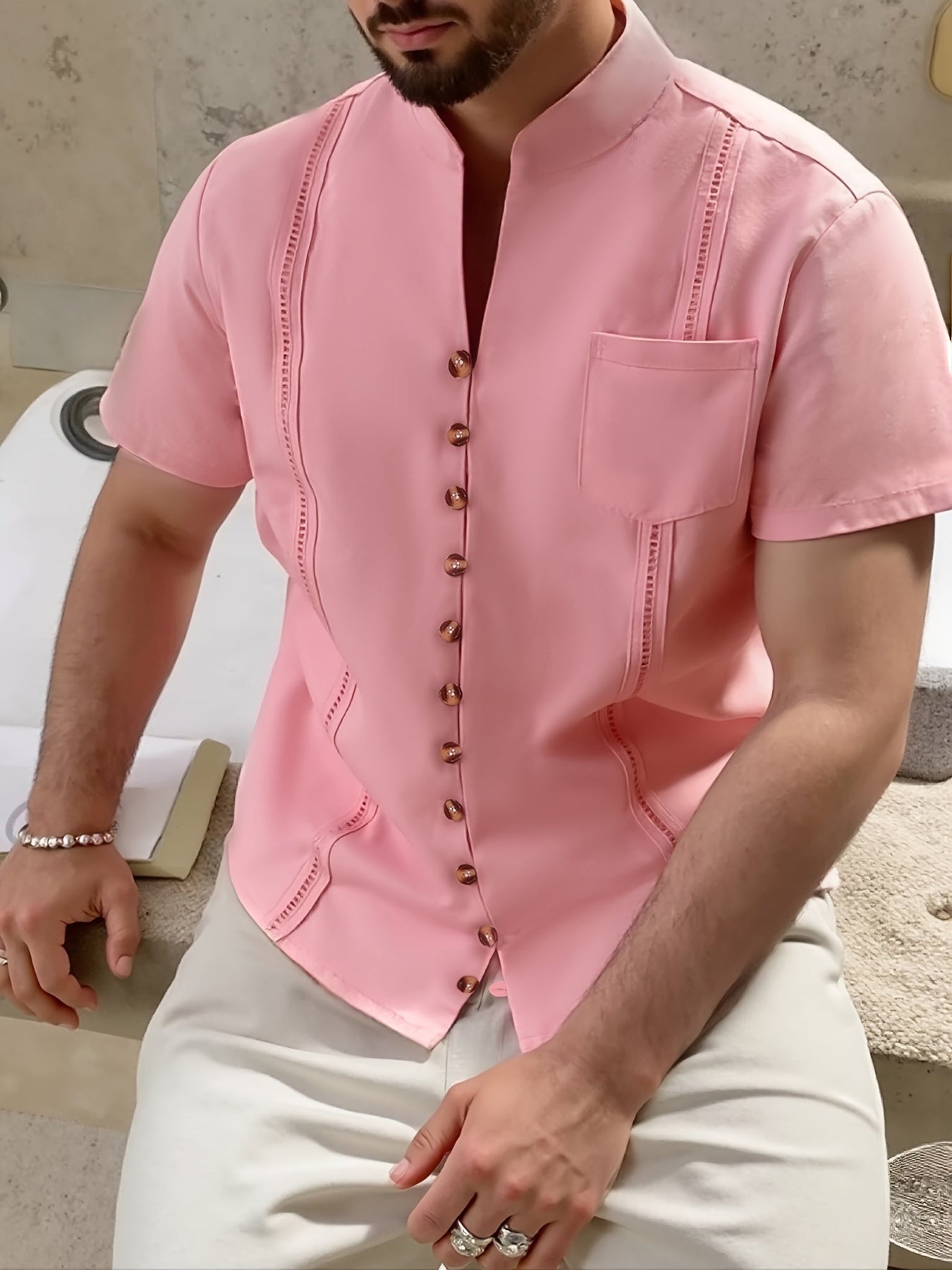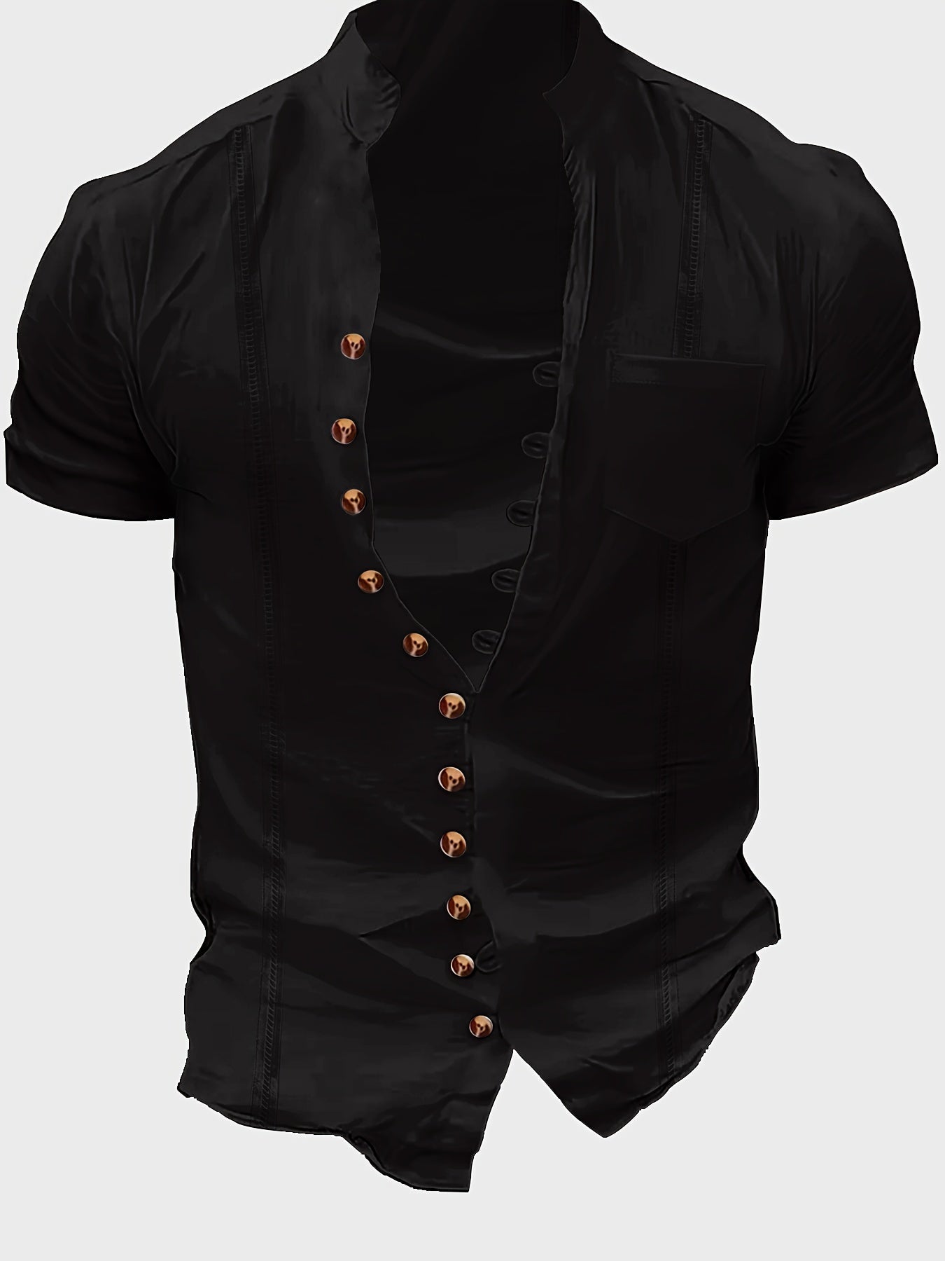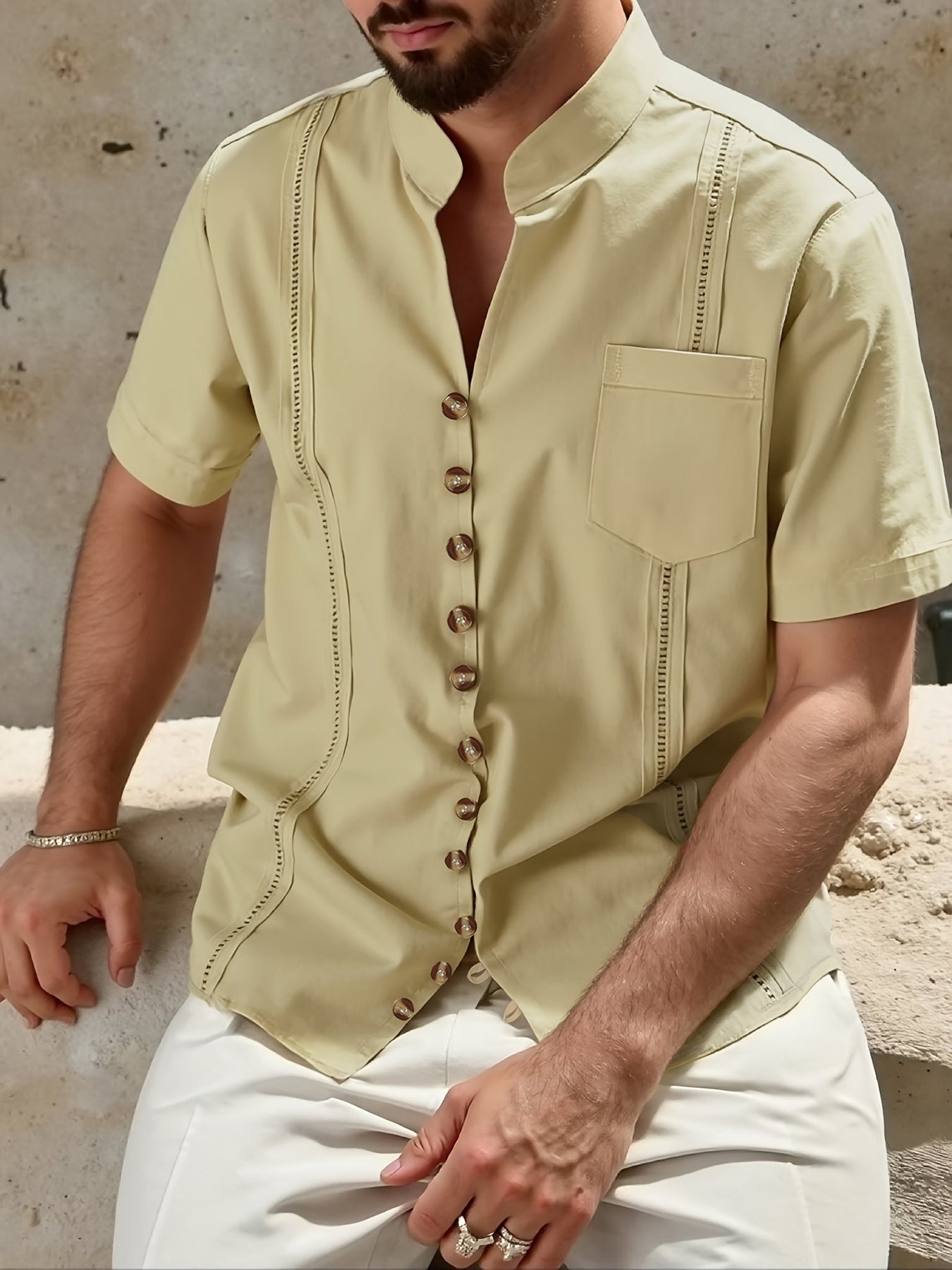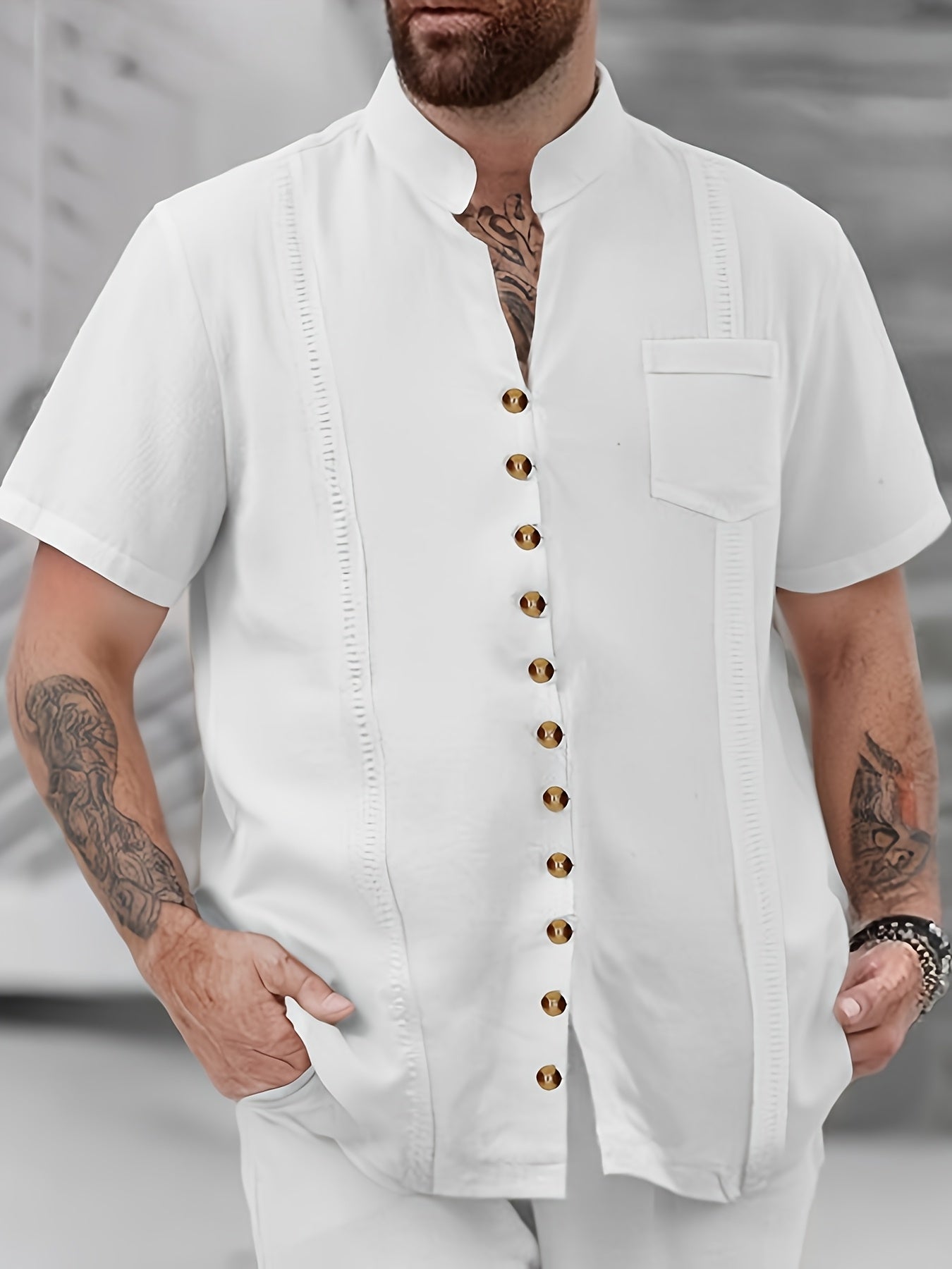 Sommer-Leinenhemd – Kurzarm, Baumwollmischung, Stehkragen & Knopfdetails
