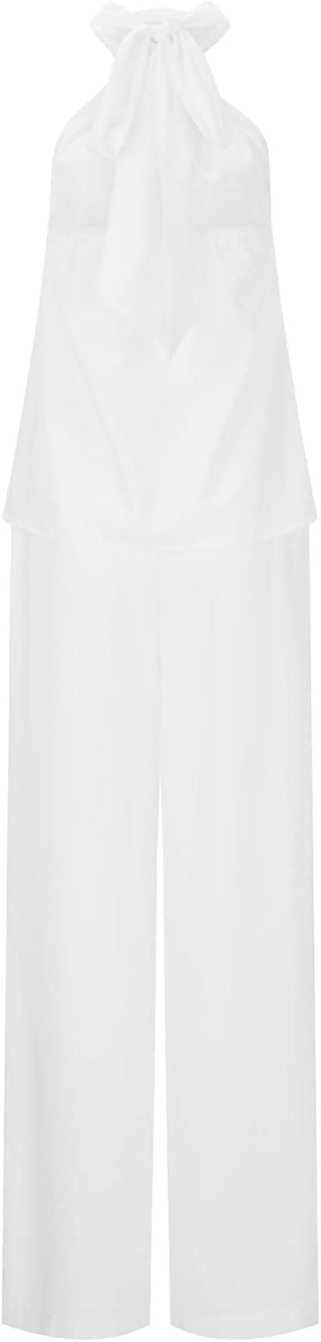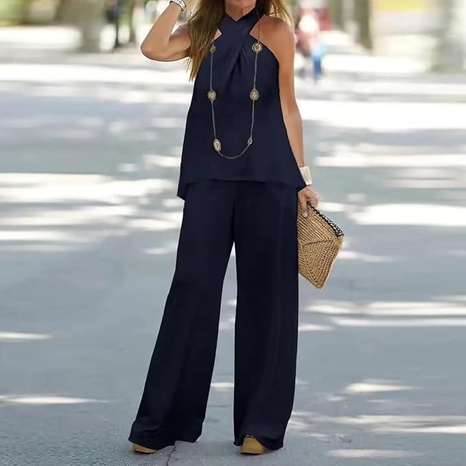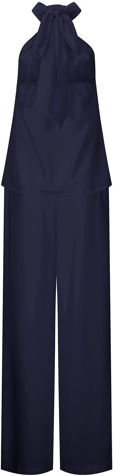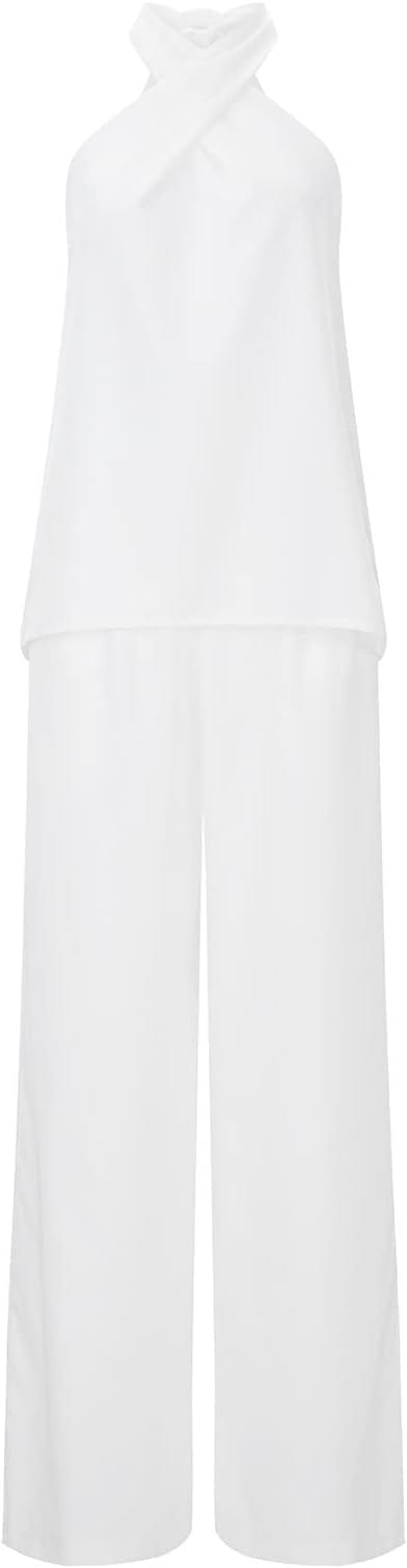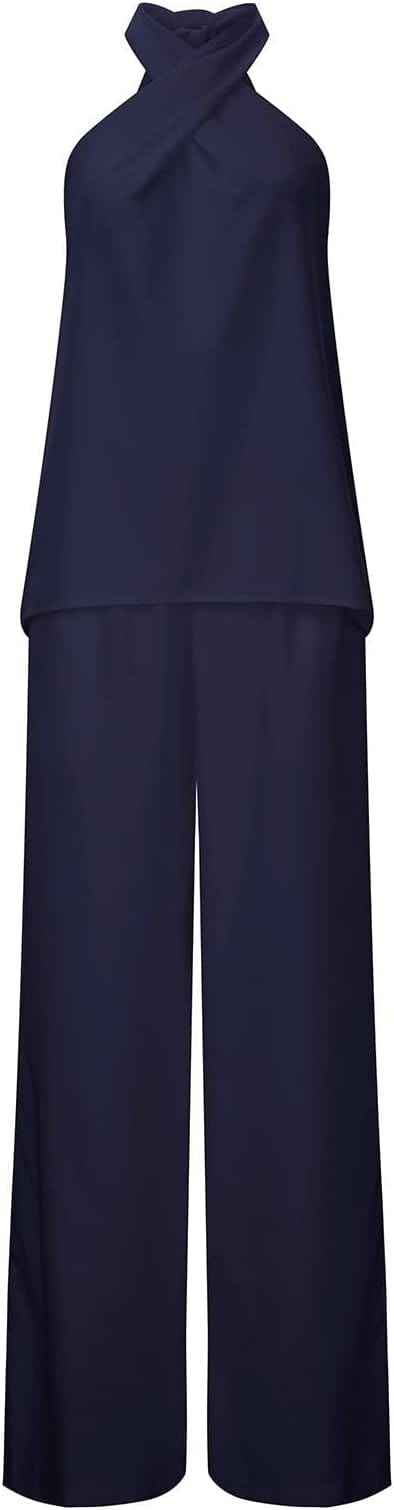 Der Stoff dieses modischen Sets besteht aus 95% Polyester und 5% Spandex, was ihn leicht, atmungsaktiv, weich und dehnbar macht. Das ärmellose Neckholder-Top ist so gestaltet, dass es Ihre charmanten Schultern betont. Der luftige, locker fallende Rüschen-Saum des Oberteils hilft, Ihre Taille zu kaschieren, und die weiten Hosen mit elastischem Bund und Taschen auf beiden Seiten bieten Ihnen ein bequemes Tragegefühl.