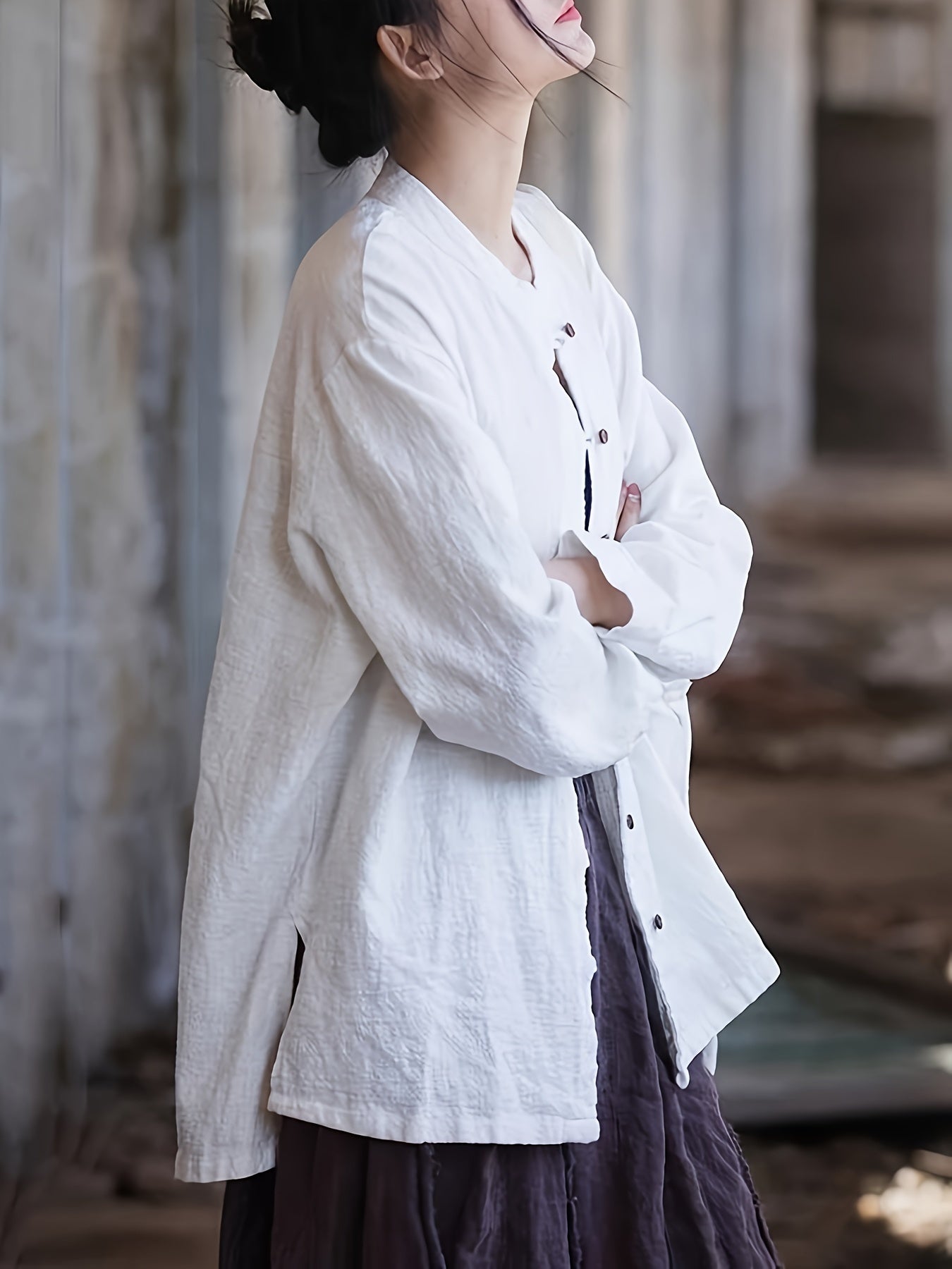 Vintage Damen Leinen Hemd mit Knopfdetails – Atmungsaktiv, Einfarbig, Polyester