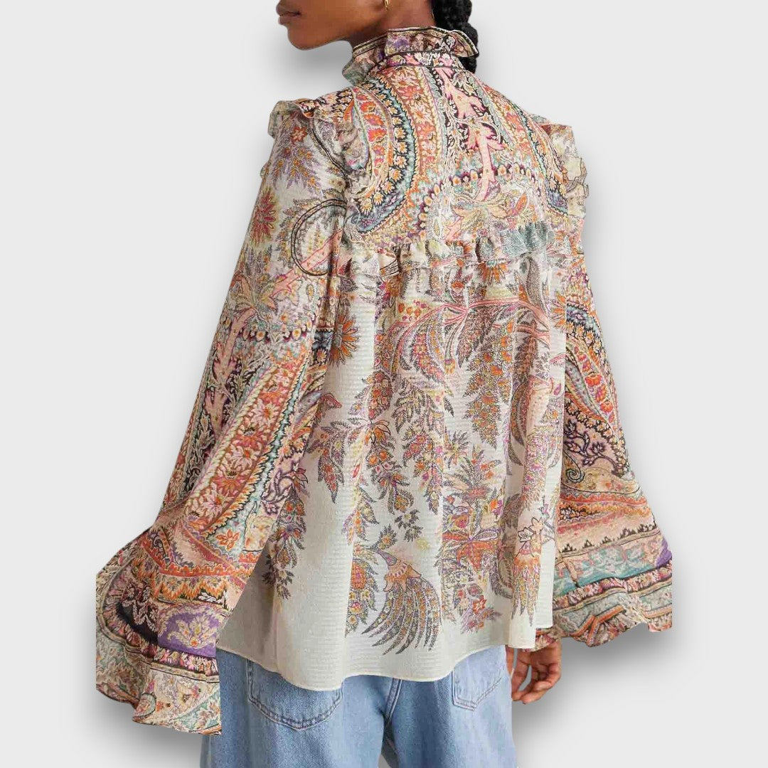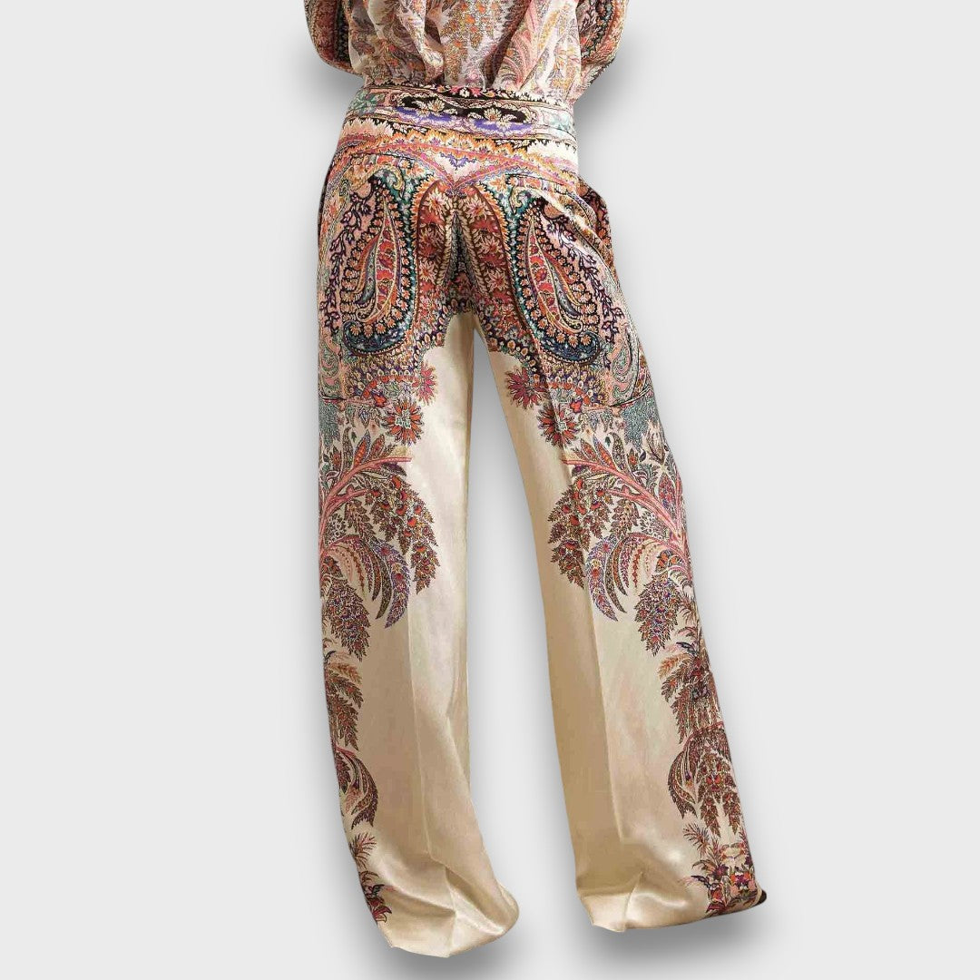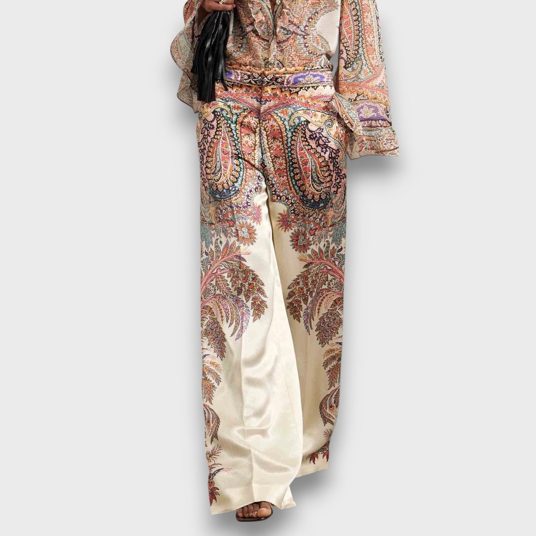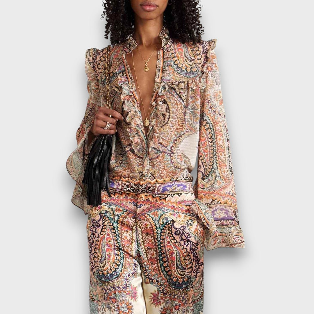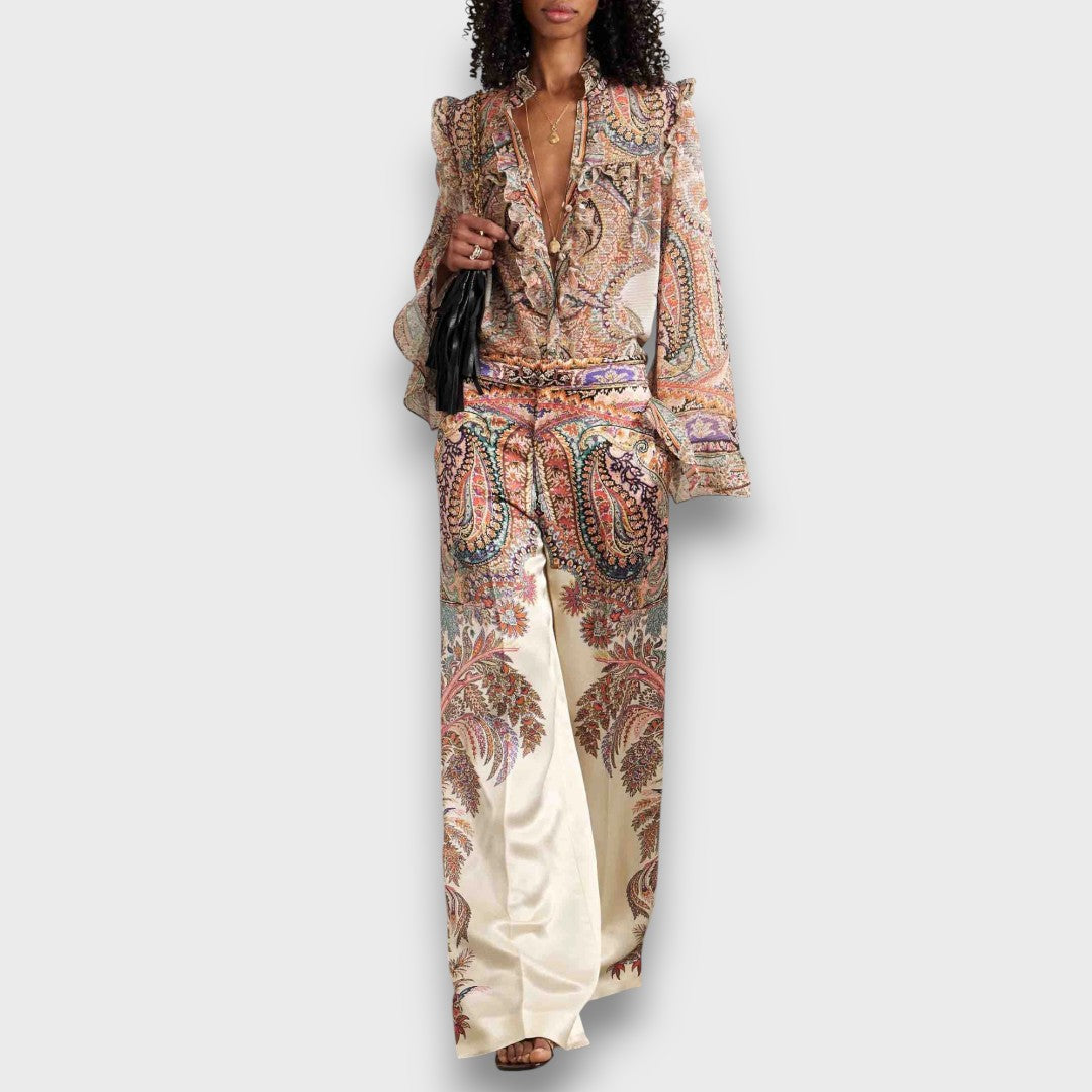 Alvaira ist eine Hommage an kunstvolle Opulenz – ein zweiteiliges Set aus fließendem Stoff mit zartem Glanz und einem majestätischen Paisley-Muster in warmen Tönen. Die Bluse mit Rüschen und tiefem V-Ausschnitt bringt Bewegung und Romantik in jedes Detail, während die weite Hose mit hoher Taille sanft über den Boden gleitet. Ein Ensemble wie aus einer anderen Zeit – und doch wie gemacht für deinen heutigen Auftritt.