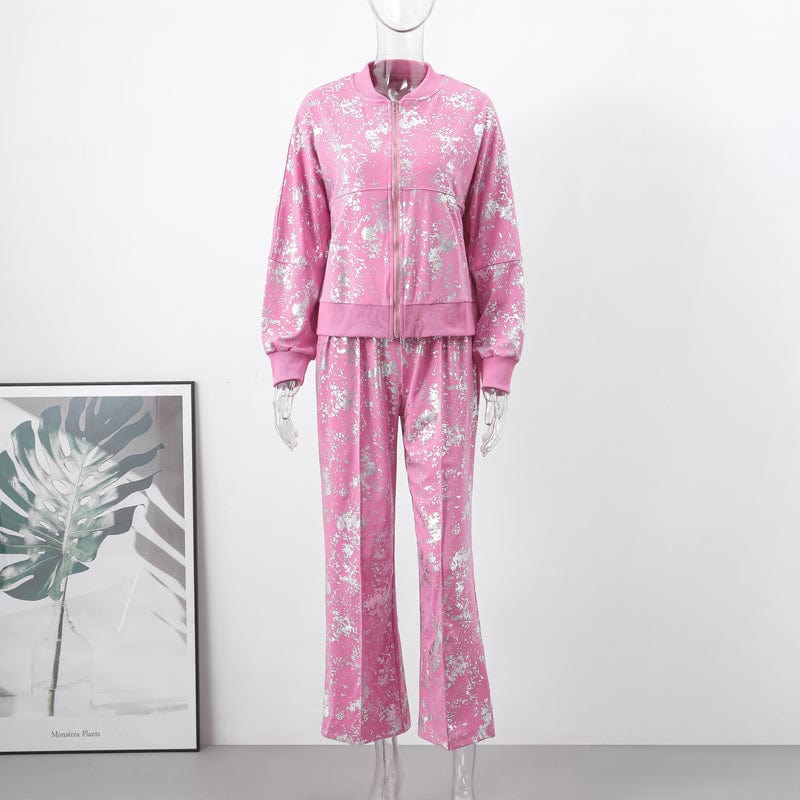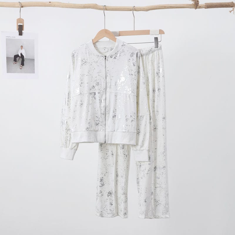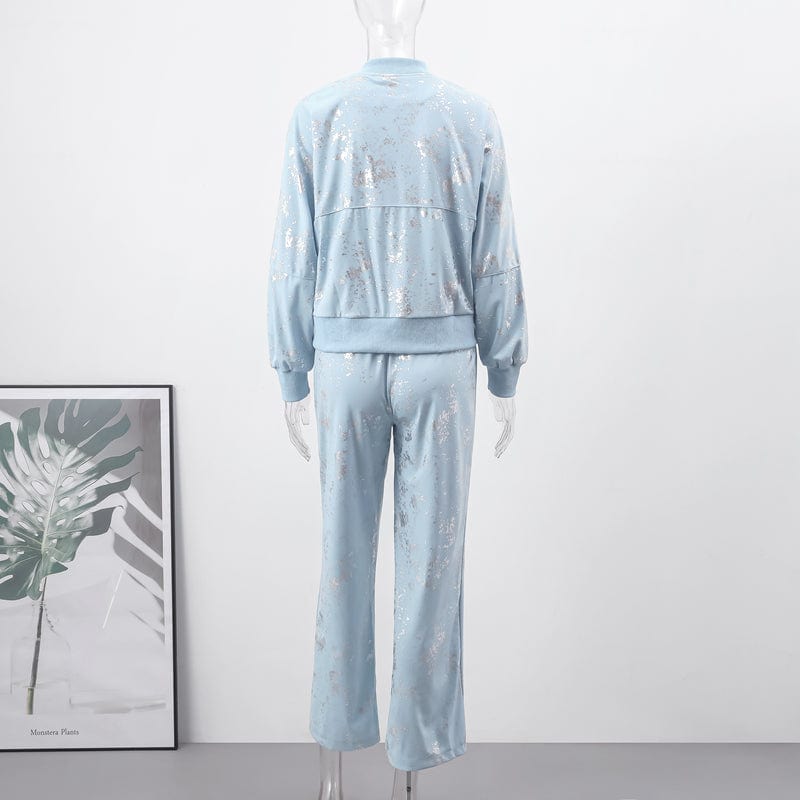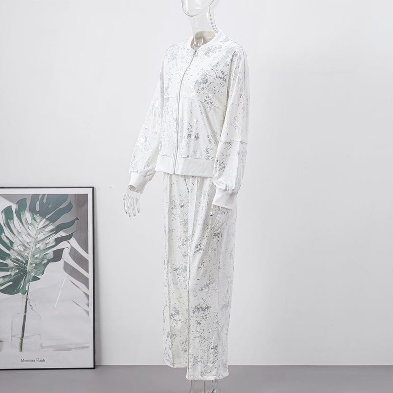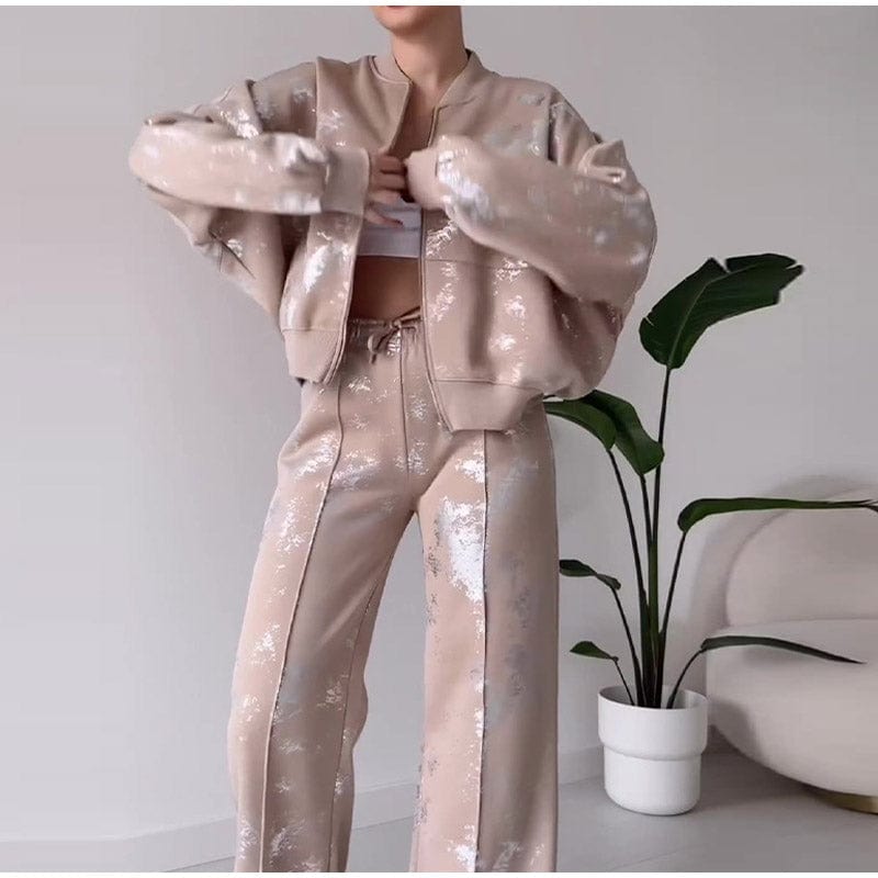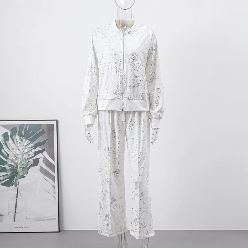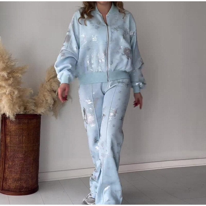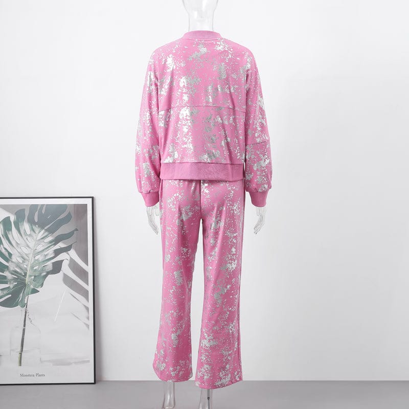 Es zeichnet sich durch ein modernes Paillettenmuster aus, das Ihrem Alltagslook einen Hauch von Glamour verleiht. Das Set besteht aus einem langärmeligen Oberteil und weiten Hosen, die einen entspannten Schnitt bieten. Es besteht aus weichen und hochwertigen Stoffen, die Wärme bieten. Das Sweatshirt verfügt über einen Reißverschluss für vielseitiges Styling, während die Hosen eine einfache Bewegungsfreiheit gewährleisten.