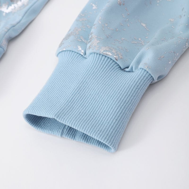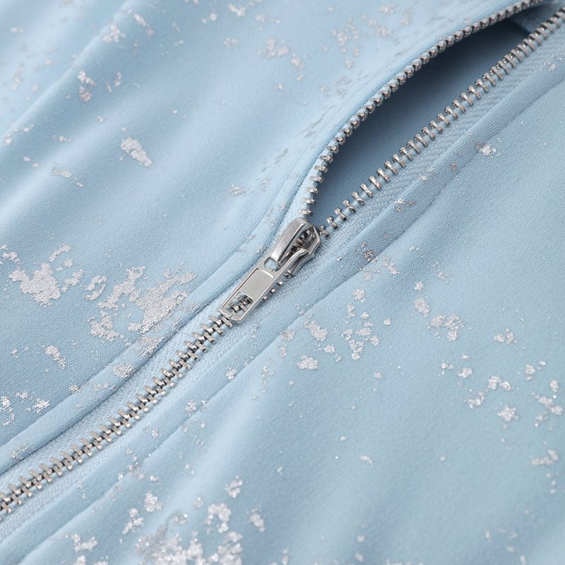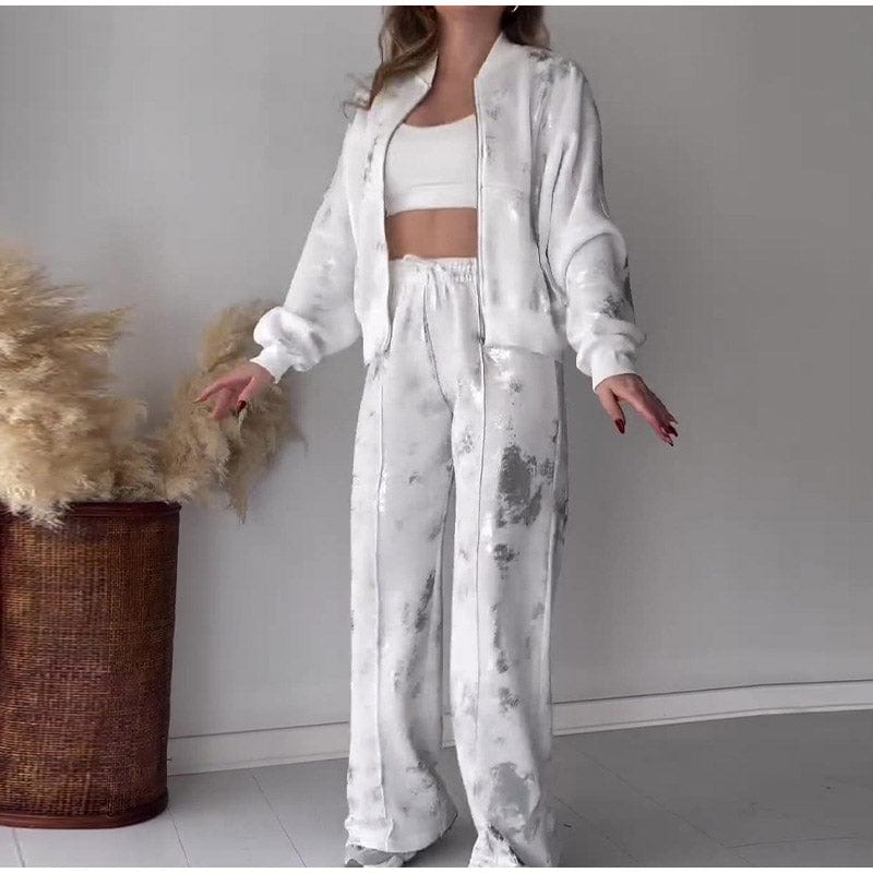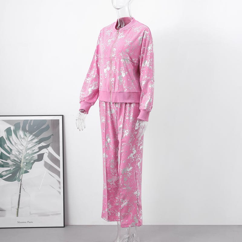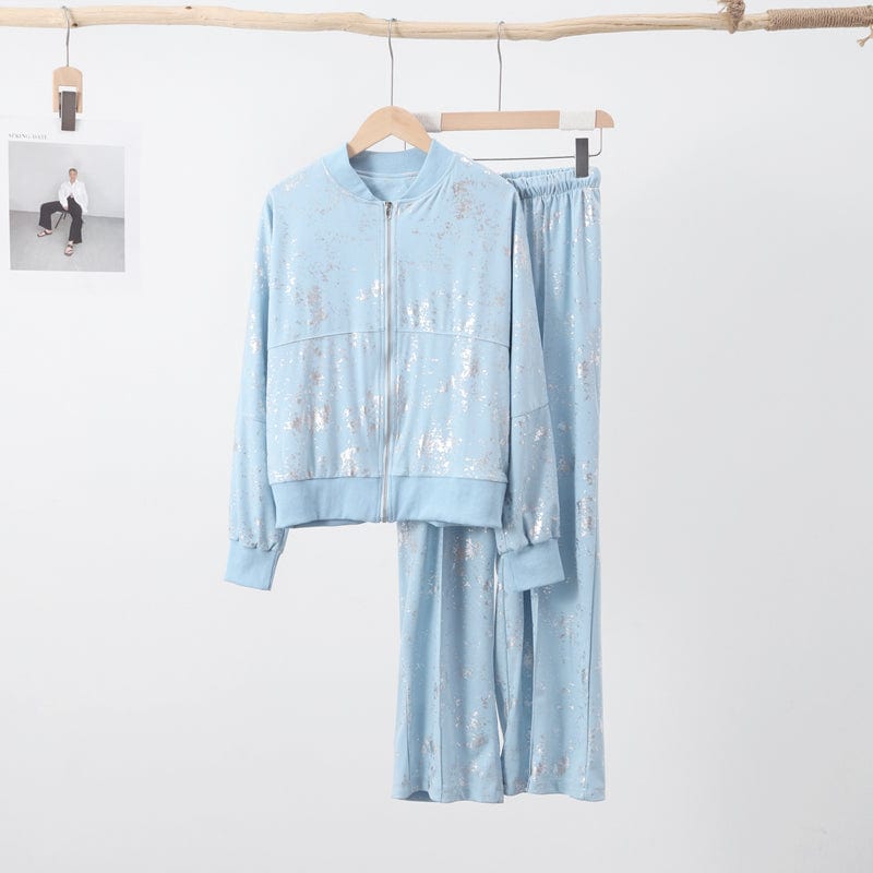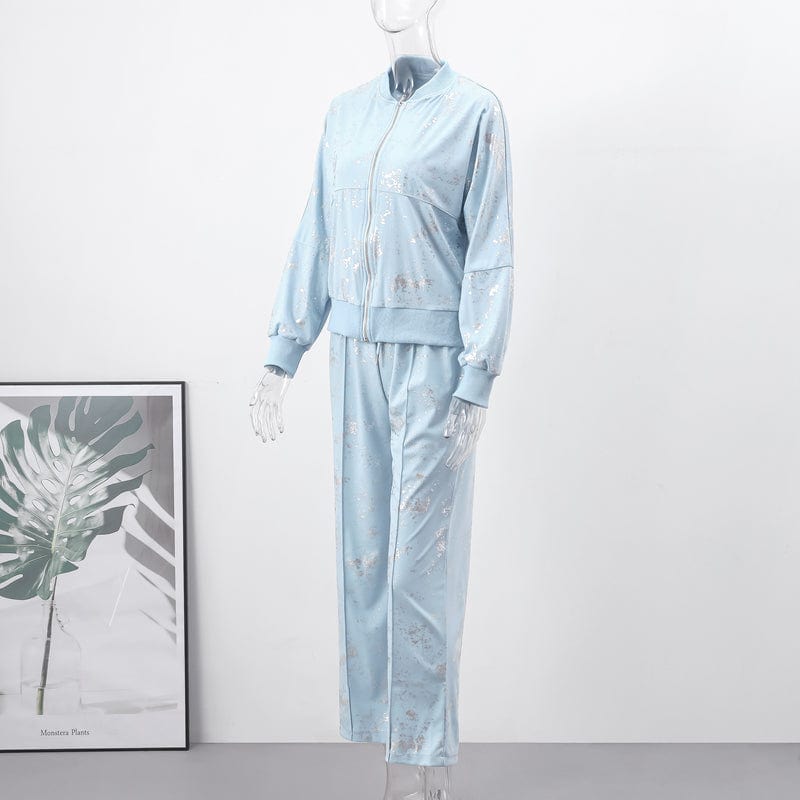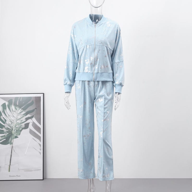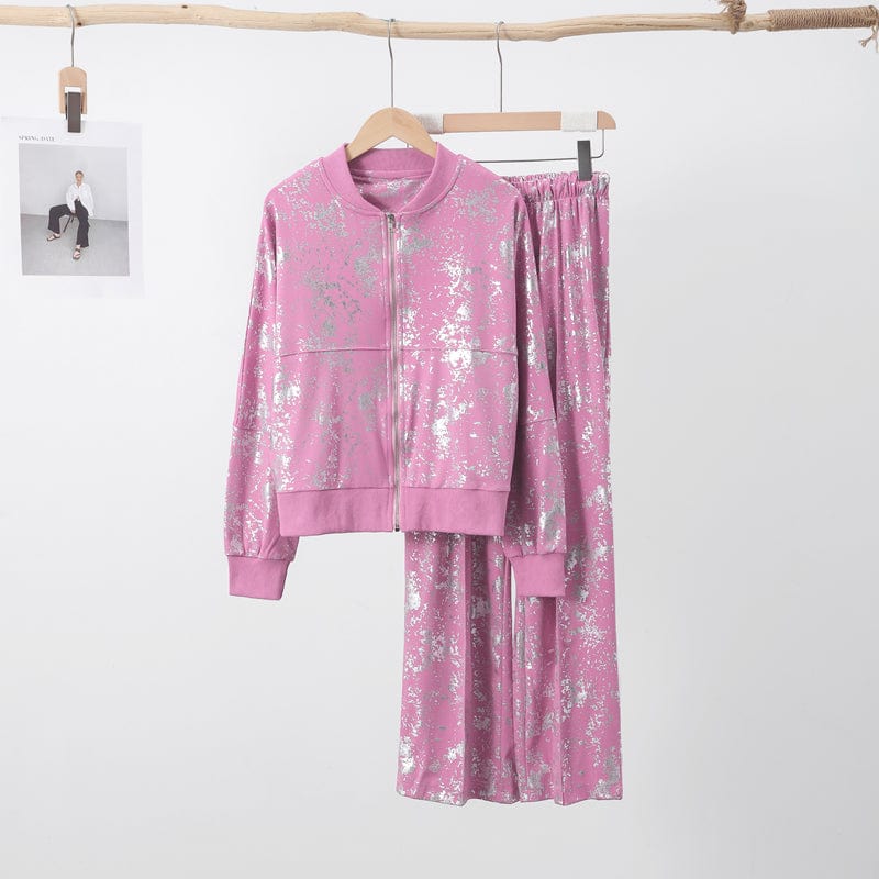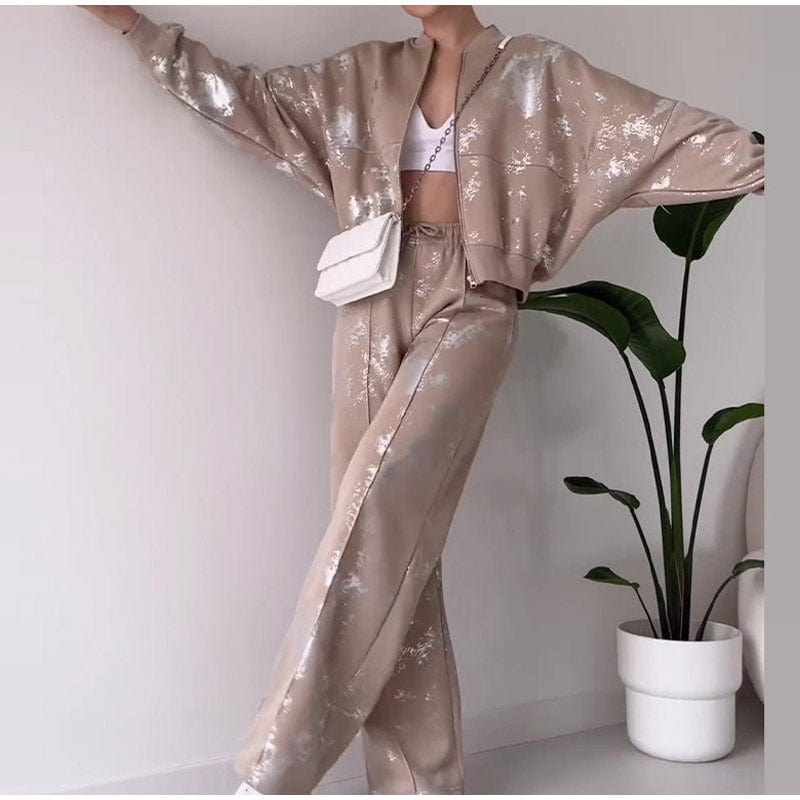 Es zeichnet sich durch ein modernes Paillettenmuster aus, das Ihrem Alltagslook einen Hauch von Glamour verleiht. Das Set besteht aus einem langärmeligen Oberteil und weiten Hosen, die einen entspannten Schnitt bieten. Es besteht aus weichen und hochwertigen Stoffen, die Wärme bieten. Das Sweatshirt verfügt über einen Reißverschluss für vielseitiges Styling, während die Hosen eine einfache Bewegungsfreiheit gewährleisten.