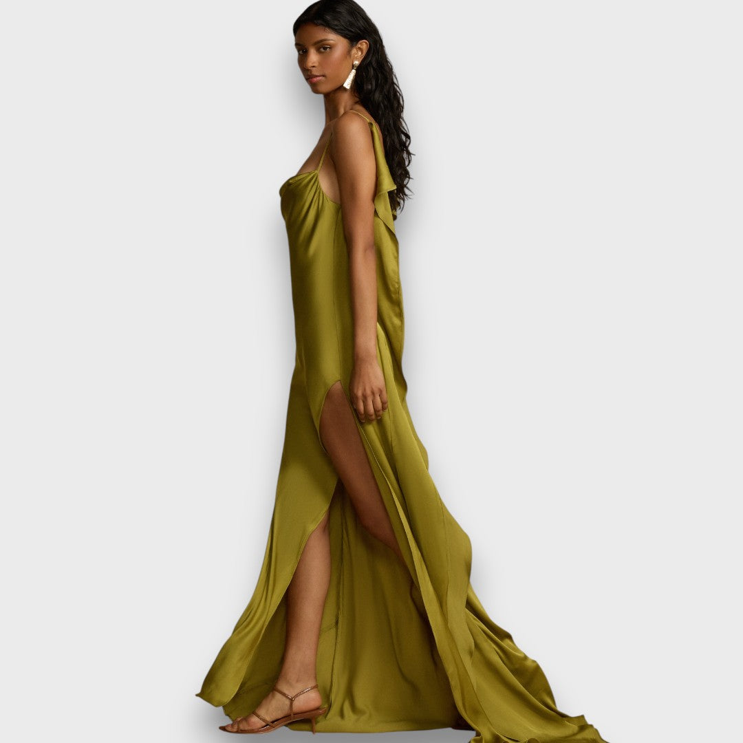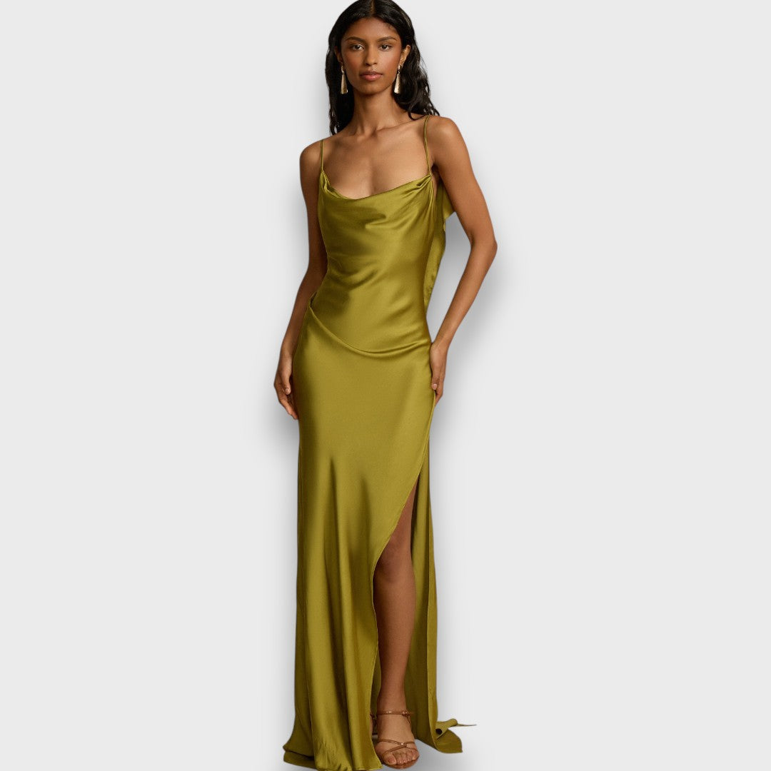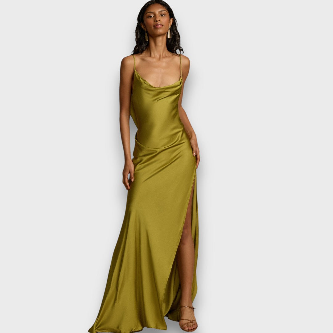 Aurelia ist ein Kleid, das geschaffen wurde, um im Mittelpunkt zu stehen. Der fließende Schnitt in satiniertem Pistazienton umhüllt die Figur wie flüssiges Licht – feminin, sinnlich, kraftvoll. Der weiche Wasserfallausschnitt und die filigranen Spaghettiträger sorgen für eine subtile Balance, während der hohe Beinschlitz den Look mit kühner Eleganz auflädt. Der tiefe Rückenausschnitt mit fließender Drapierung rundet den Effekt mit einem Hauch von Skulpturalität ab.