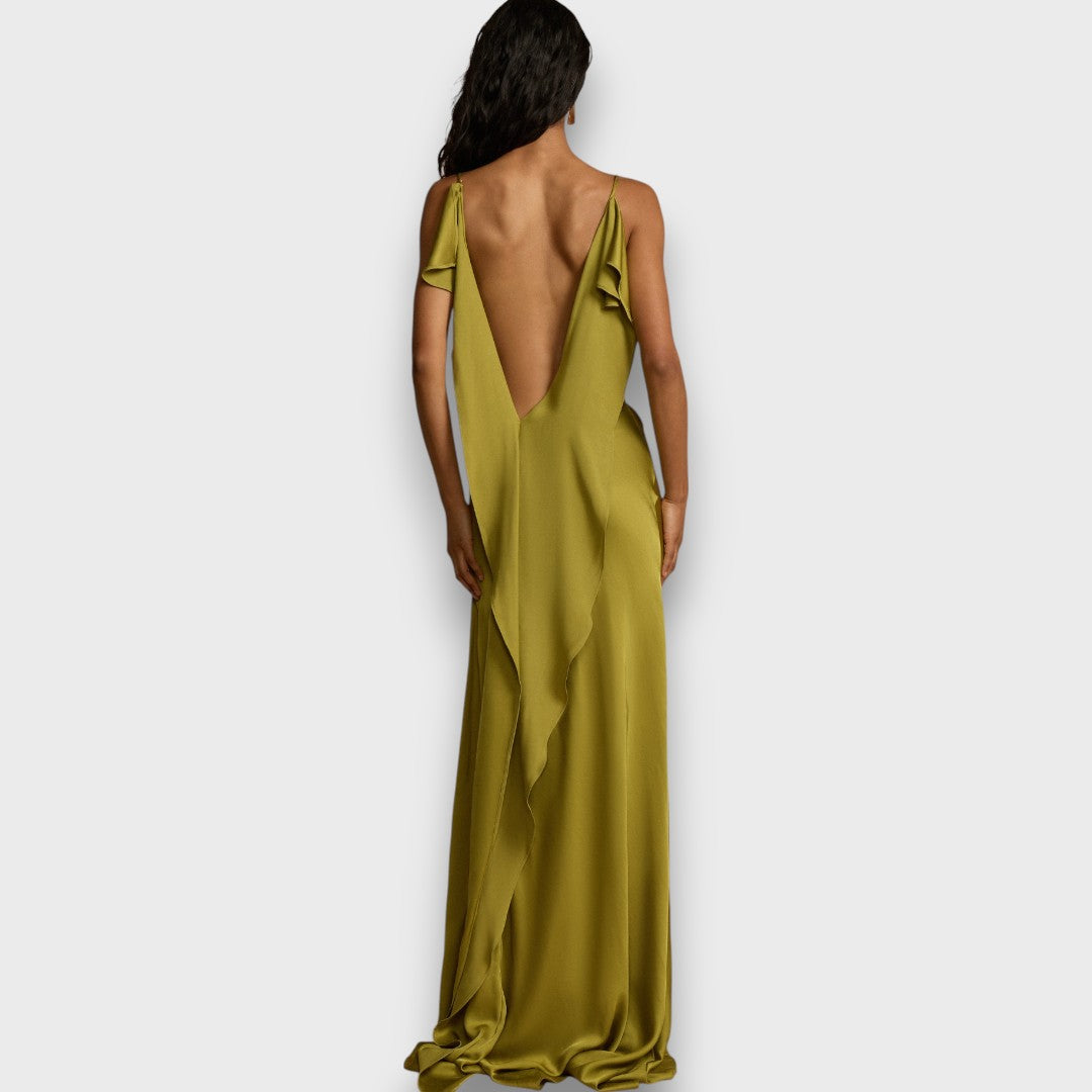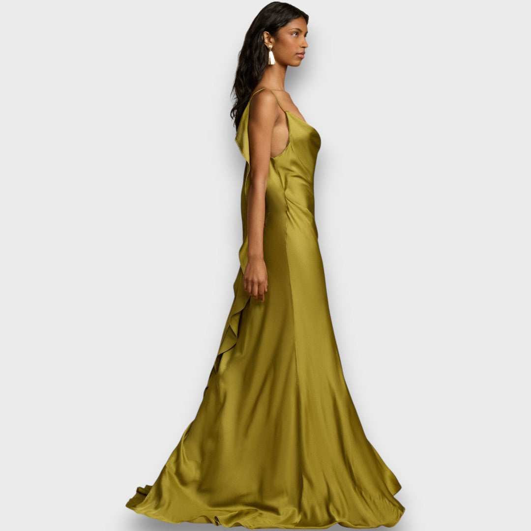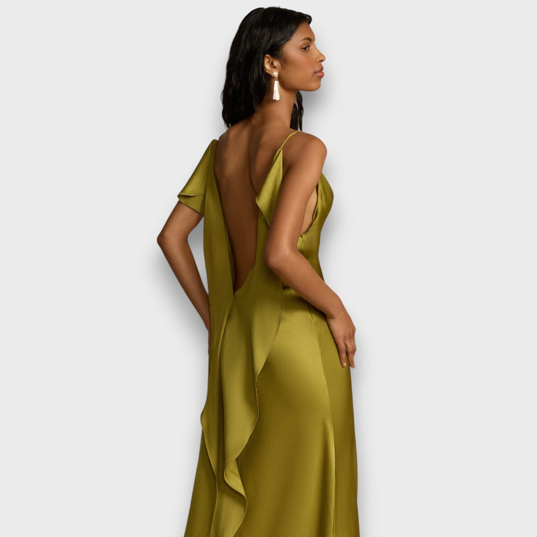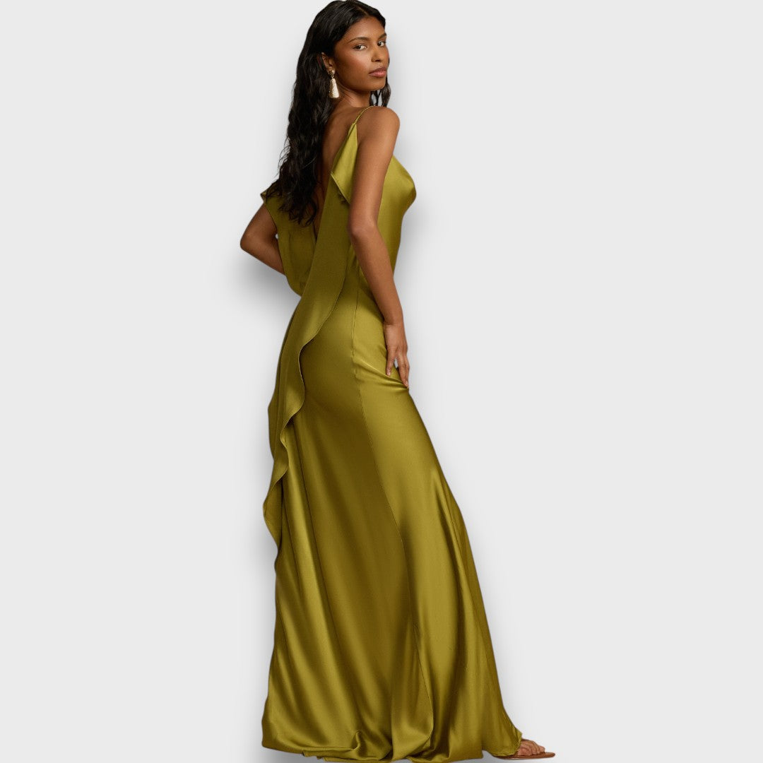 Aurelia ist ein Kleid, das geschaffen wurde, um im Mittelpunkt zu stehen. Der fließende Schnitt in satiniertem Pistazienton umhüllt die Figur wie flüssiges Licht – feminin, sinnlich, kraftvoll. Der weiche Wasserfallausschnitt und die filigranen Spaghettiträger sorgen für eine subtile Balance, während der hohe Beinschlitz den Look mit kühner Eleganz auflädt. Der tiefe Rückenausschnitt mit fließender Drapierung rundet den Effekt mit einem Hauch von Skulpturalität ab.