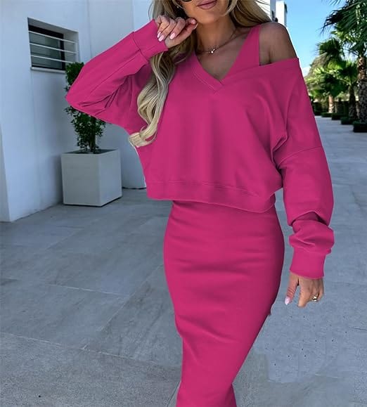 These 2-piece outfits are combined with a hoodie and a knit long dress. The V-neck crop top can highlight your neck and the slit sweater dress fit your beautiful figure. It is made of high-quality material, soft and comfortable, skin-friendly, and lightweight. Thanks to its unique design, this set will always be on top. It is the perfect choice for women who value style, comfort, and functionality.