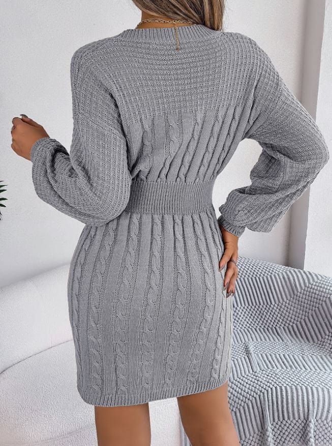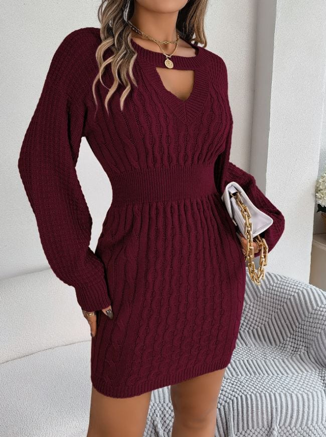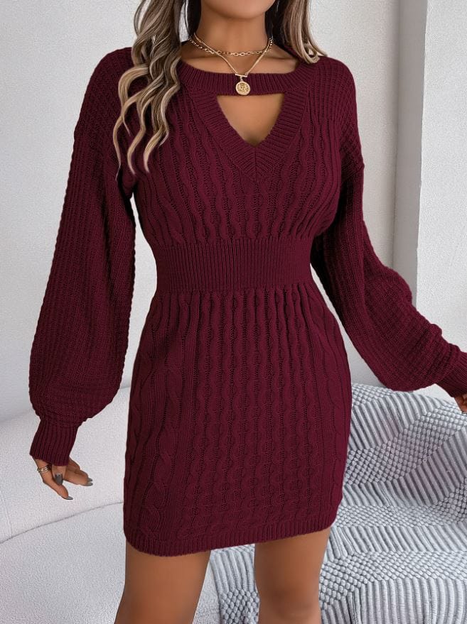 Es ist aus feinstem und weichem Strickstoff gefertigt, der Ihnen Komfort bietet und Ihre Silhouette sanft umarmt. Der Stoff zeichnet sich durch eine luxuriöse Textur aus, die nicht nur Luxus zeigt, sondern auch an kalten Tagen unvergleichliche Wärme und Gemütlichkeit gewährleistet. Es verfügt über einen gerippten Rundhalsausschnitt und Ärmelbündchen, einen runden Ausschnitt und ein ausgefallenes, ausgeschnittenes Laternenärmel-Design.