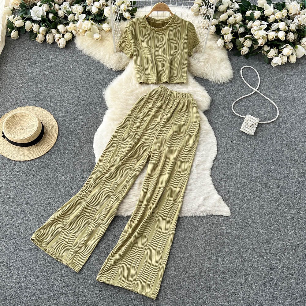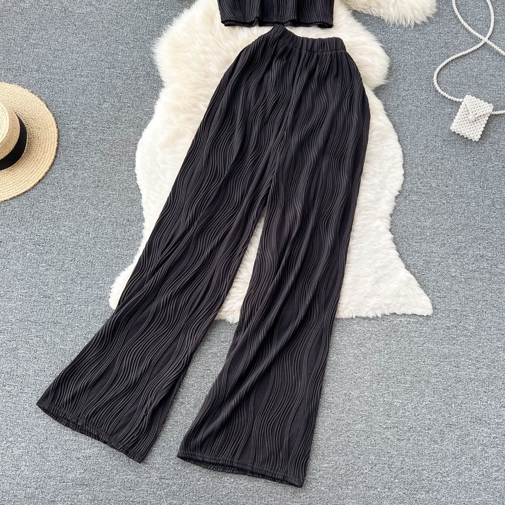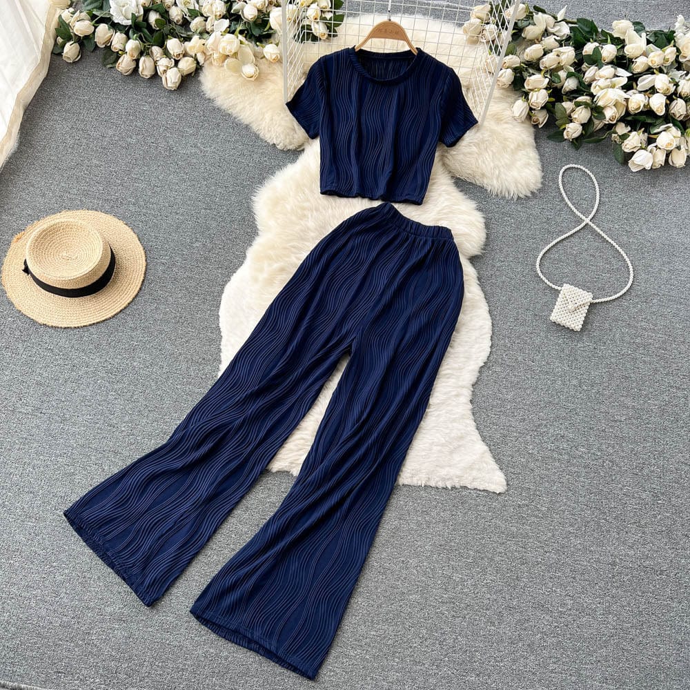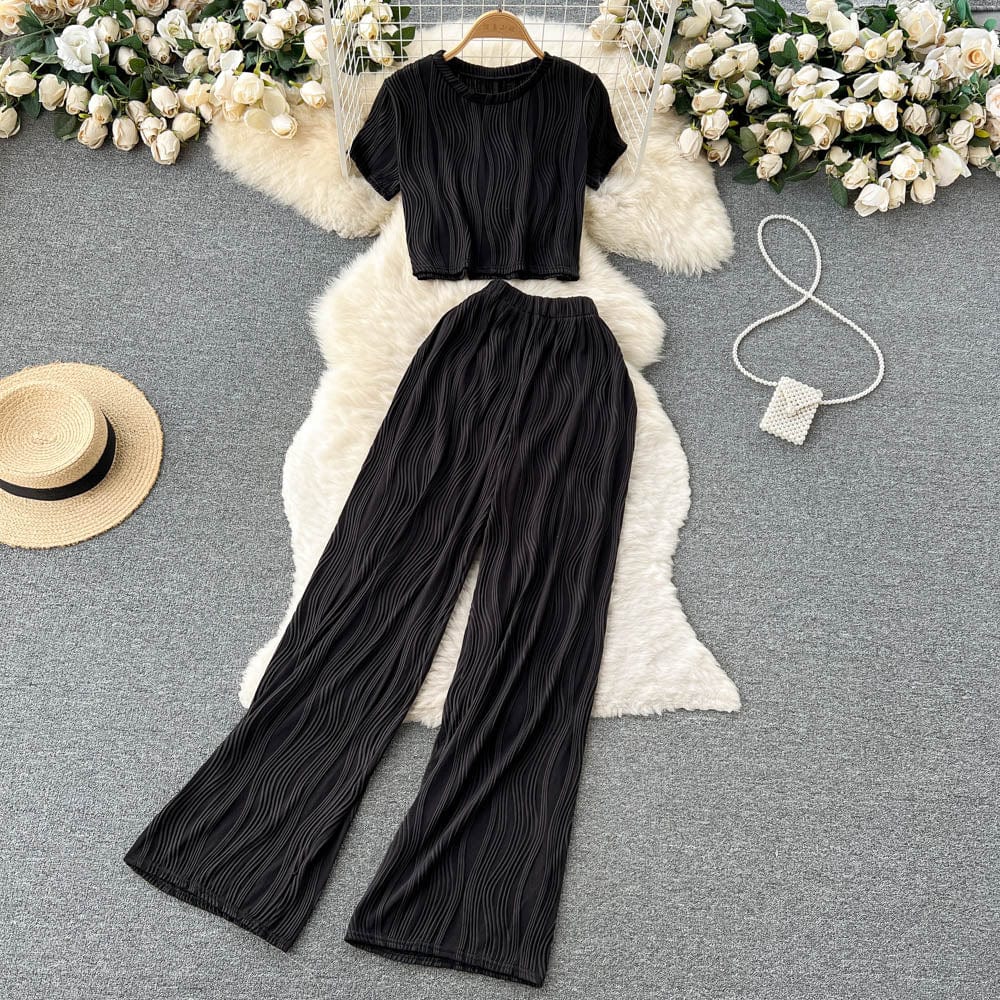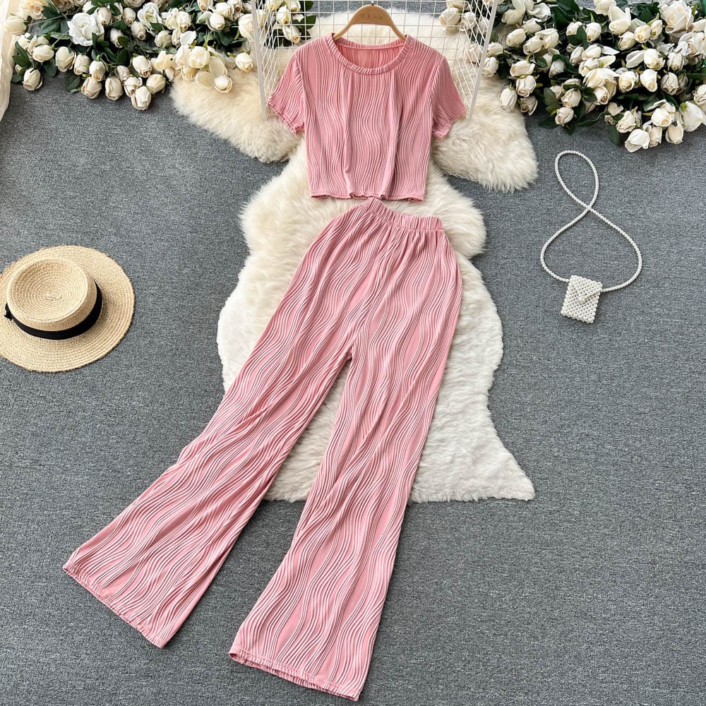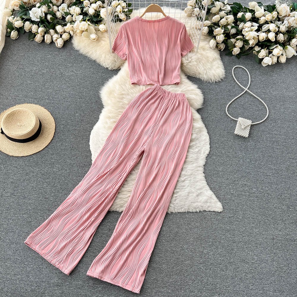 Es handelt sich um ein Set aus einem lockeren T-Shirt mit Rundhalsausschnitt und weiten langen Hosen. Es bietet eine entspannte Passform und atmungsaktiven Stoff, der den ganzen Tag über Komfort unter der Sonne gewährleistet. Das minimalistische Design passt nahtlos zu den weiten langen Hosen, die mit einer fließenden Silhouette jede Figur schmeicheln.
