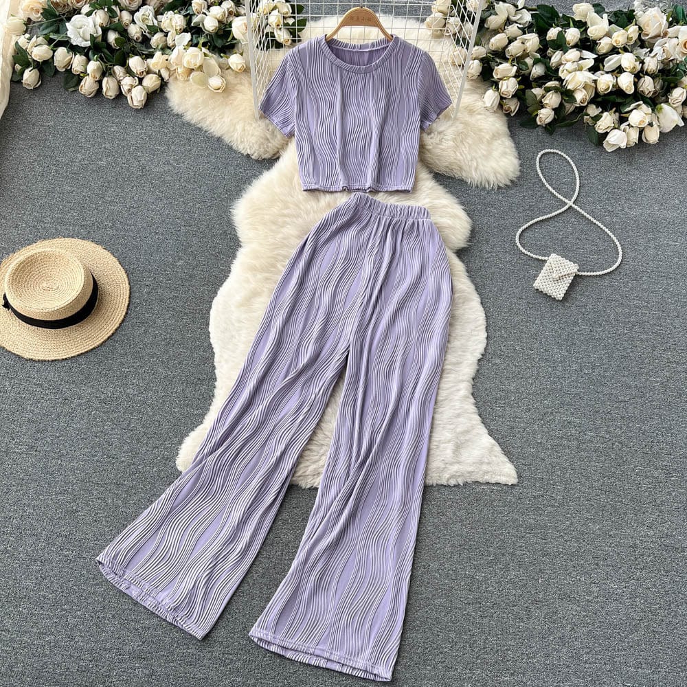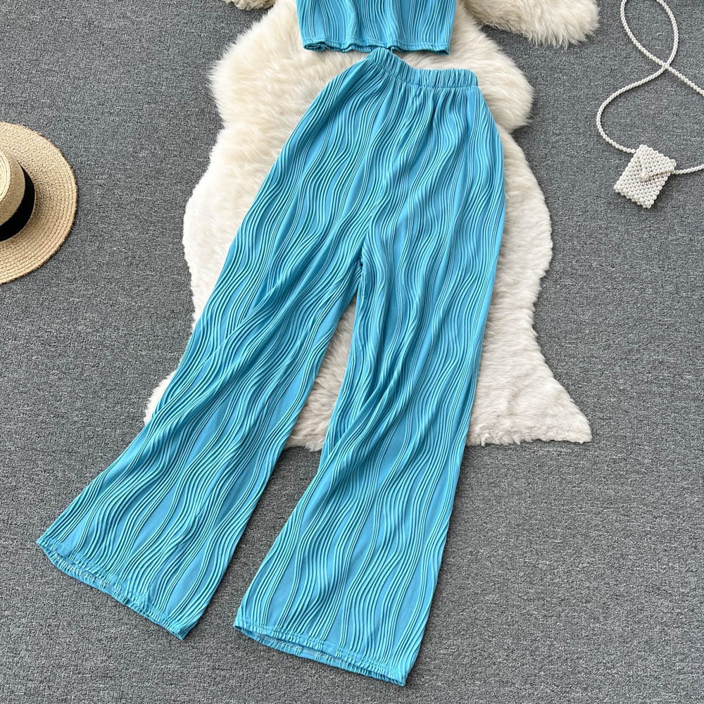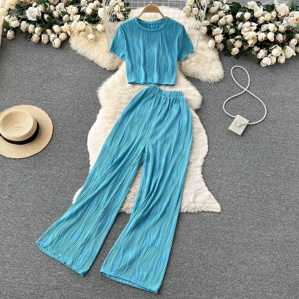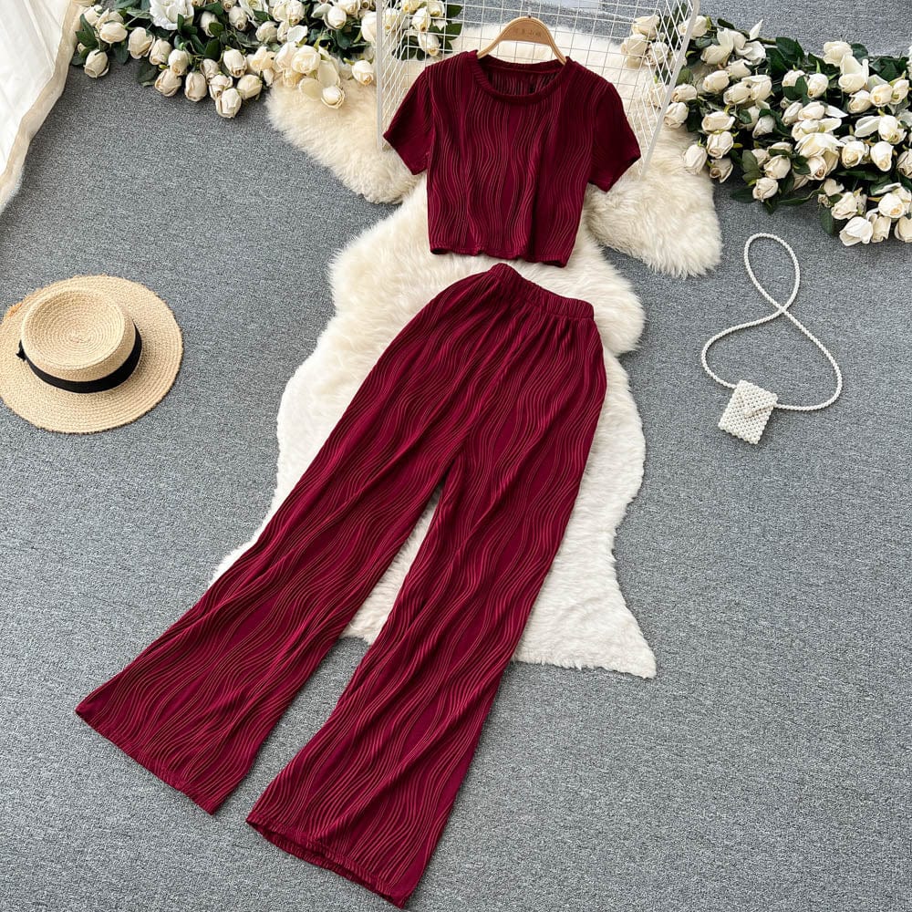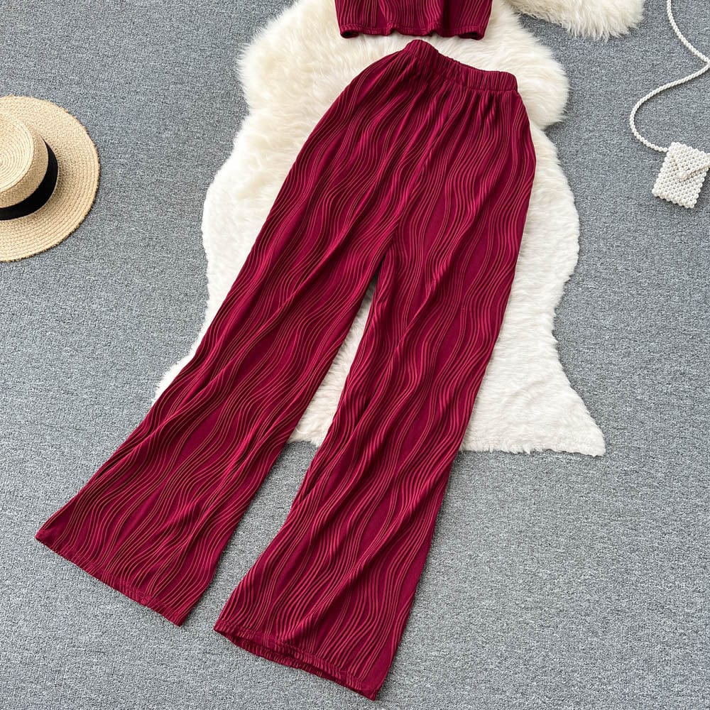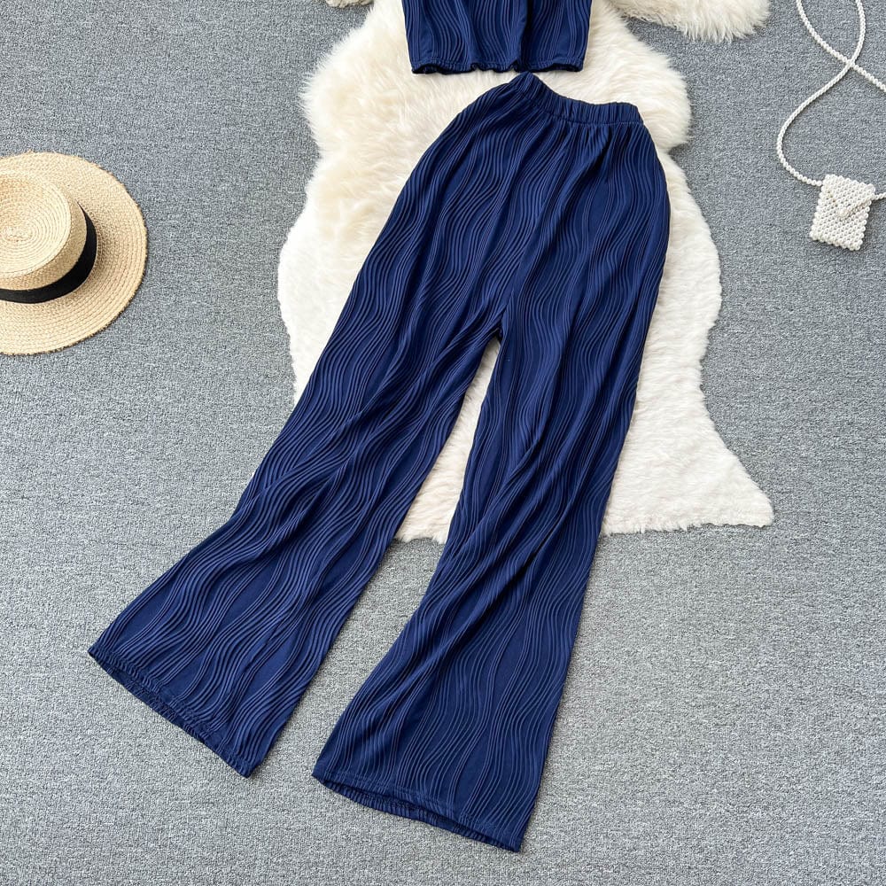 Es handelt sich um ein Set aus einem lockeren T-Shirt mit Rundhalsausschnitt und weiten langen Hosen. Es bietet eine entspannte Passform und atmungsaktiven Stoff, der den ganzen Tag über Komfort unter der Sonne gewährleistet. Das minimalistische Design passt nahtlos zu den weiten langen Hosen, die mit einer fließenden Silhouette jede Figur schmeicheln.